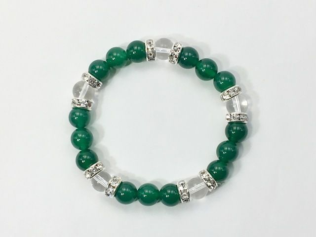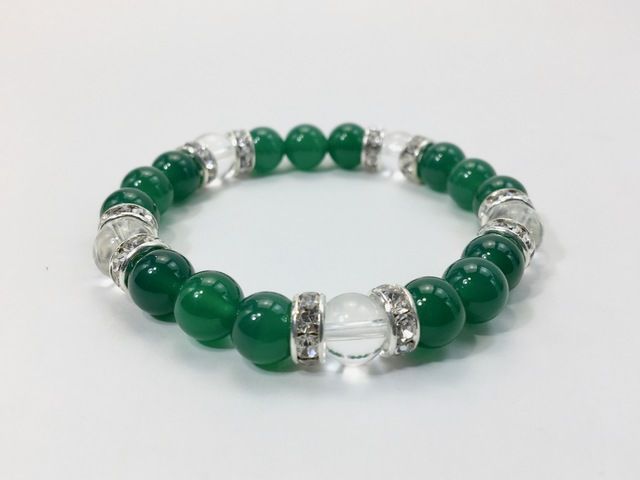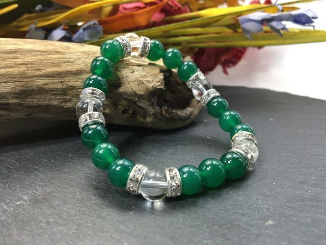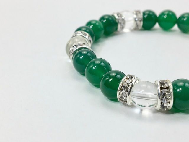 こちらは、8mm玉の緑瑪瑙と水晶を使ったパワーストーンブレスレットです。シンプルなデザインでどんなコーディネートにも合わせやすいデザインに仕上げています。サイズは内周約15cmです。気になる方は是非この機会にどうぞ。