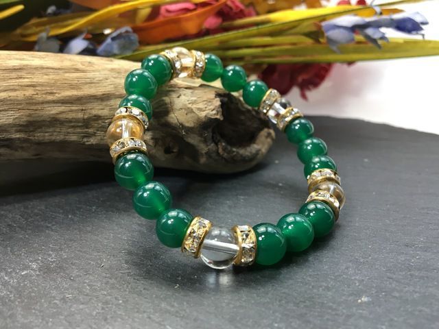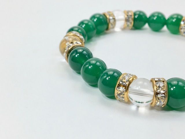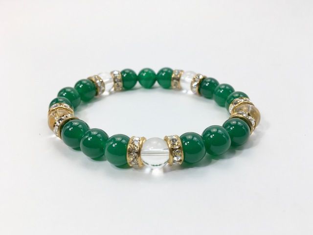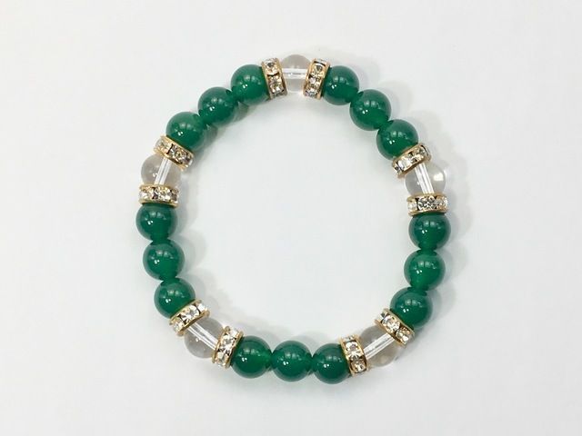こちらは、8mm玉の緑瑪瑙と水晶を使ったパワーストーンブレスレットです。シンプルなデザインでどんなコーディネートにも合わせやすいデザインに仕上げています。サイズは内周約15cmです。気になる方は是非この機会にどうぞ。
