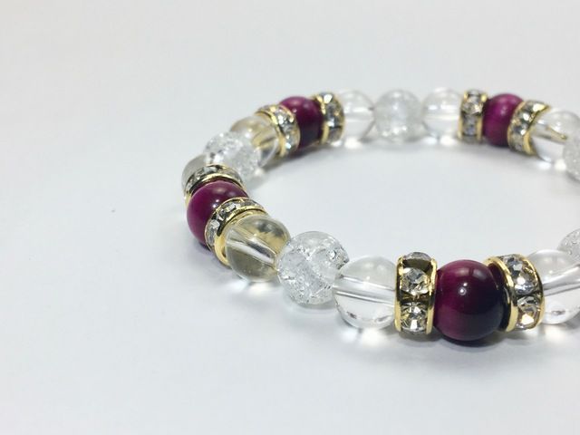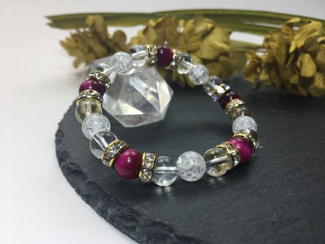 こちらは、8mm玉のピンクタイガーアイと水晶、クラック水晶を組み合わせたパワーストーンブレスレットです。今回は五芒星デザインで石を配置しております。五芒星とは、陰陽道の基本概念となった陰陽五行説、木・火・土・金・水の5つの元素の働きの相克を表したものであり、五芒星は厄除・開運を願うデザインと重宝されているデザインです。サイズは内周約15cmです。気になる方は是非この機会にどうぞ。