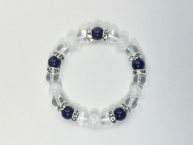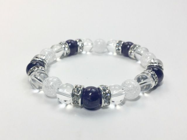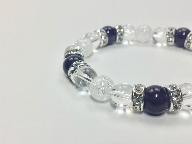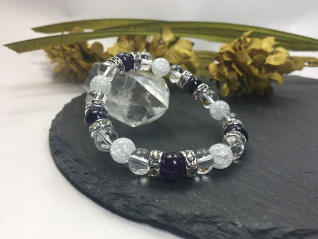 こちらは、8mm玉のアメジストと水晶、クラック水晶を組み合わせたパワーストーンブレスレットです。今回は五芒星デザインで石を配置しております。五芒星とは、陰陽道の基本概念となった陰陽五行説、木・火・土・金・水の5つの元素の働きの相克を表したものであり、五芒星は厄除・開運を願うデザインと重宝されているデザインです。サイズは内周約15cmです。気になる方は是非この機会にどうぞ。