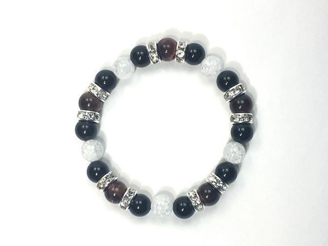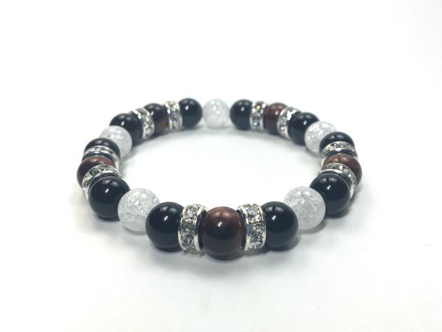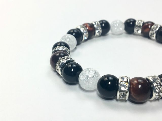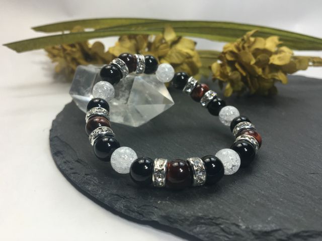 こちらは、8mm玉のレッドタイガーアイとオニキス、クラック水晶を組み合わせたパワーストーンブレスレットです。今回は五芒星デザインで石を配置しております。五芒星とは、陰陽道の基本概念となった陰陽五行説、木・火・土・金・水の5つの元素の働きの相克を表したものであり、五芒星は厄除・開運を願うデザインと重宝されているデザインです。サイズは内周約15cmです。気になる方は是非この機会にどうぞ。