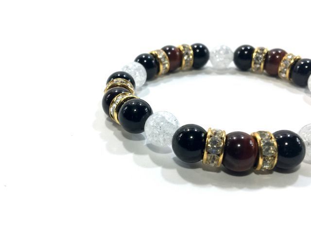 こちらは、8mm玉のレッドタイガーアイとオニキス、クラック水晶を組み合わせたパワーストーンブレスレットです。今回は五芒星デザインで石を配置しております。五芒星とは、陰陽道の基本概念となった陰陽五行説、木・火・土・金・水の5つの元素の働きの相克を表したものであり、五芒星は厄除・開運を願うデザインと重宝されているデザインです。サイズは内周約15cmです。気になる方は是非この機会にどうぞ。