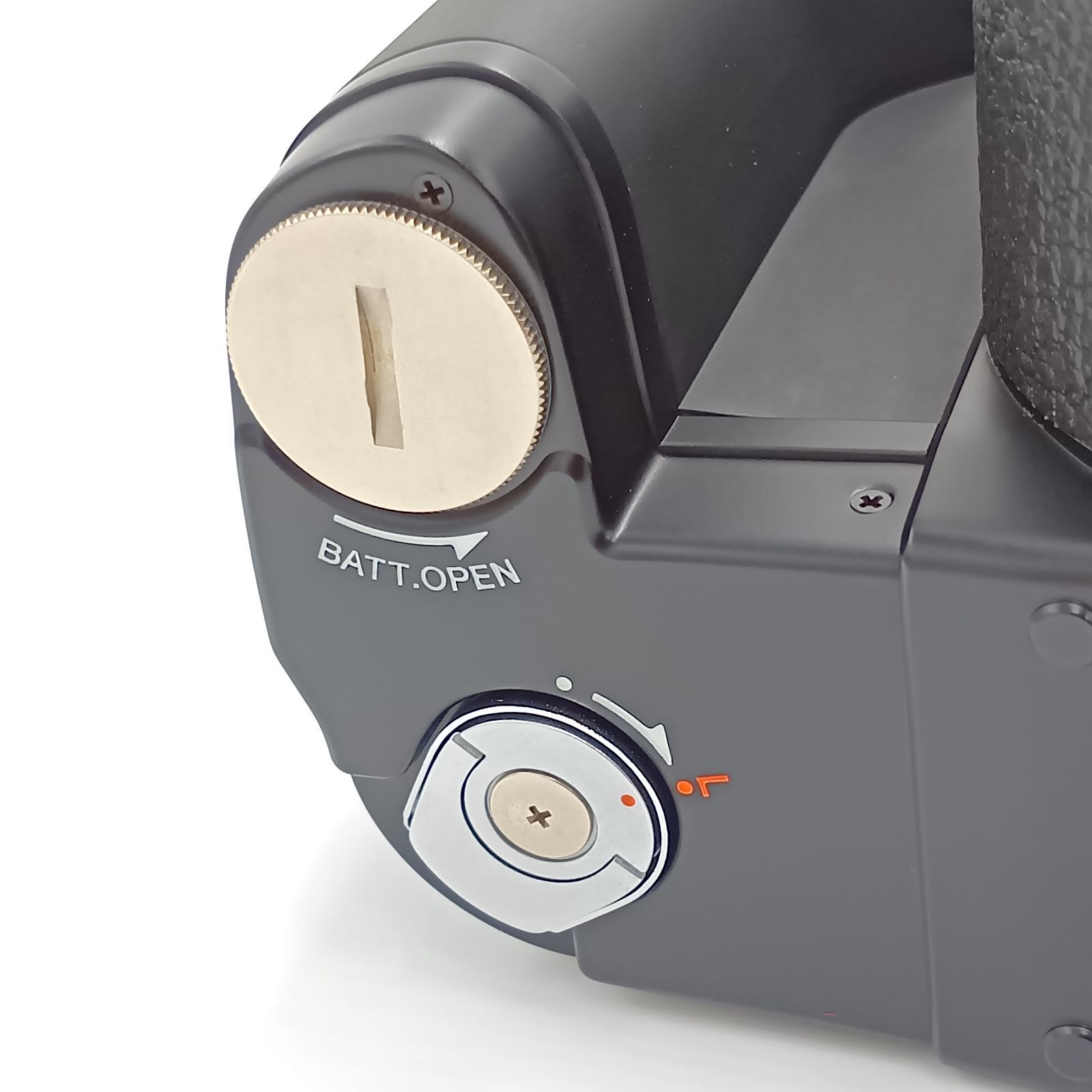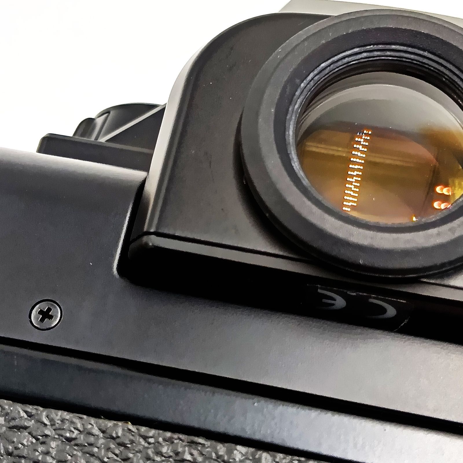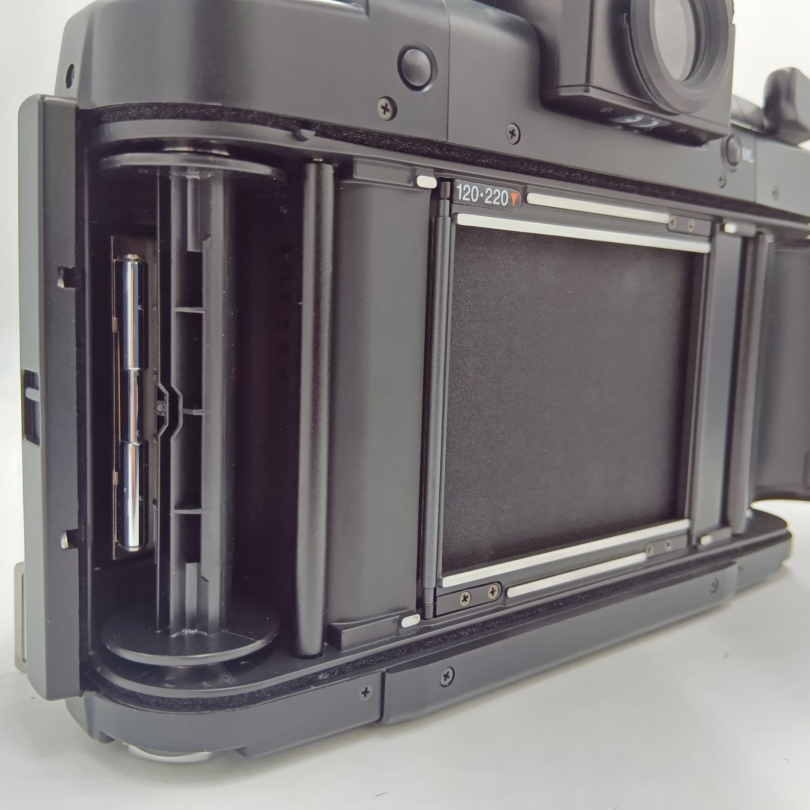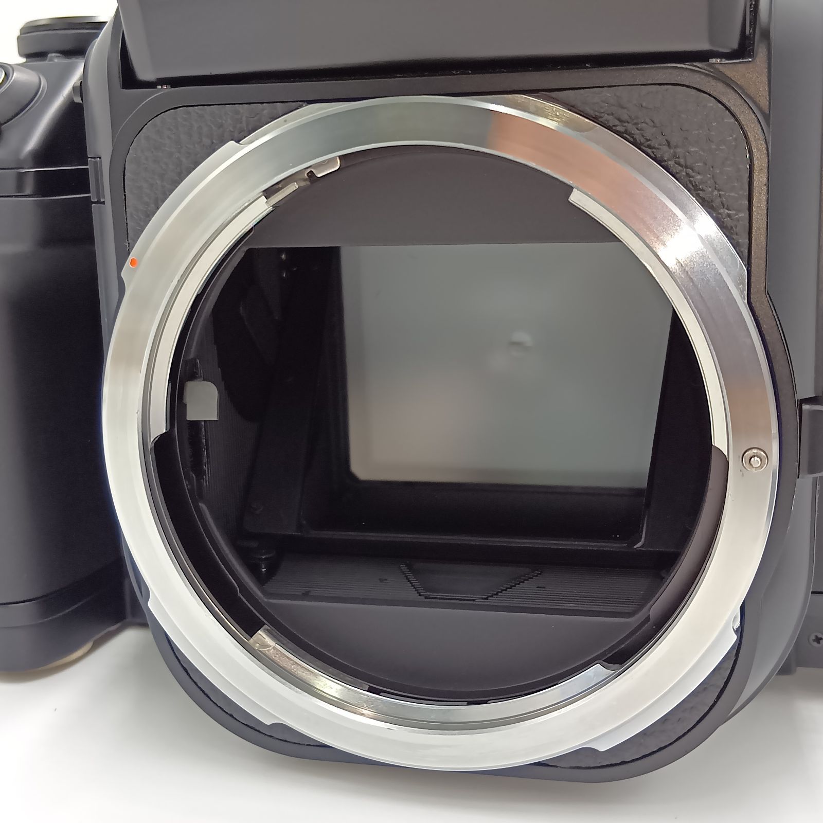 ・視野率約90%・倍率約0.75倍の明るいファインダーにAE表示・バーグラフ表示を備え、露出補正±3EV(1/3ステップ)にも対応するなど、銀塩中判としては機能性の高いボディです。