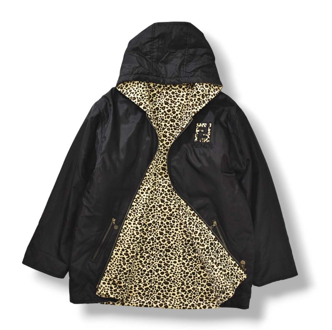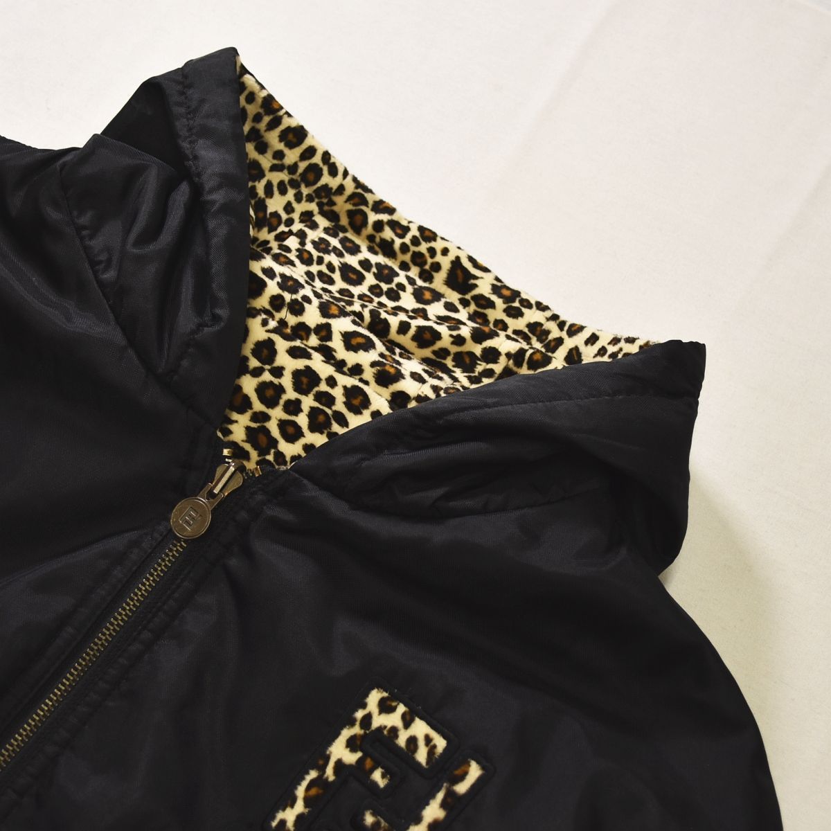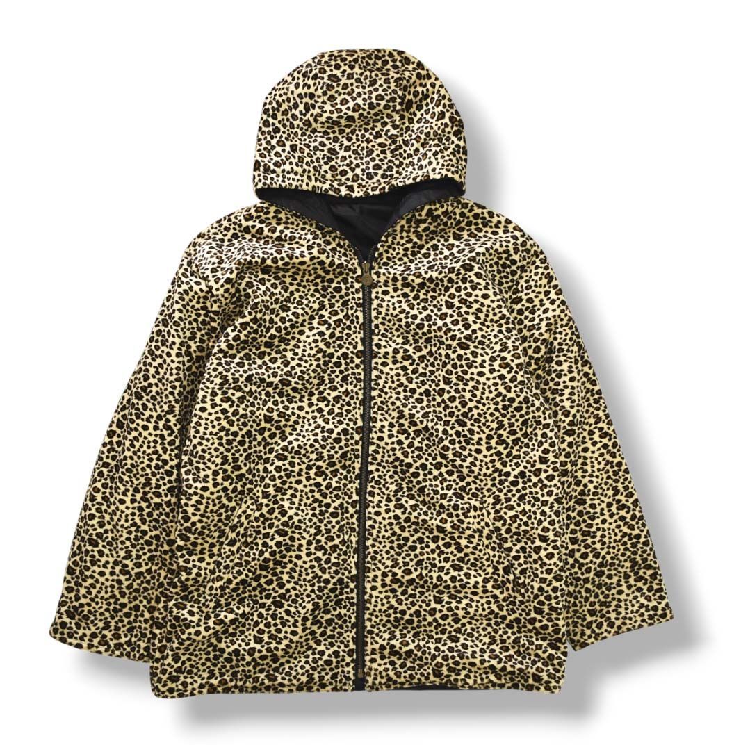 表面はシンプルなナイロンシェルにブランドロゴ、裏面は全面レオパード柄のファー調仕上げという、両A面のような存在感を持つ一着です。
