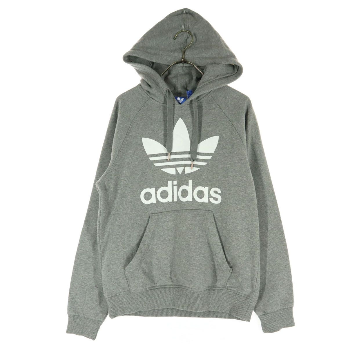 adidas アディダス 裏起毛 プリント 長袖 パーカー S グレー トレフォイルロゴ レディース