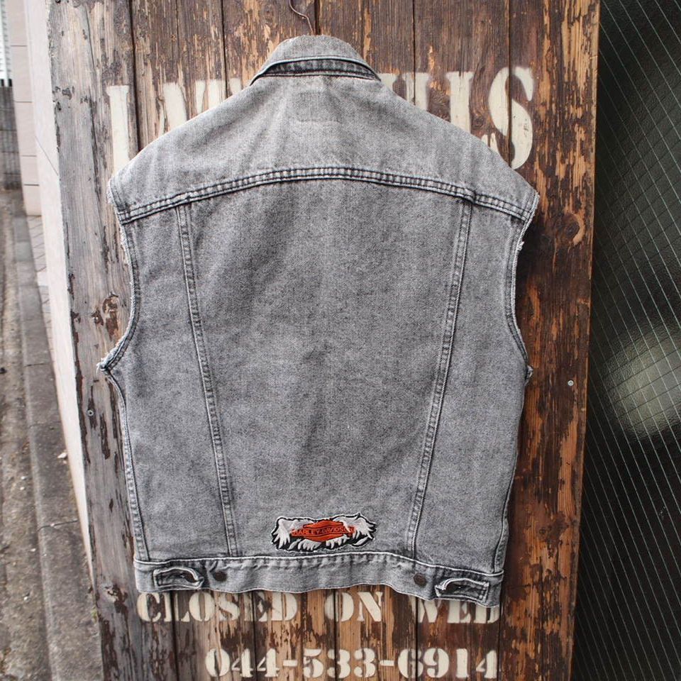 ■商品説明:リーバイスの70506、ポケット付きのゆったりとしたサイズ感のデニムベストです。肩幅や身幅がワイドなのが特徴的で丈も短く、丸みを帯びたシルエットとなっており、今のトレンドで着用できるサイズ感で着古されたいい風合いの出た一着です。1980年末頃のオールドモデル。ビンテージのハーレーのワッペンが付いています。