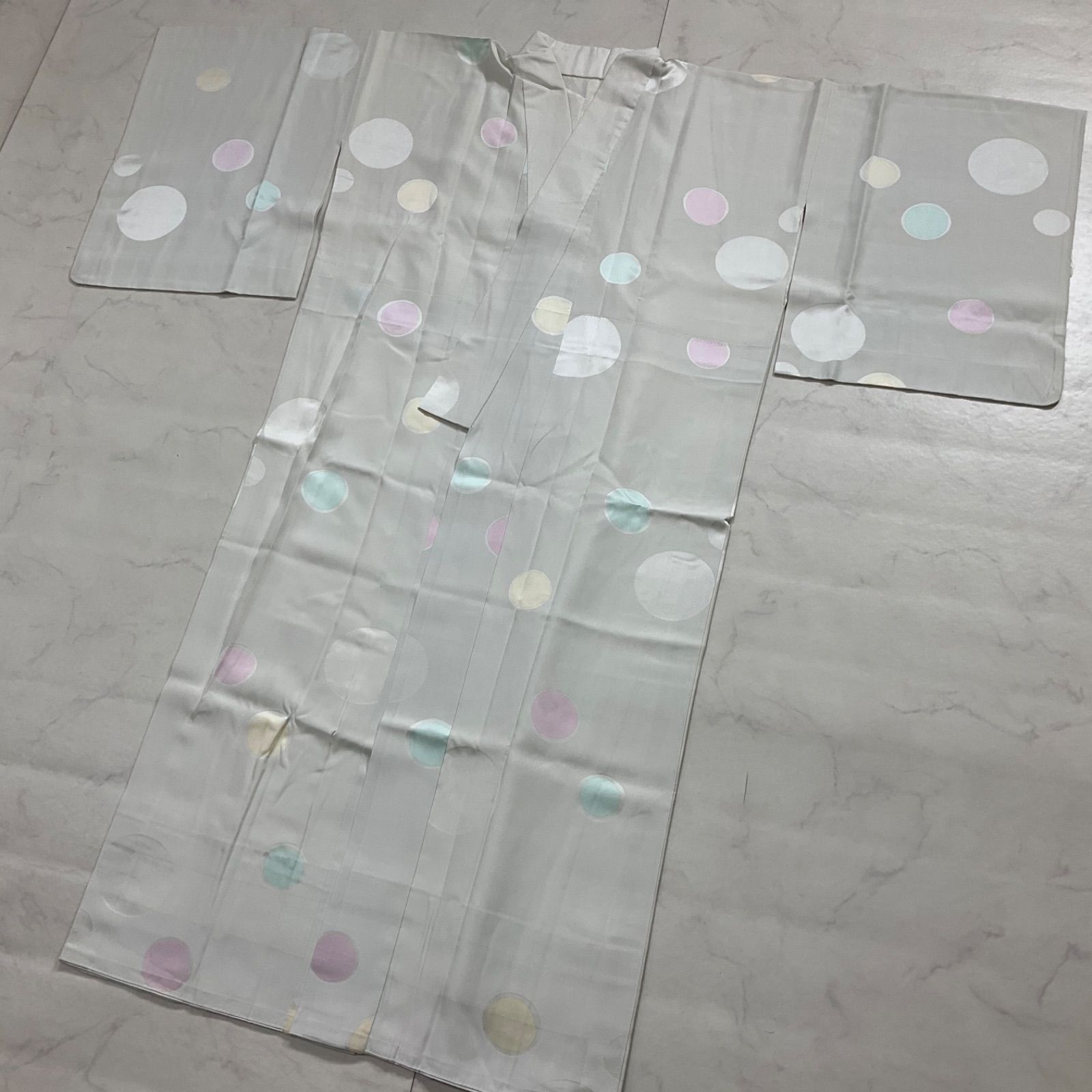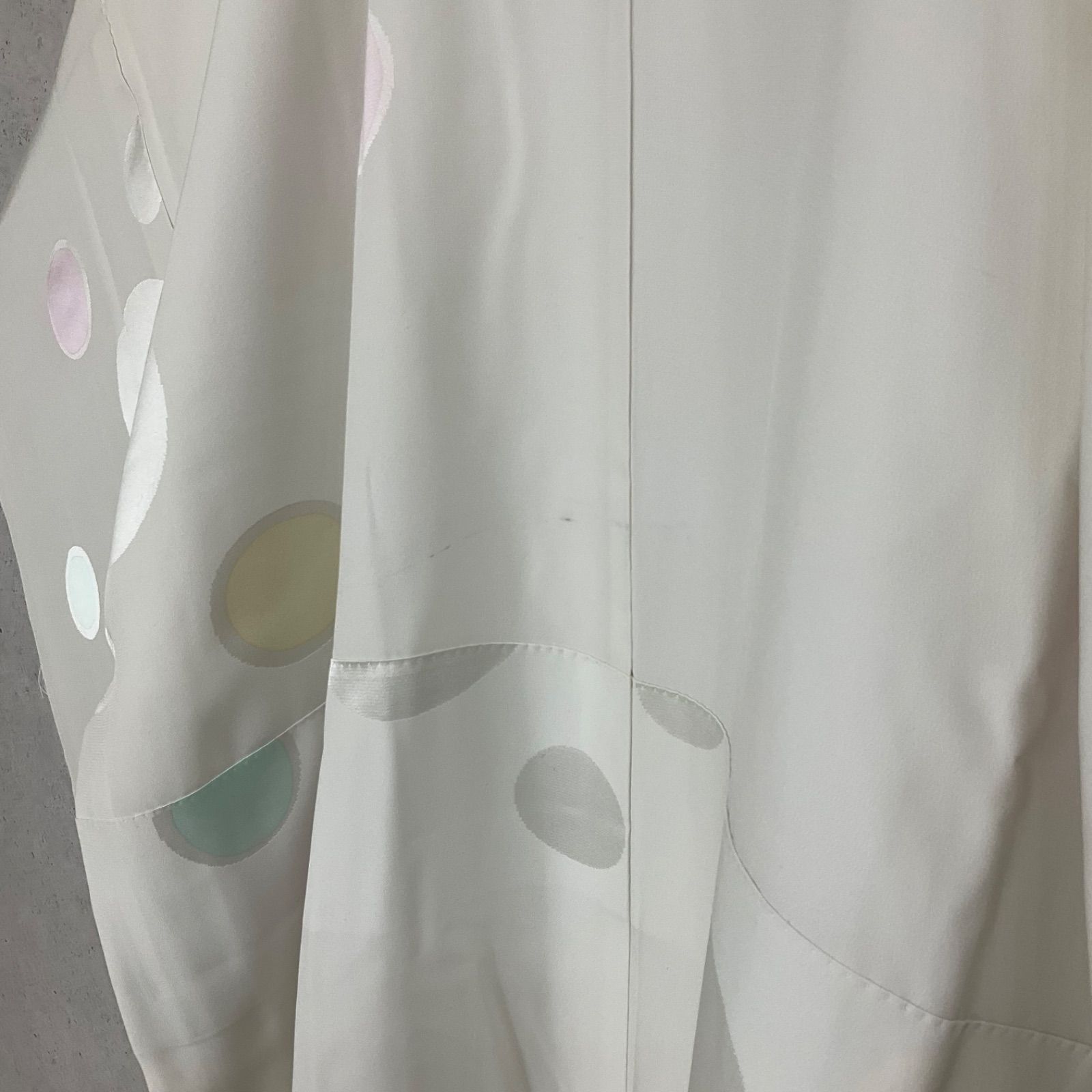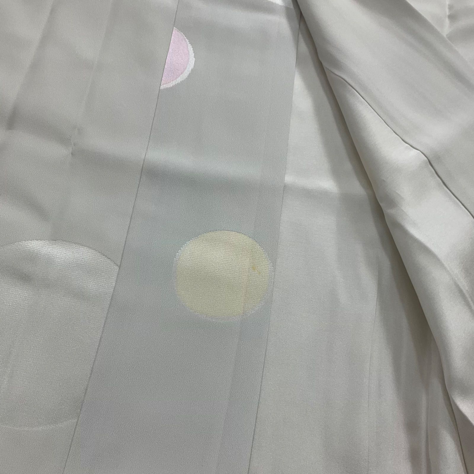●状態は大きな使用感なく綺麗な状態ですが、衽の下部の黄色い丸い模様のなかにうっすらとシミがあり、後ろ身頃の腰の上くらいの所には黒い点シミのような物がございますので最後の2枚の写真をご確認くださいませ。