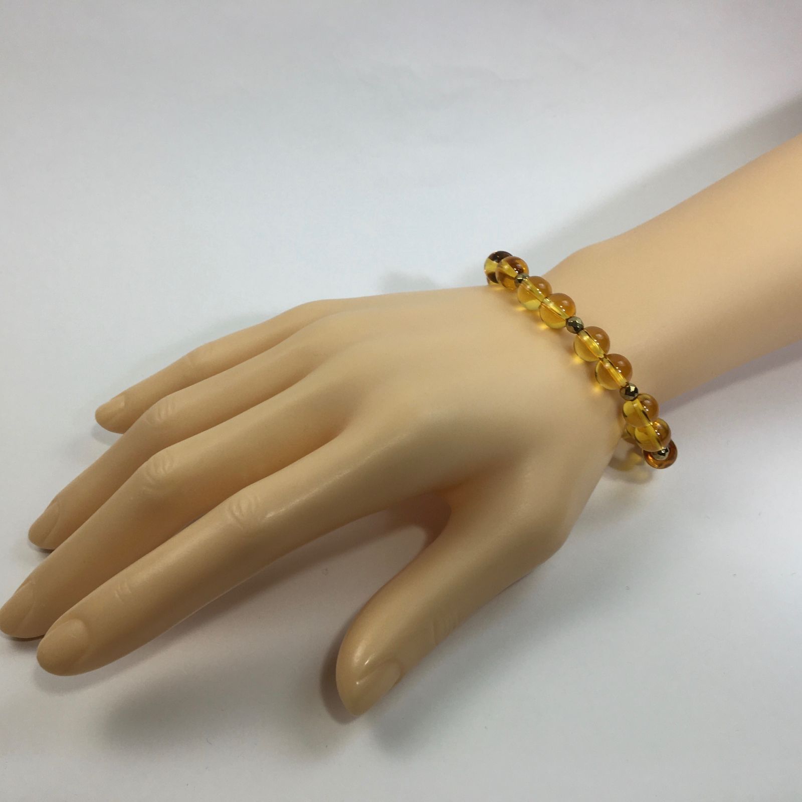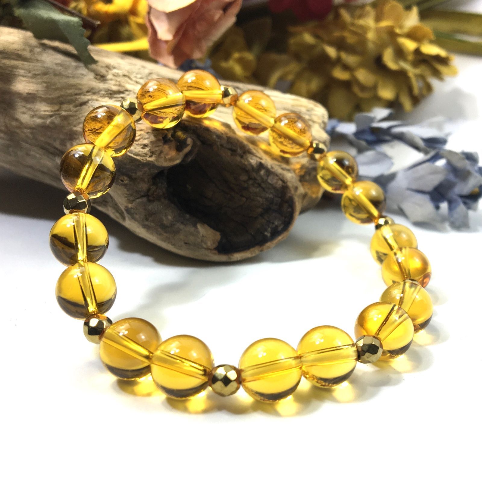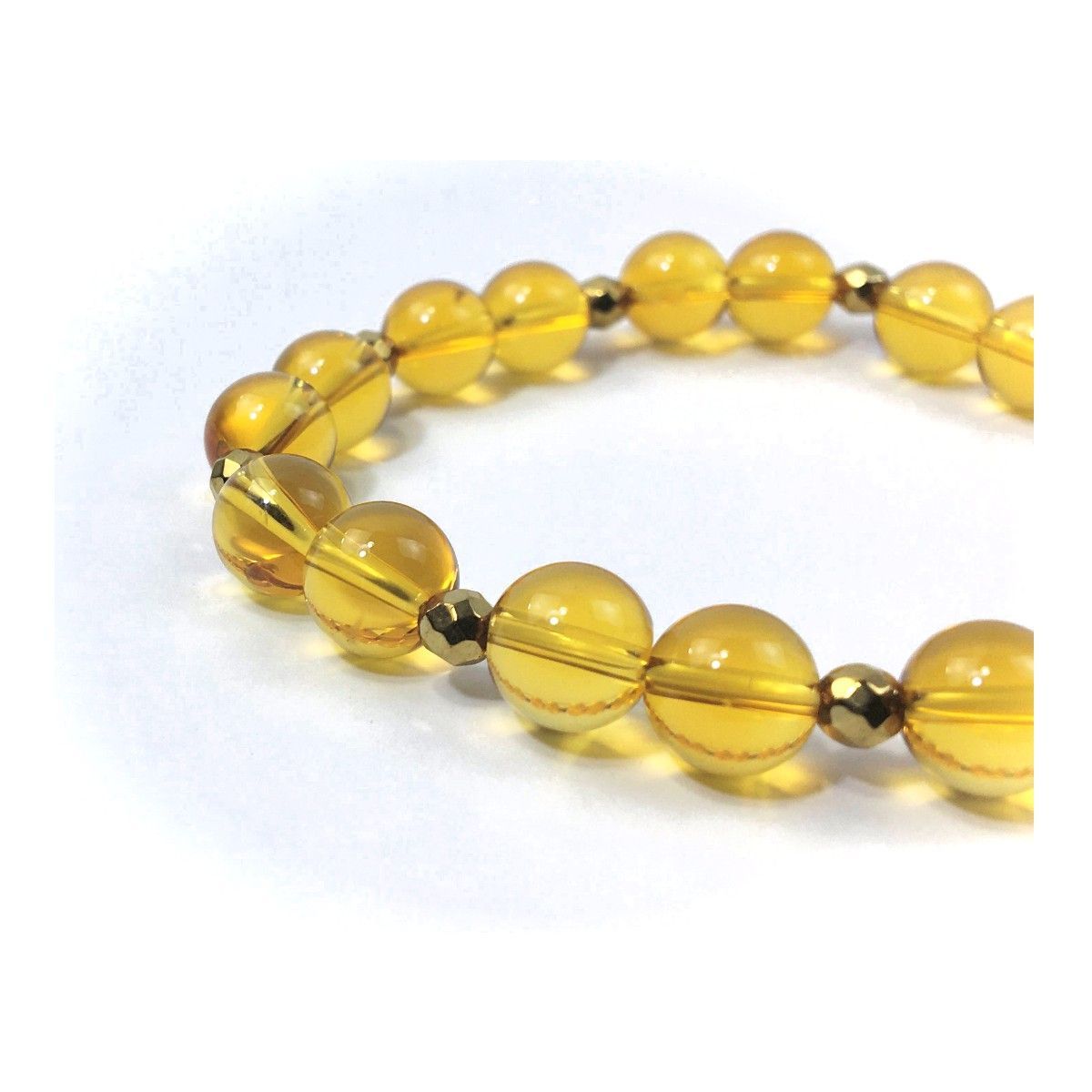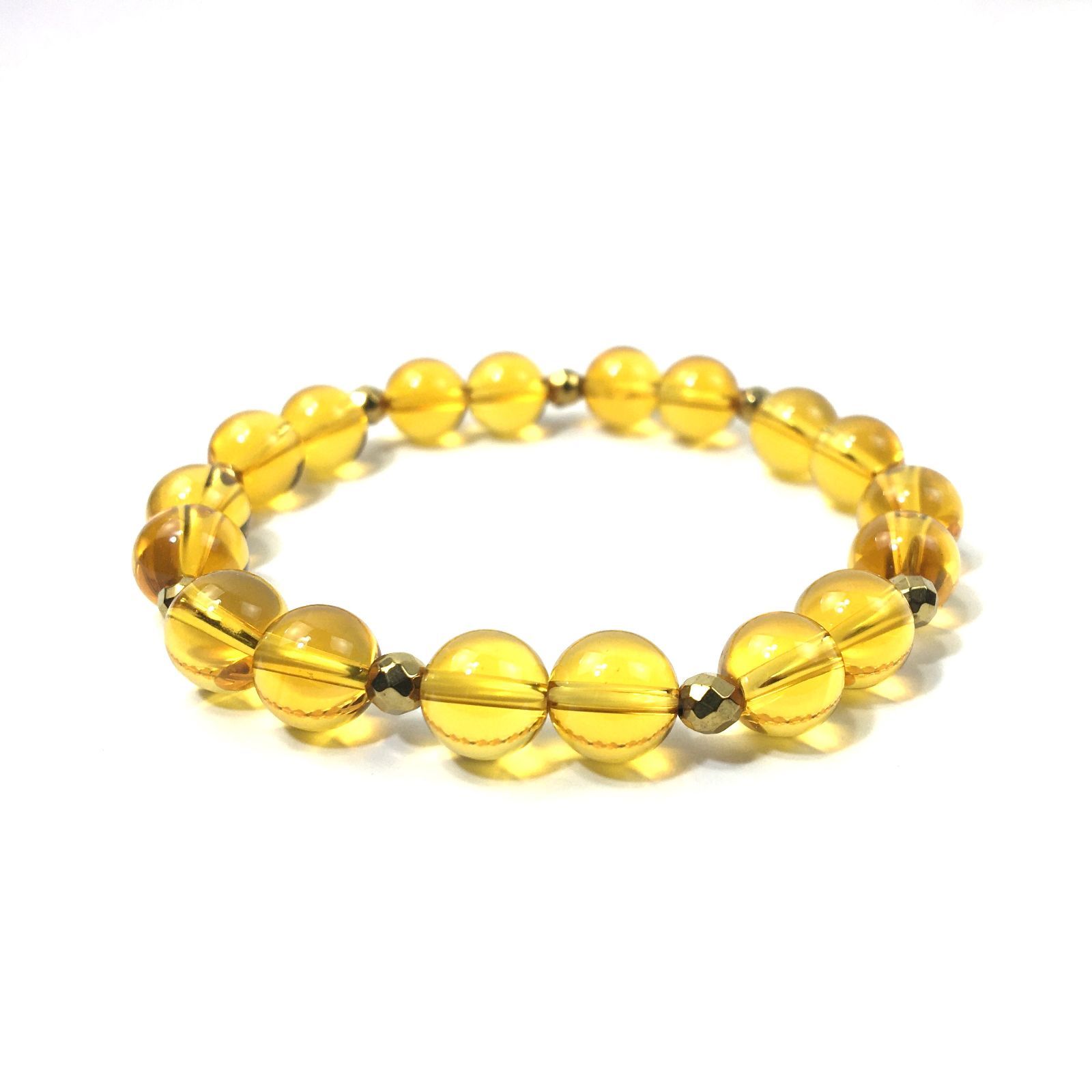 こちらは、8mm玉のシトリンを使ったパワーストーンブレスレットです。今回は石との間にはゴールドのヘマタイトを加えアクセントとしております。シンプルなデザインでどんなコーディネートにも合わせやすいデザインに仕上げています。サイズは内周約15cmです。気になる方は是非この機会にどうぞ。