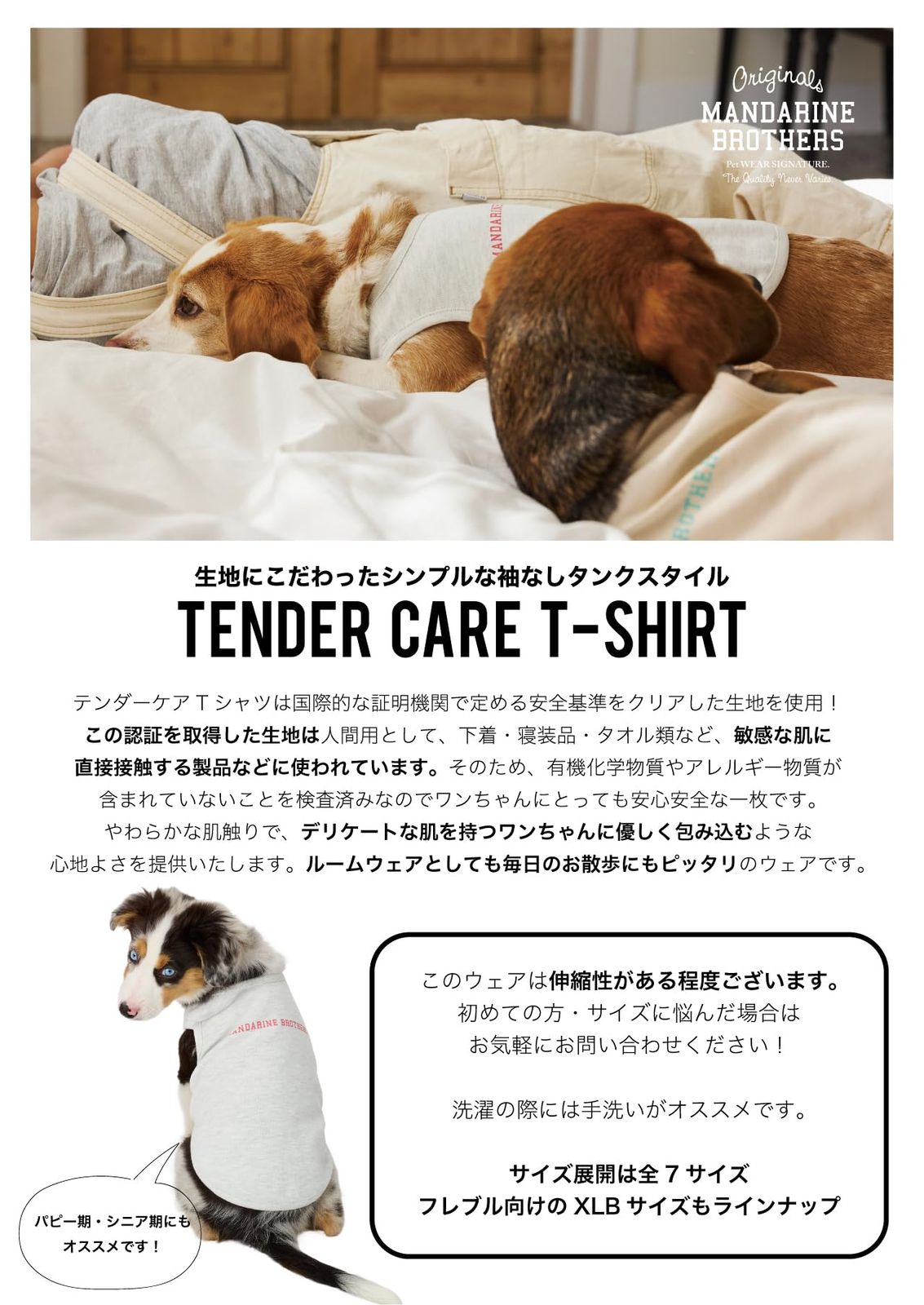 有害物質を含まない、安全性が確認された生地を使用したお洋服。 デリケートなお肌を持つワンちゃんにやさしく、やわらかく包み込む心地よさを提供します。