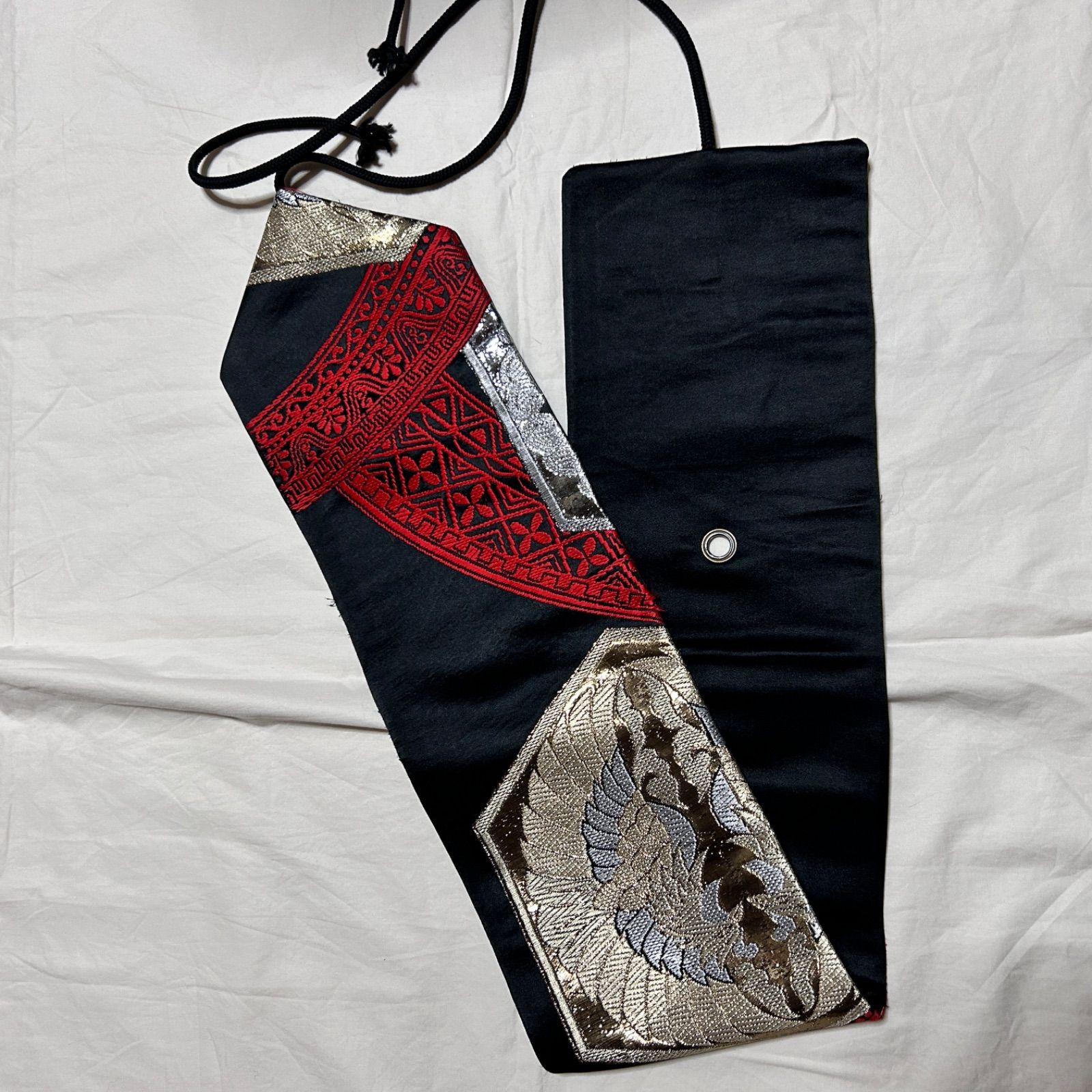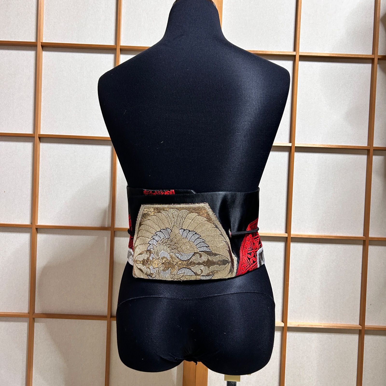 黒地をベースに、赤の織り柄と金銀糸の鶴文様を組み合わせた、存在感のある一枚。