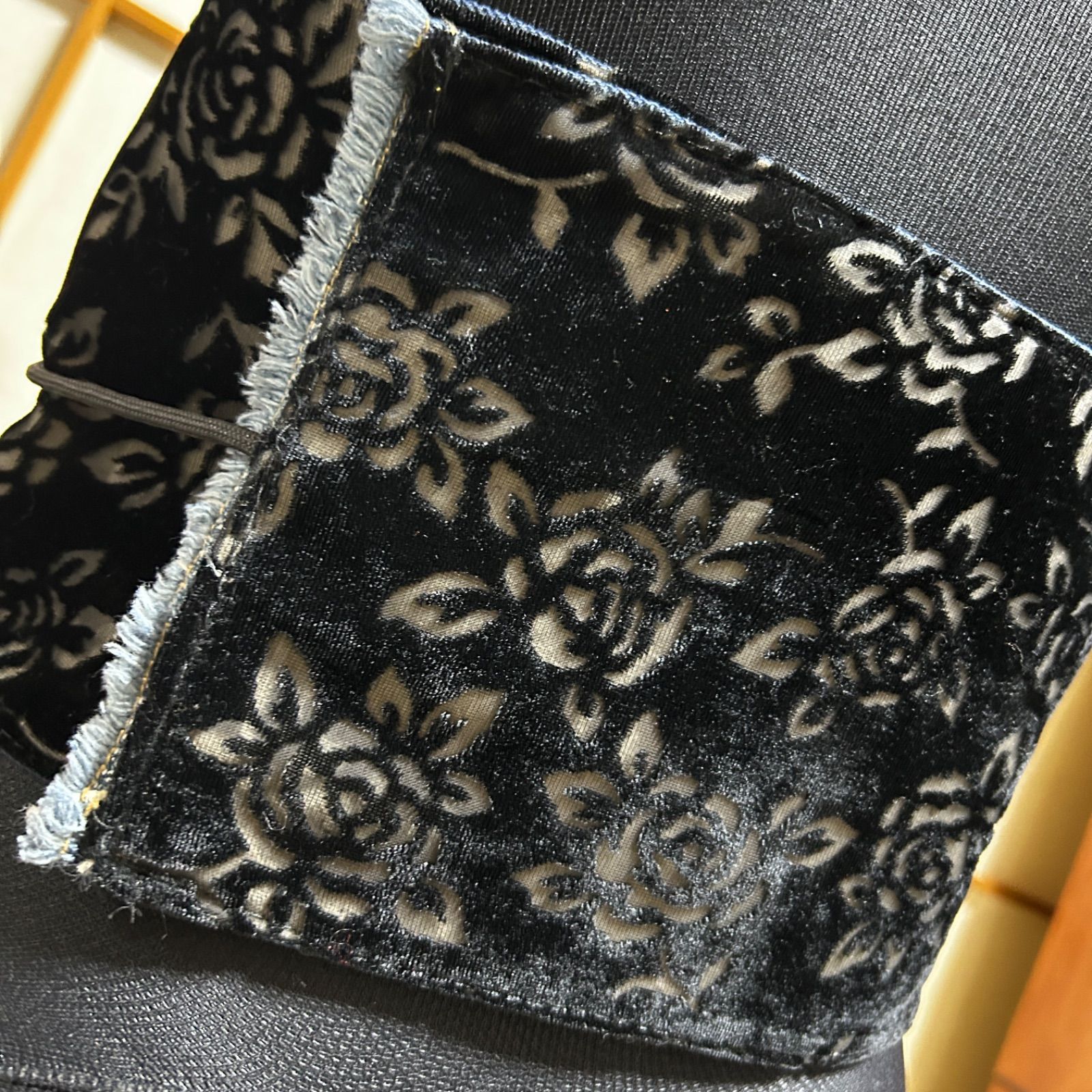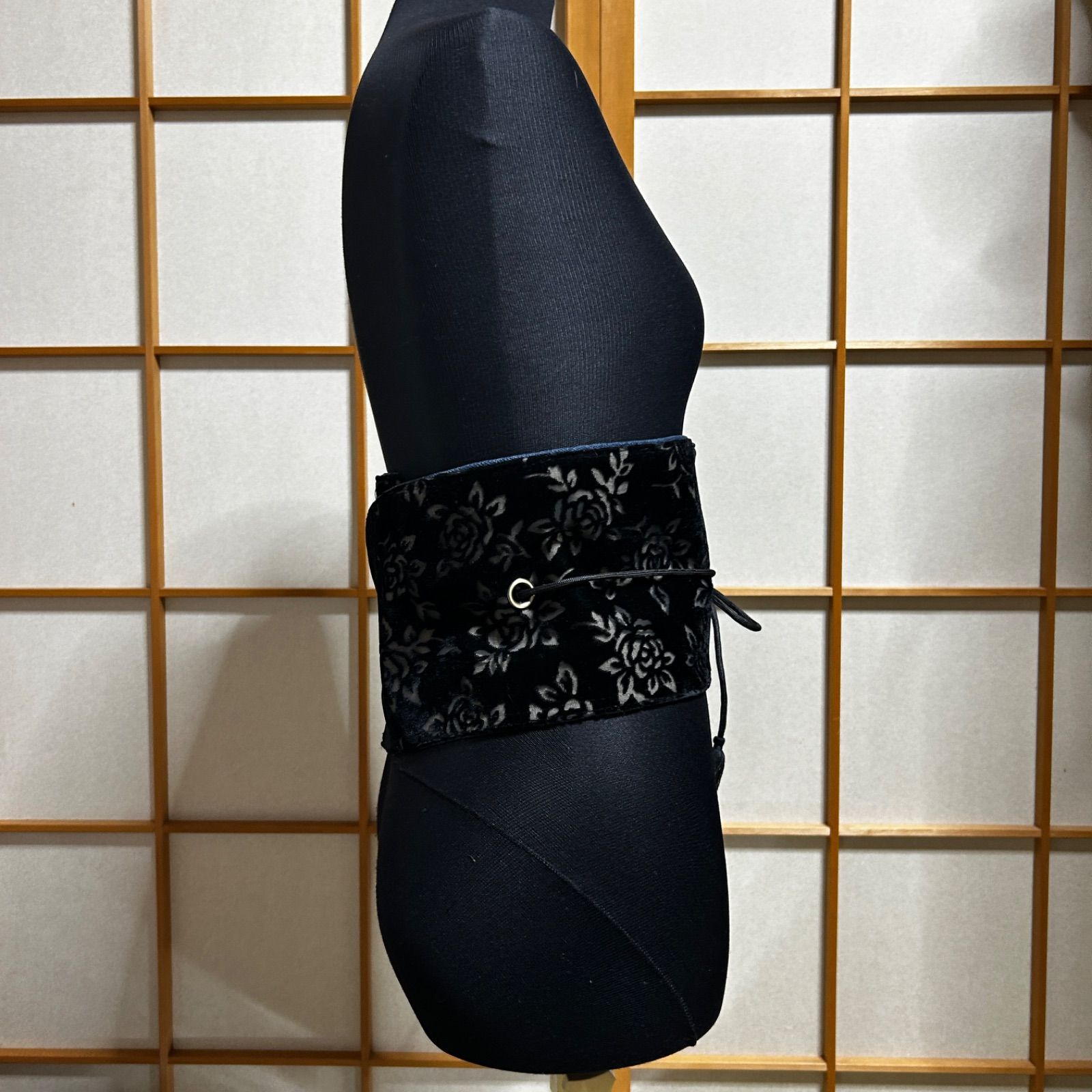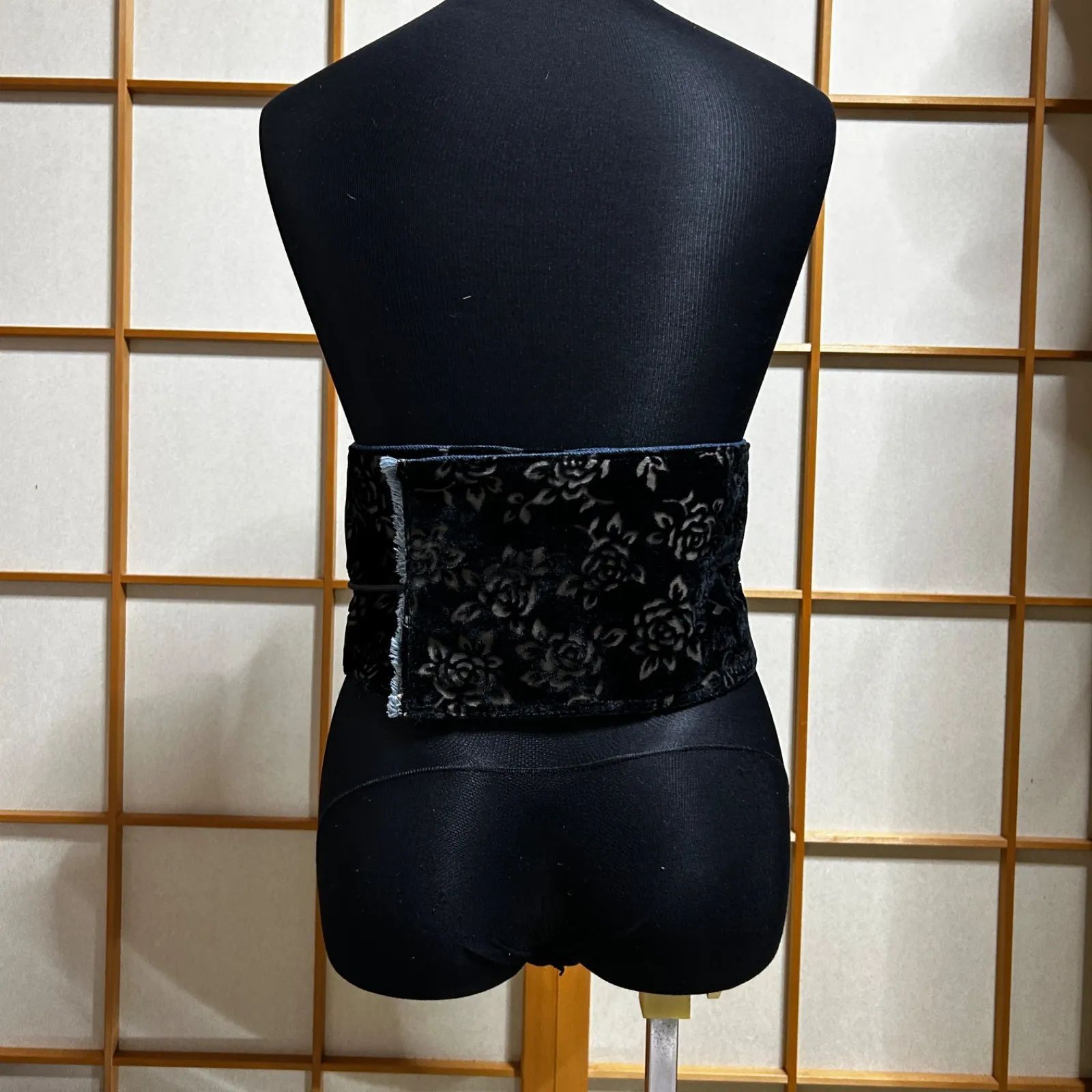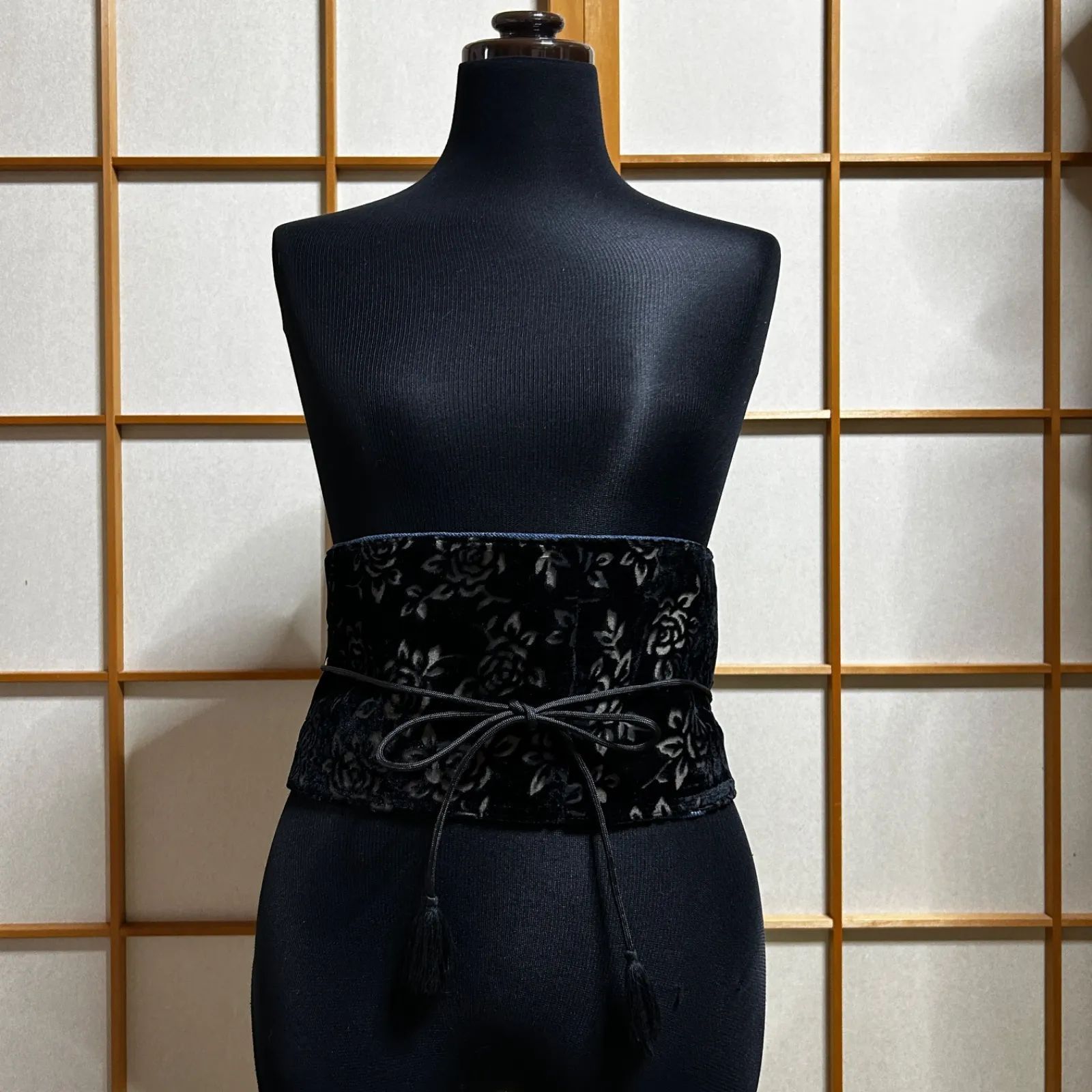 立体感のある黒薔薇柄ベルベット生地が目を惹く、シックで大人っぽい和洋折衷リメイク帯。