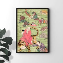 浮世絵の歴史において重要な役者絵である本作は、幕末の江戸に息づいた伝統芸術の傑作であり、歴代の市川團十郎が見せる見事な隈取や助六の粋な姿を描いています。景清の憤怒や狐忠信の神秘性が芝居の舞台を彷彿とさせる彩色と構図で表現されており、木版画に宿る役者の魂と情熱が華やかな文化の英雄たちの記憶を呼び覚まします。圧倒的な迫力は今も色褪せません。