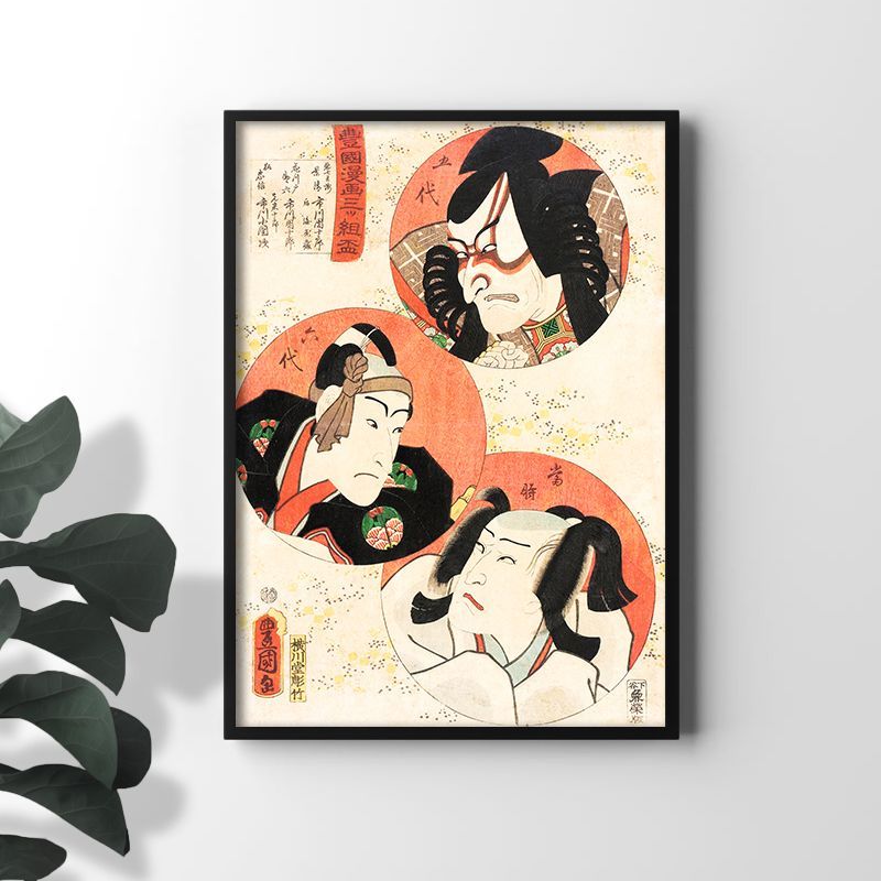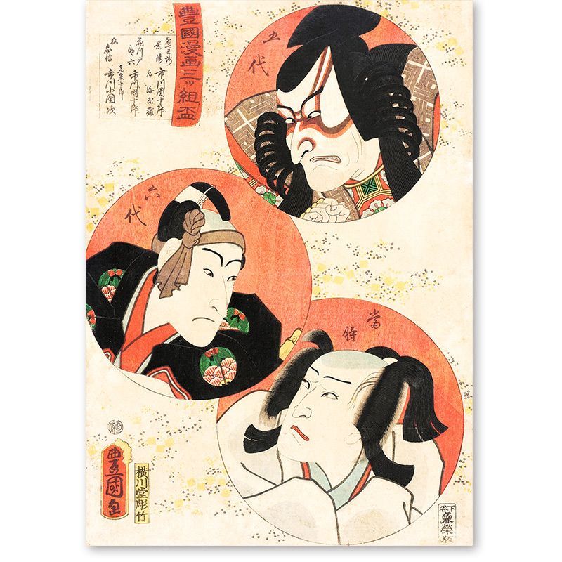 浮世絵の歴史において重要な役者絵である本作は、幕末の江戸に息づいた伝統芸術の傑作であり、歴代の市川團十郎が見せる見事な隈取や助六の粋な姿を描いています。景清の憤怒や狐忠信の神秘性が芝居の舞台を彷彿とさせる彩色と構図で表現されており、木版画に宿る役者の魂と情熱が華やかな文化の英雄たちの記憶を呼び覚まします。圧倒的な迫力は今も色褪せません。