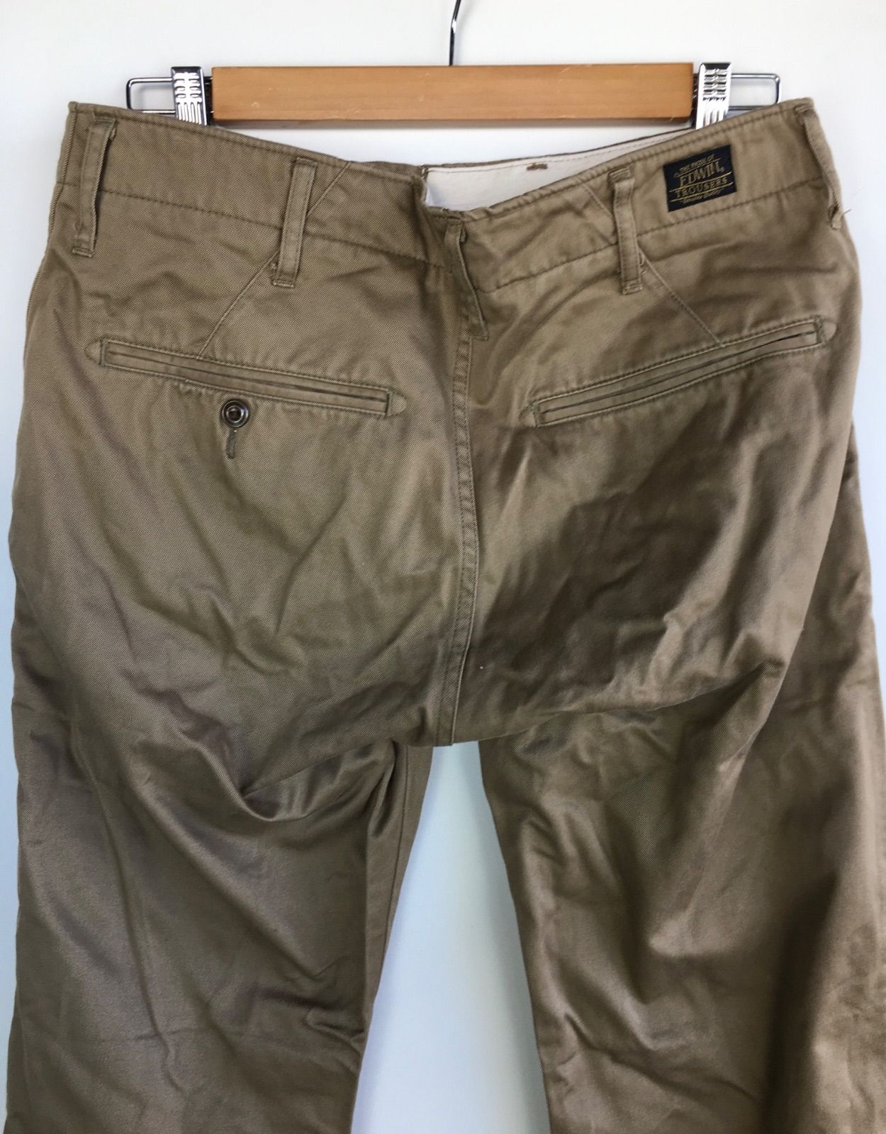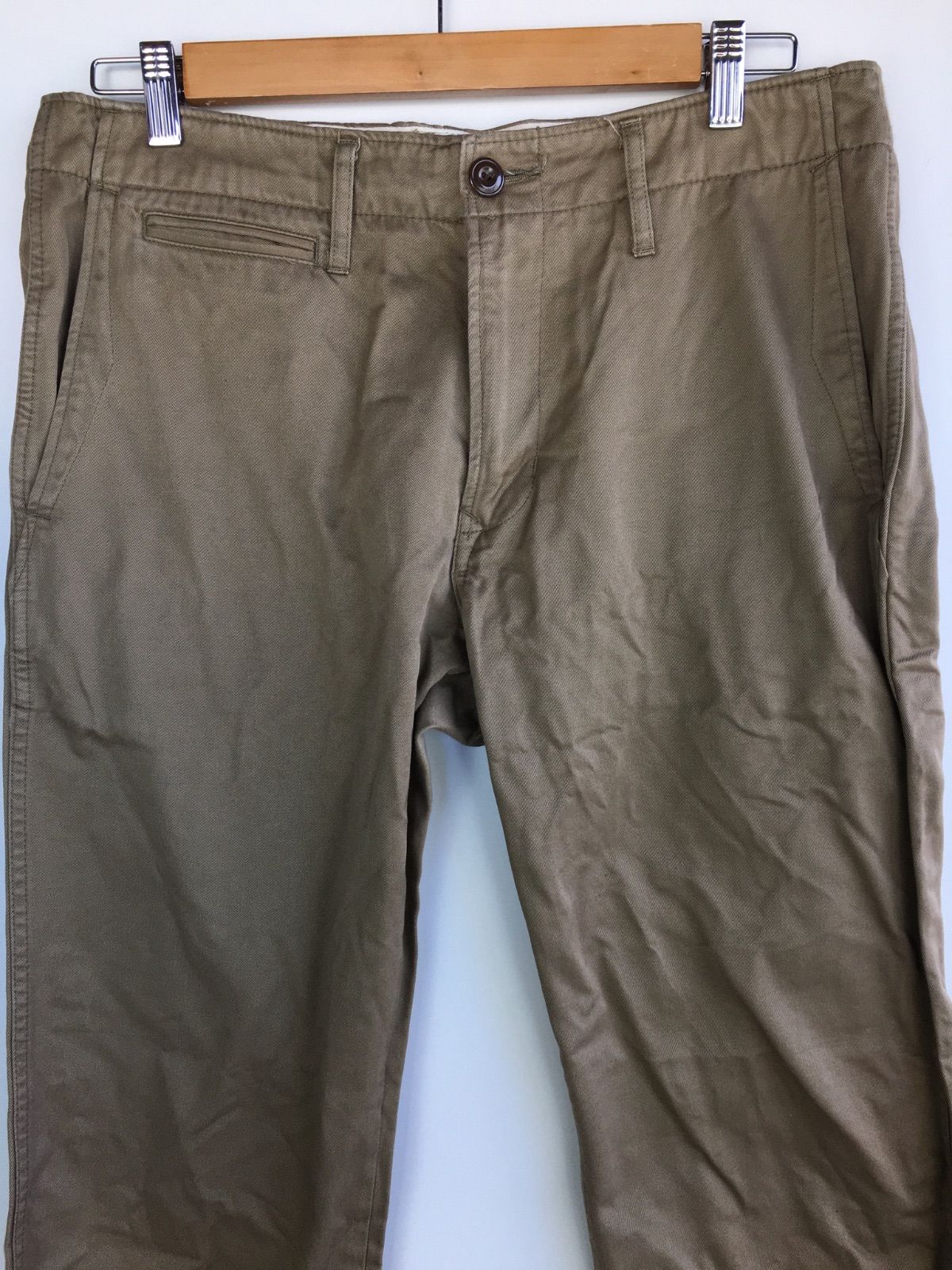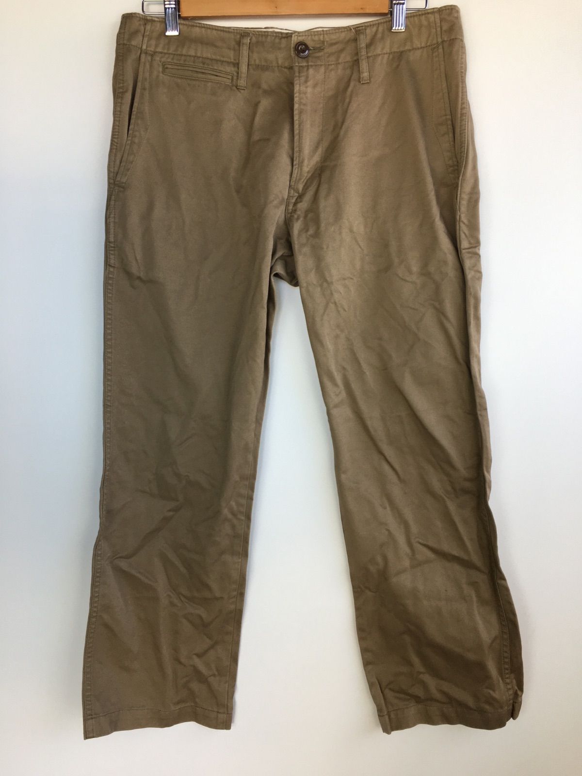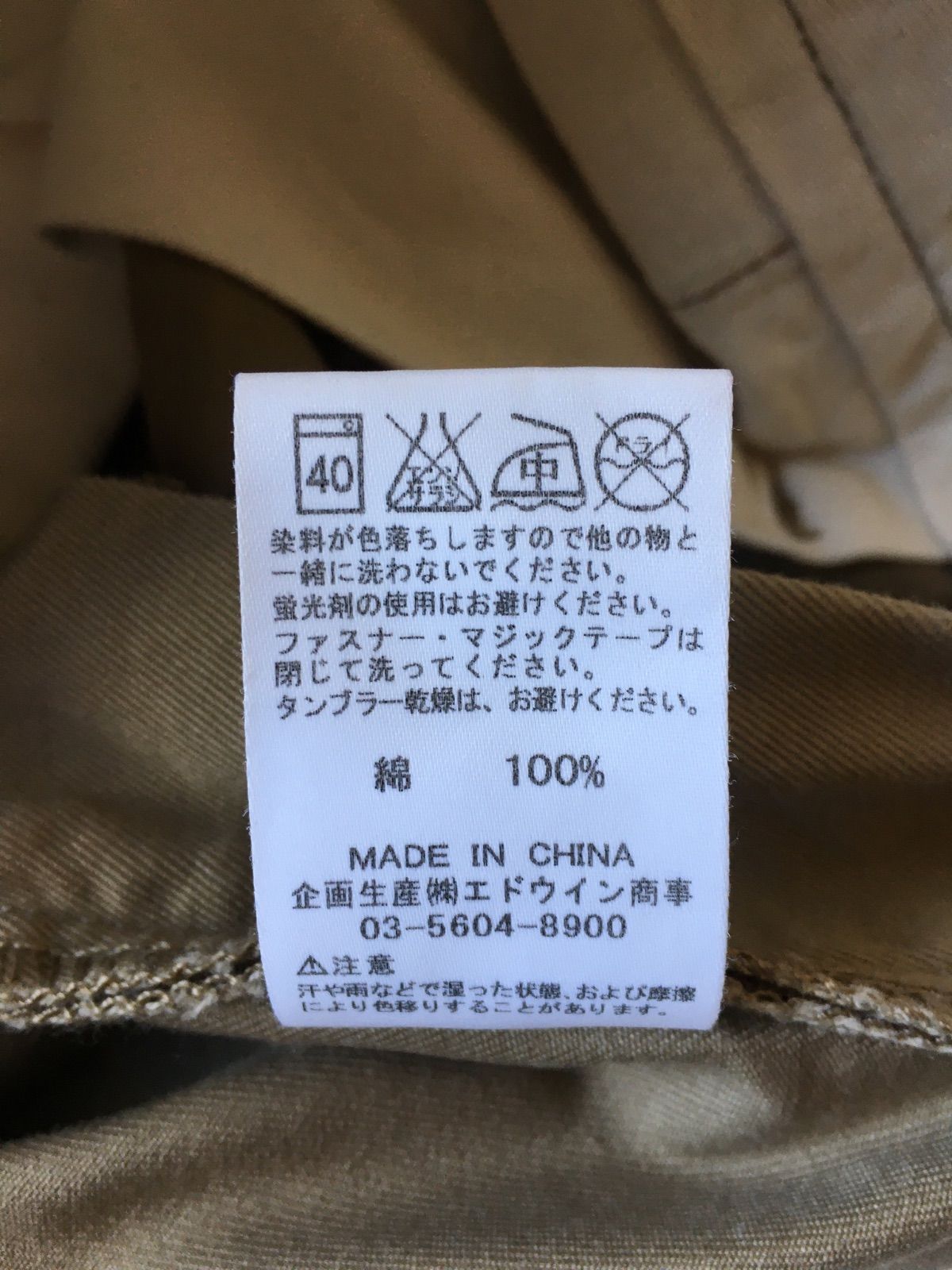 適度な厚みとハリのあるコットン生地を使用しており、腰回りにゆとりを持たせたクラシックなシルエットが特徴です。