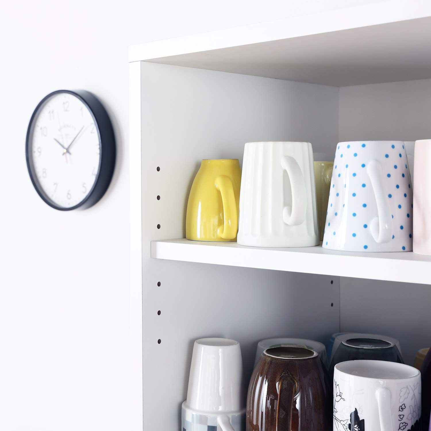上部は取り出し易さを考慮したオープン収納。3cm間隔で取り付け高さを調整できる移動棚2枚を利用すれば、マグカップが約30個収納できます。
