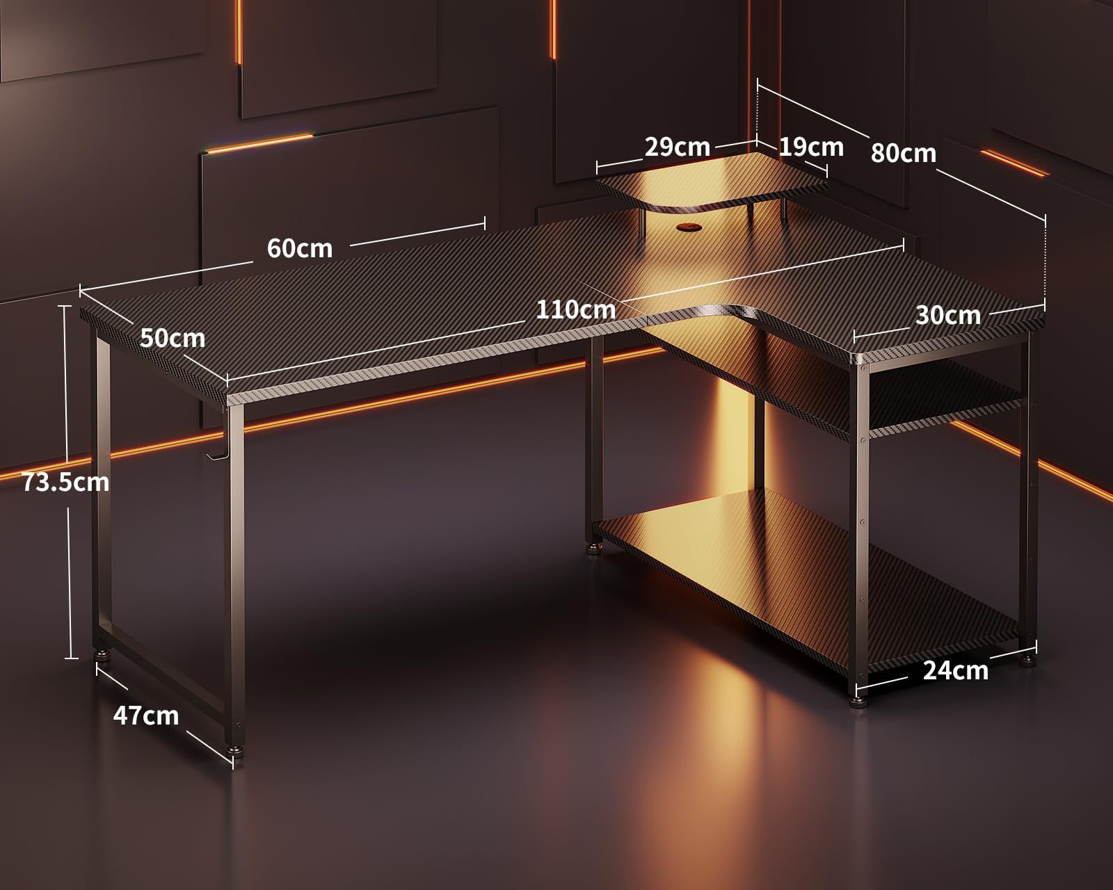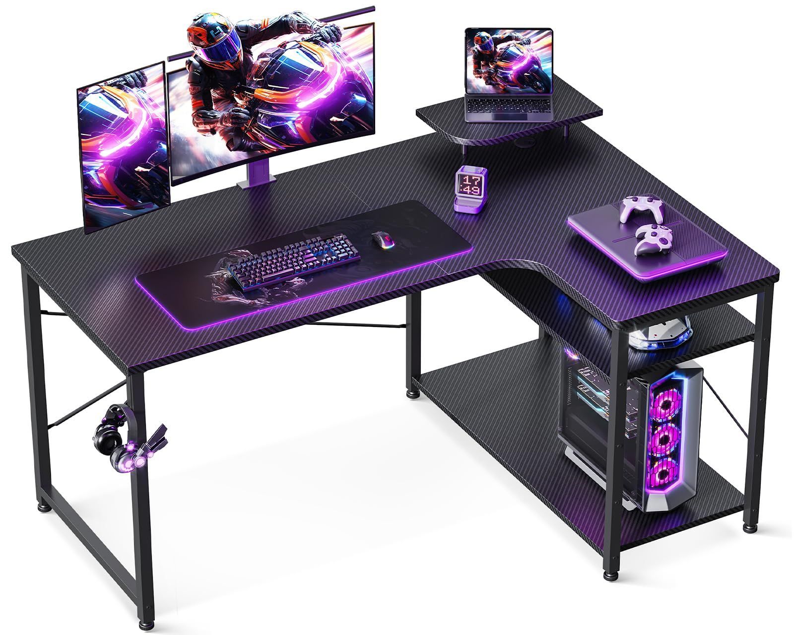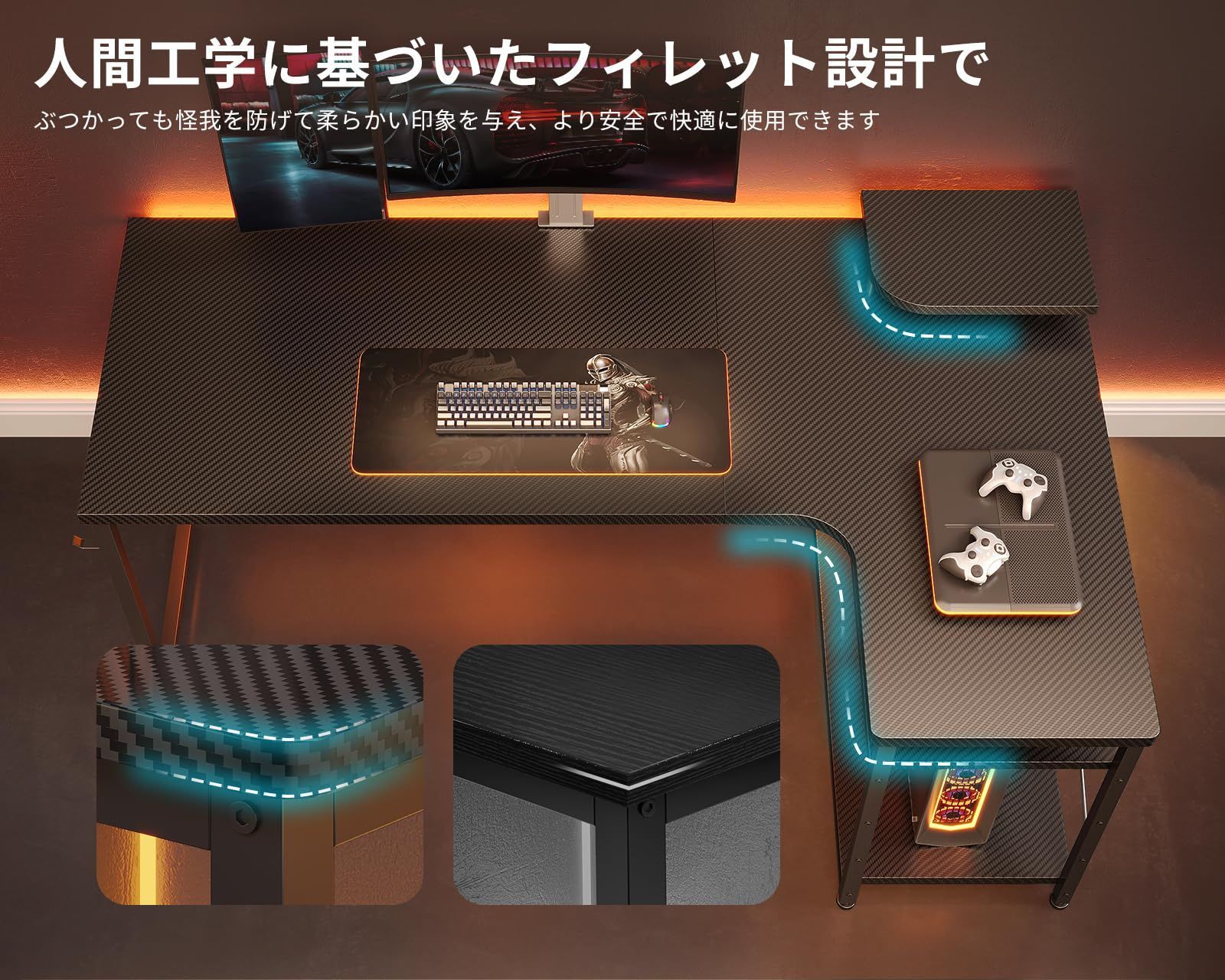 ODK ゲーミングデスク l字 パソコンデスク 幅110 机 デスク desk 棚付き 在宅勤務 pcデスク ?子 勉強机 L字型 組立簡単 カーボンブラック 右棚