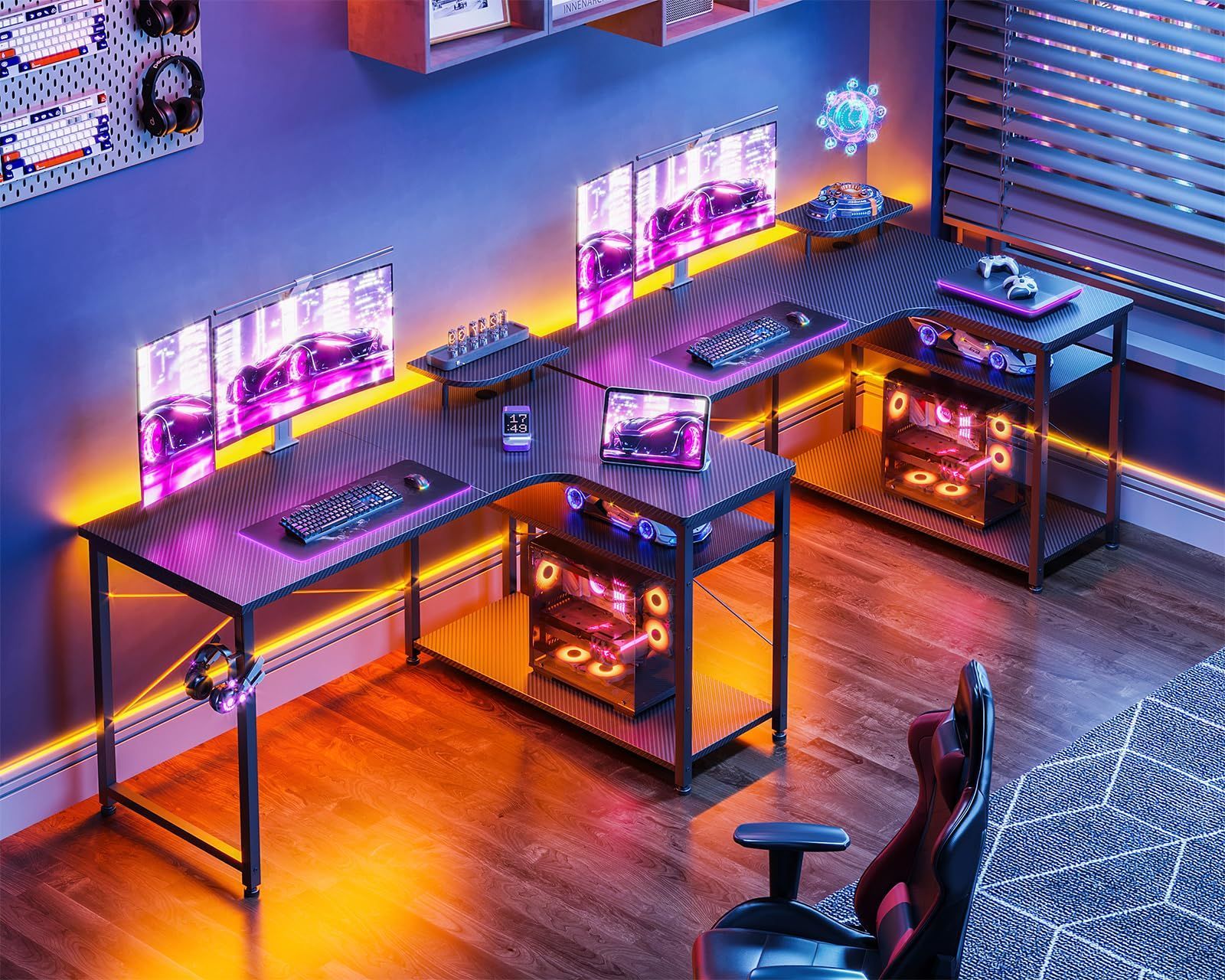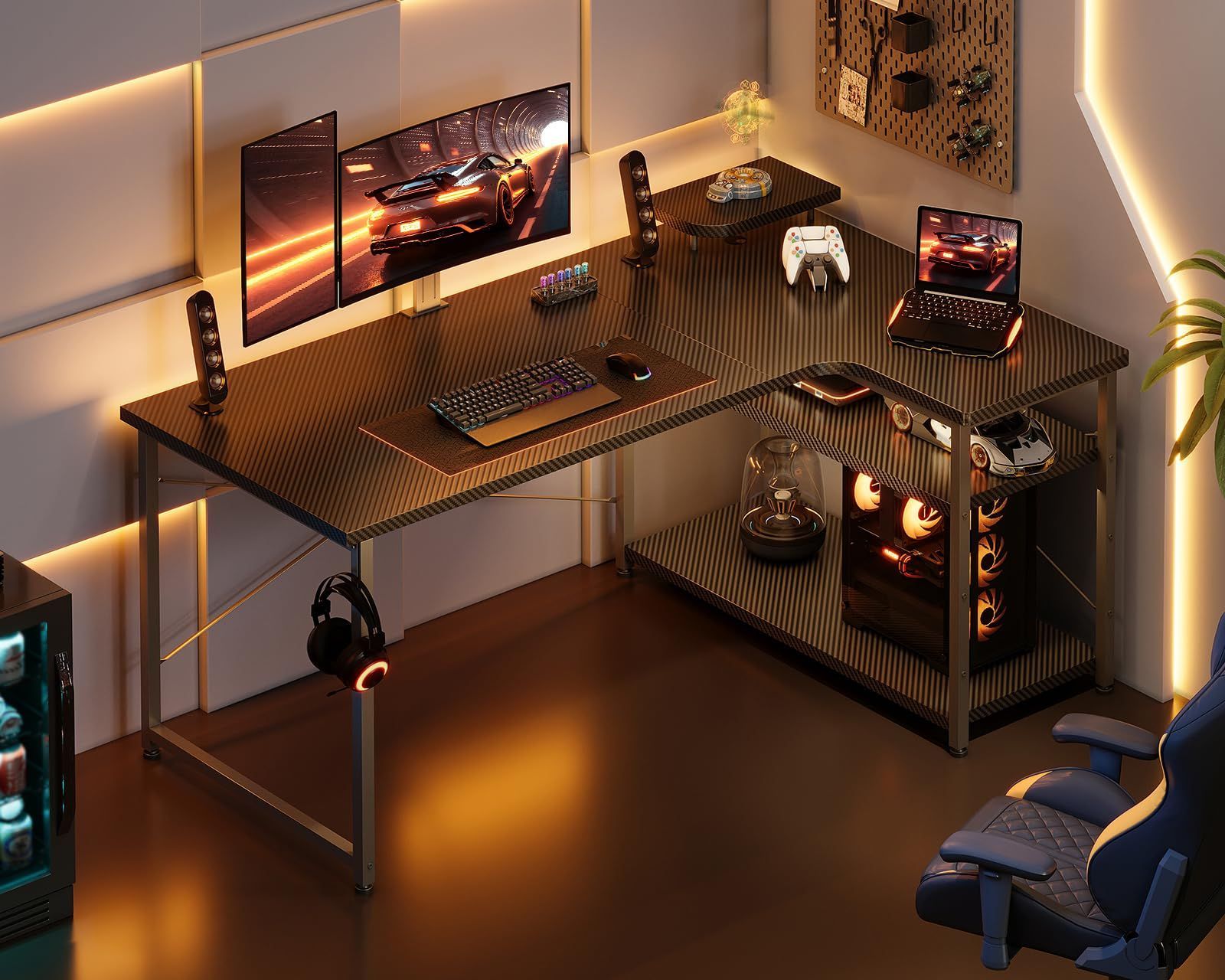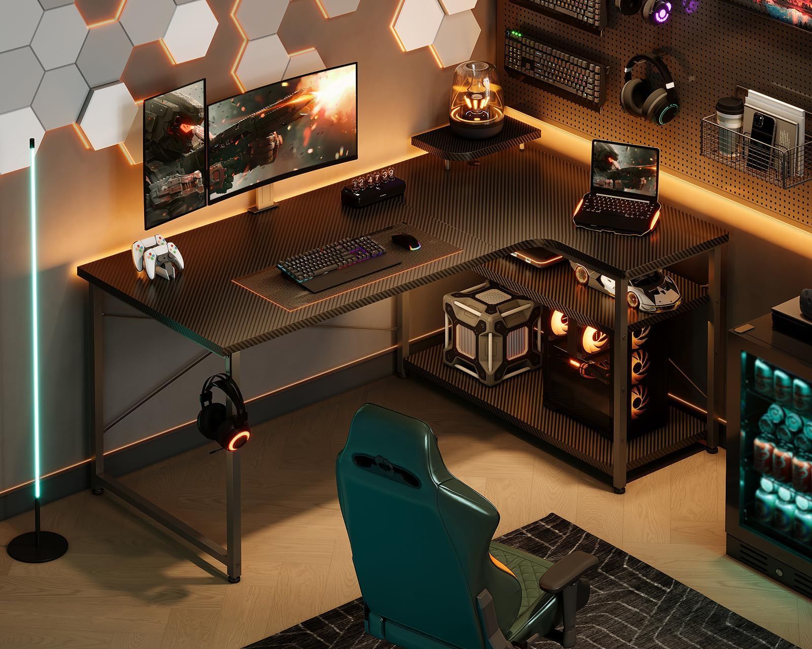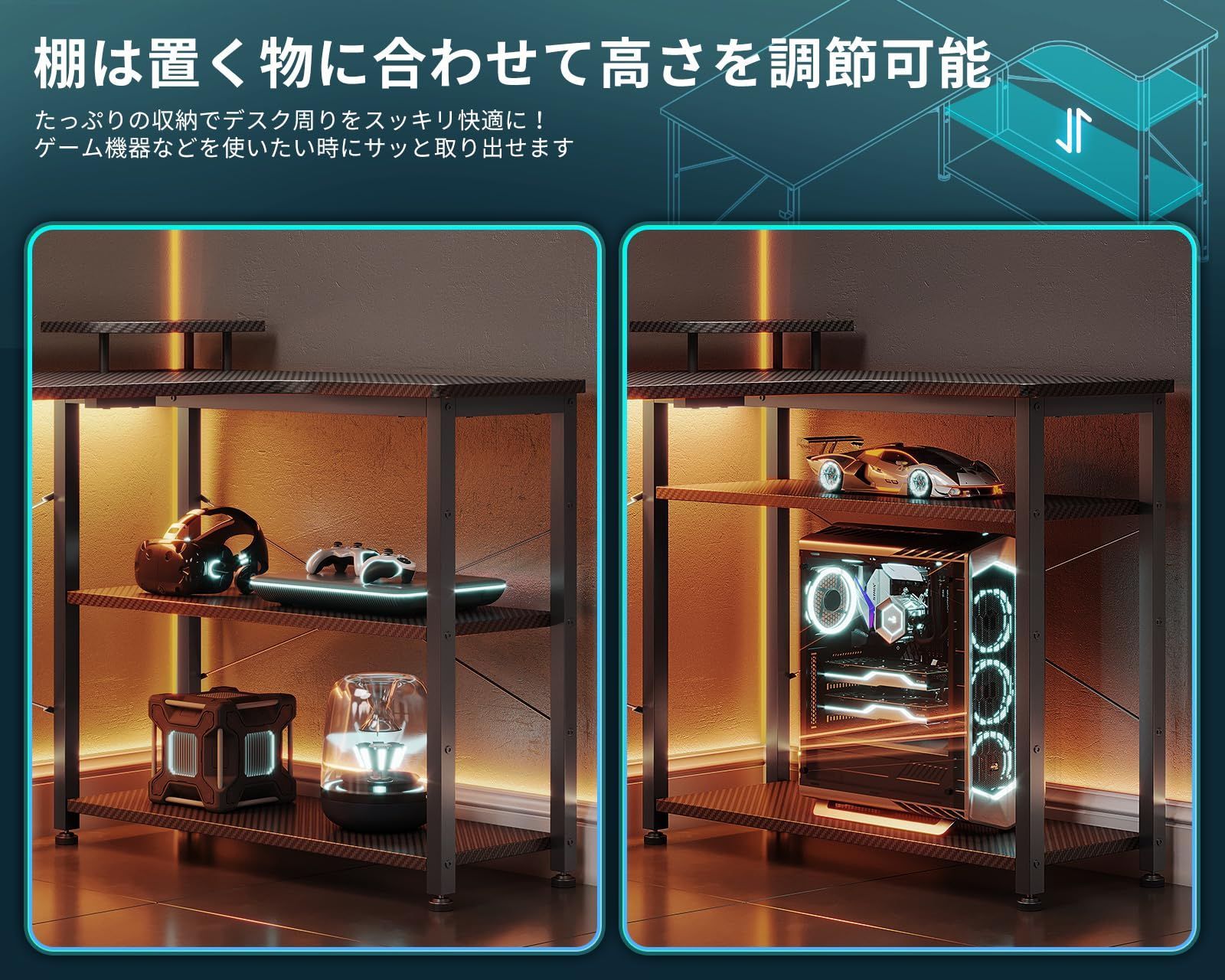 ODK ゲーミングデスク l字 パソコンデスク 幅110 机 デスク desk 棚付き 在宅勤務 pcデスク ?子 勉強机 L字型 組立簡単 カーボンブラック 右棚