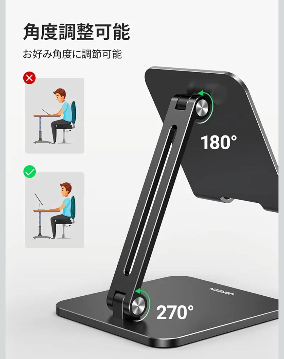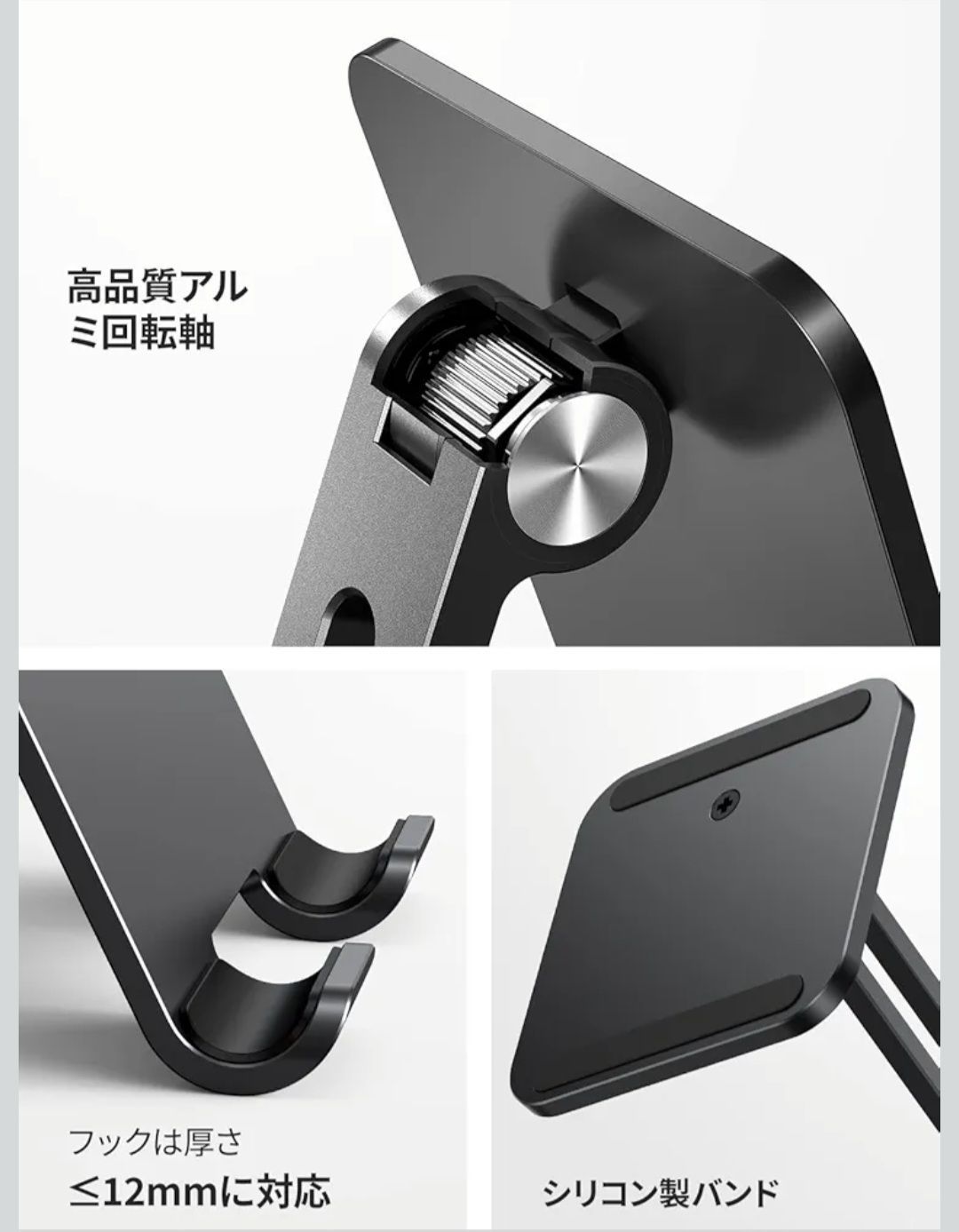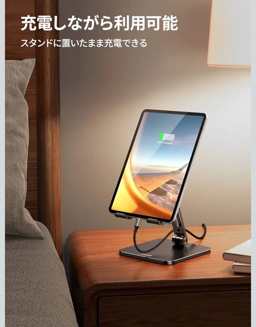 【安定性抜群】角度調整のやすさと安定感を両立するため、軸は最適な強度に調整されます。タブレットを置いでも重さで下がることはありません。回転できるの箇所が二つあり、軽くで回て、自分にベストな高さと角度に調整することができ、動画視聴や読書やタイピングなどには大活躍です。