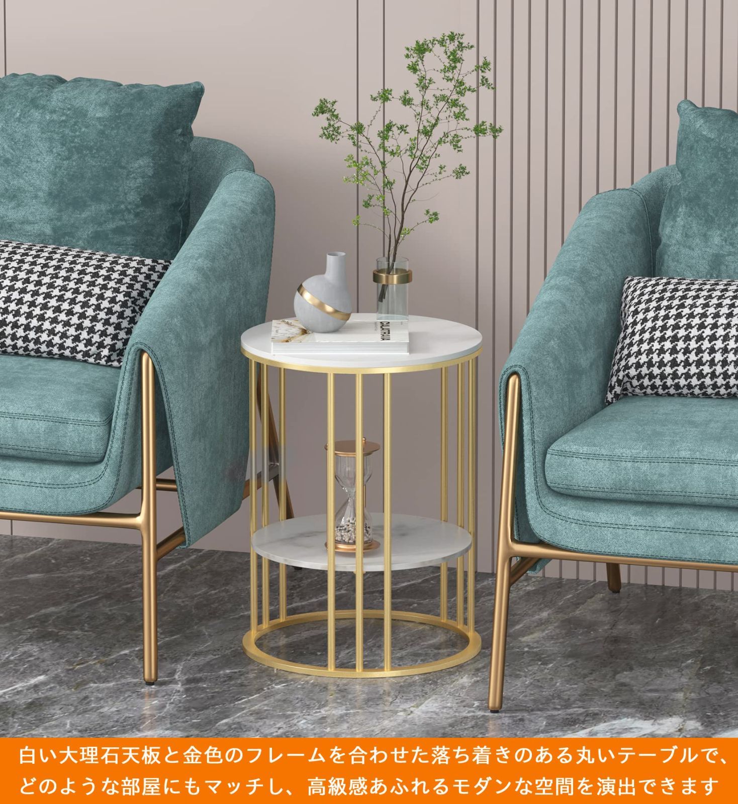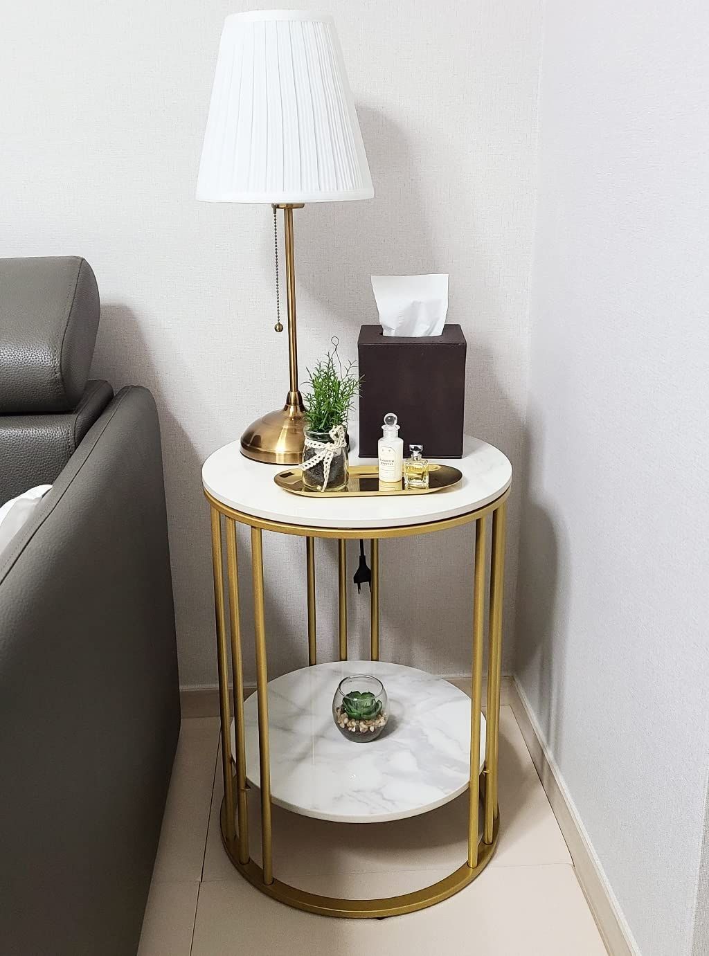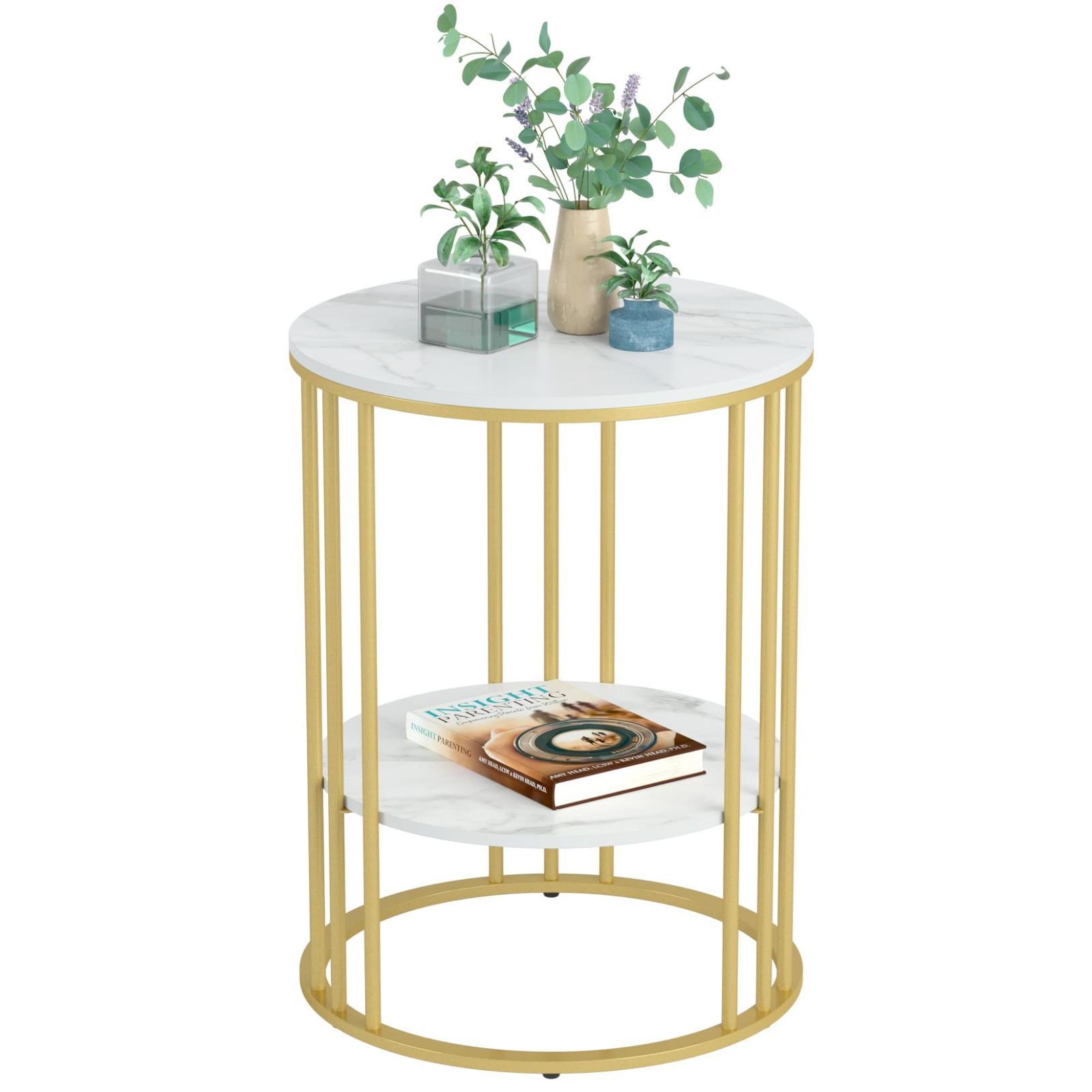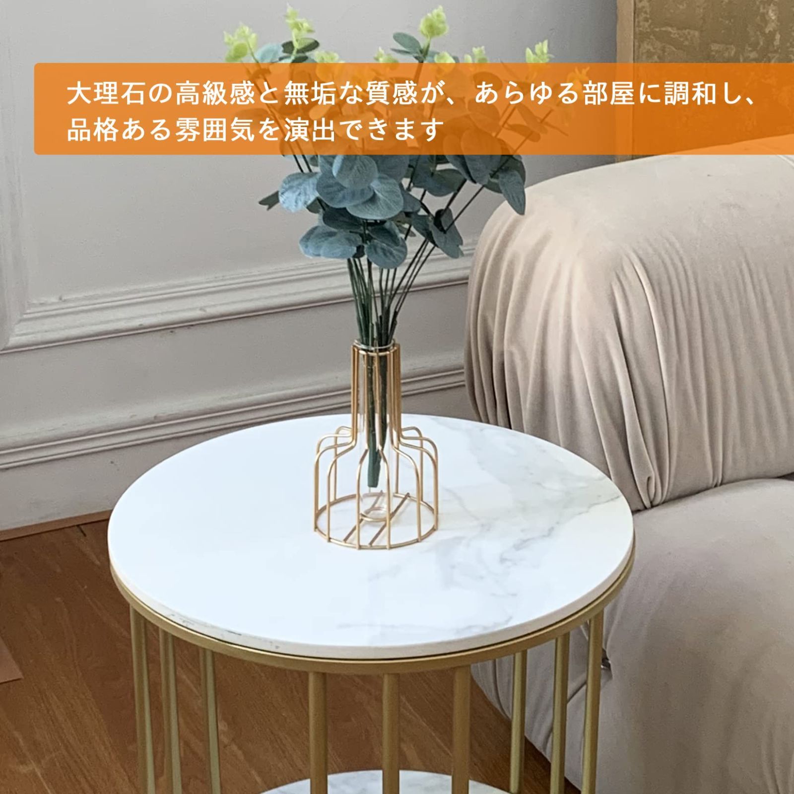Susire サイドテーブル 大理石 丸型 収納付き ゴールド エンドテーブル モダン コーヒーテーブル 寝室 棚付き 低い ホワイト 2段 可愛い カフェ ソファー用 一人暮らし ナイトテーブル 韓国 高さ50 40cm幅