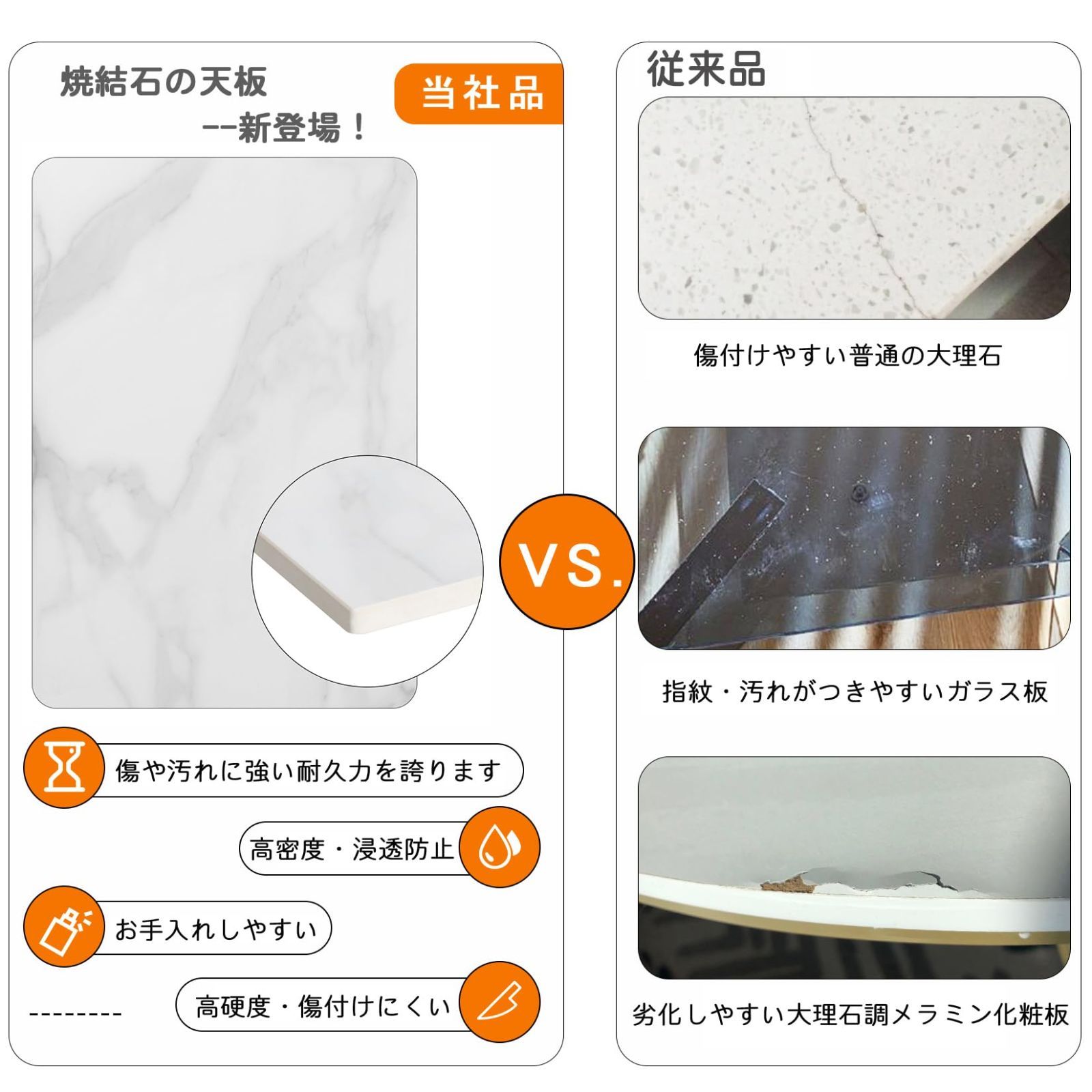 【傷付にくい天板】厚さ10mmの厚い大理石板はモース硬度が7でもあるので、浸透防止でき、汚染物質などが付着しにくく、衝撃・傷に強くてお手入れもしやすくなります