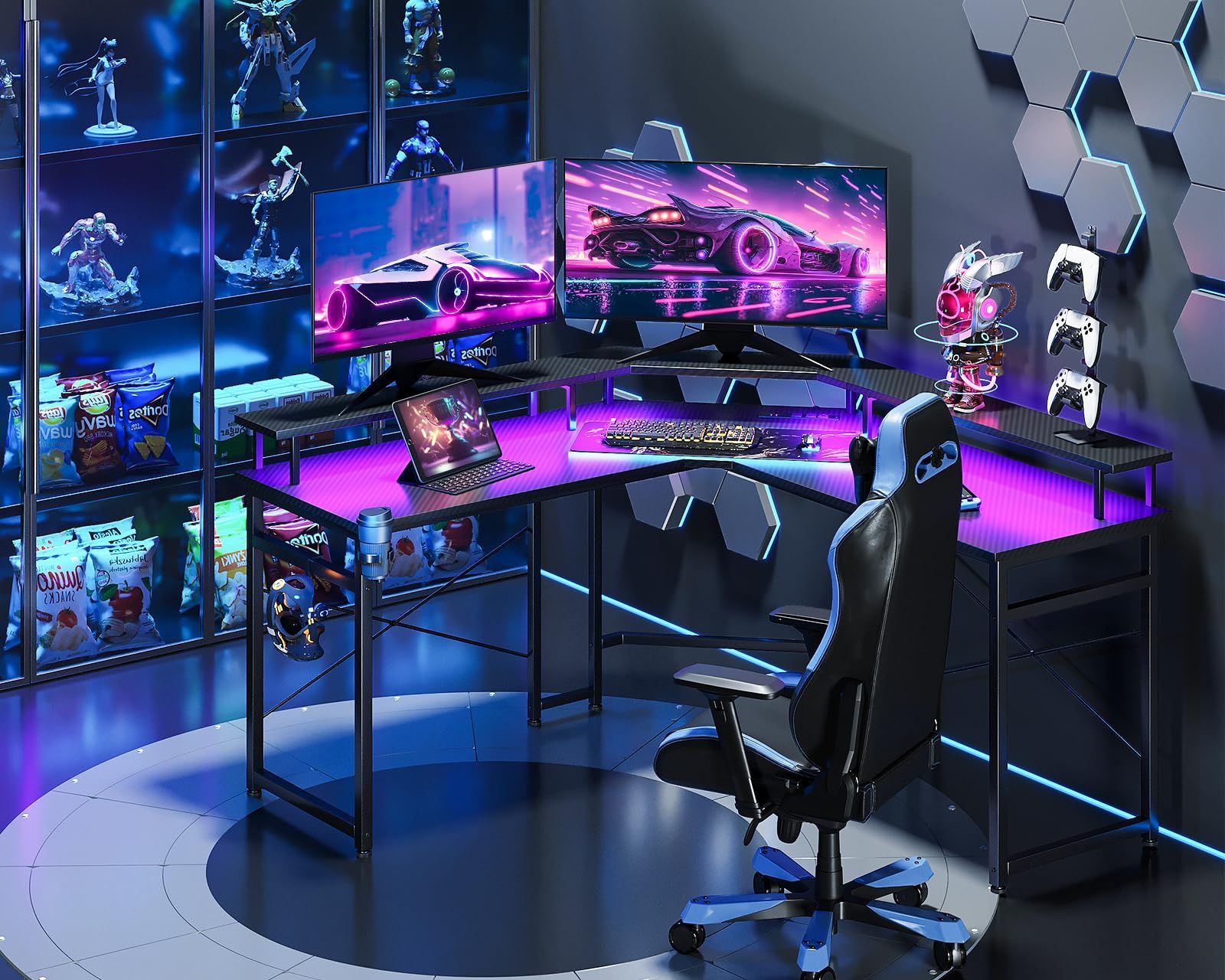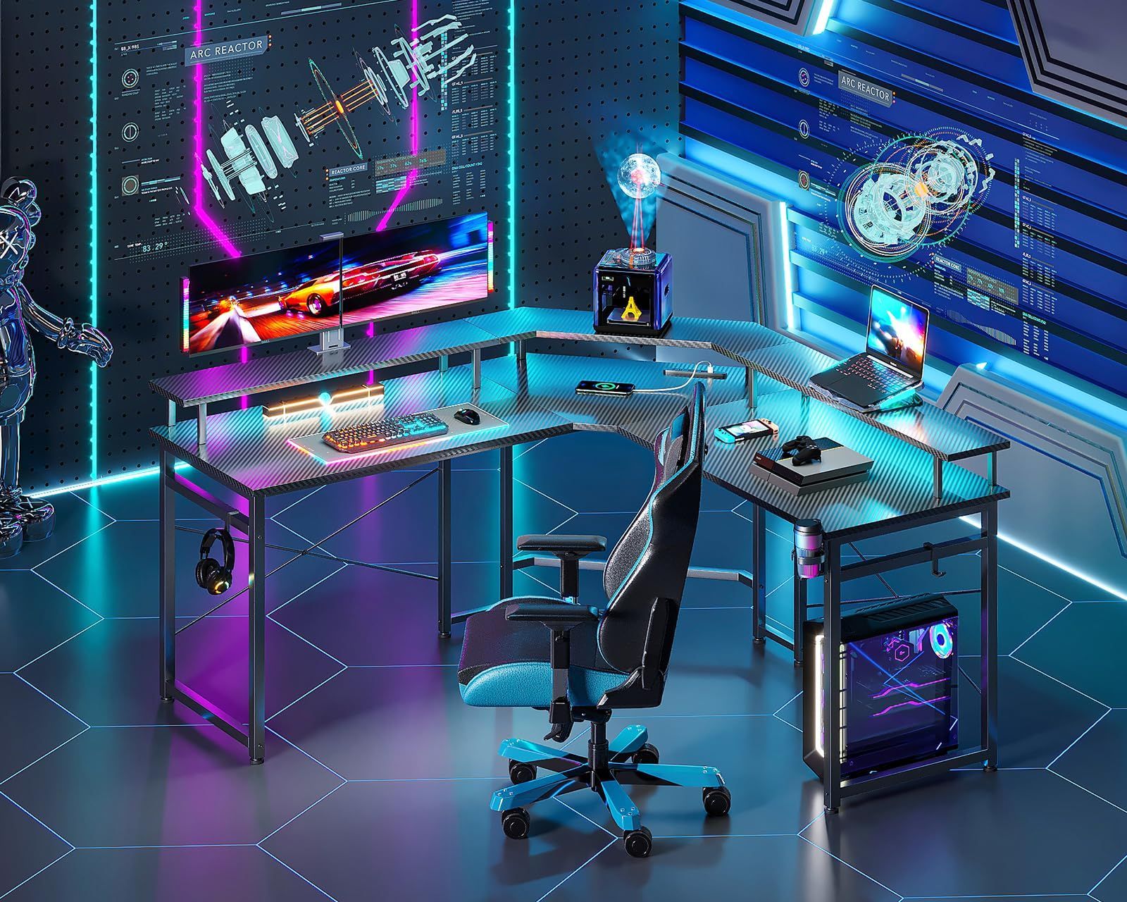 ODK ゲーミングデスク コンセント付き パソコンデスク 机 幅129 収納 desk 仕事用 l字デスク 在宅勤務 組立簡単 カーボン調ブラック