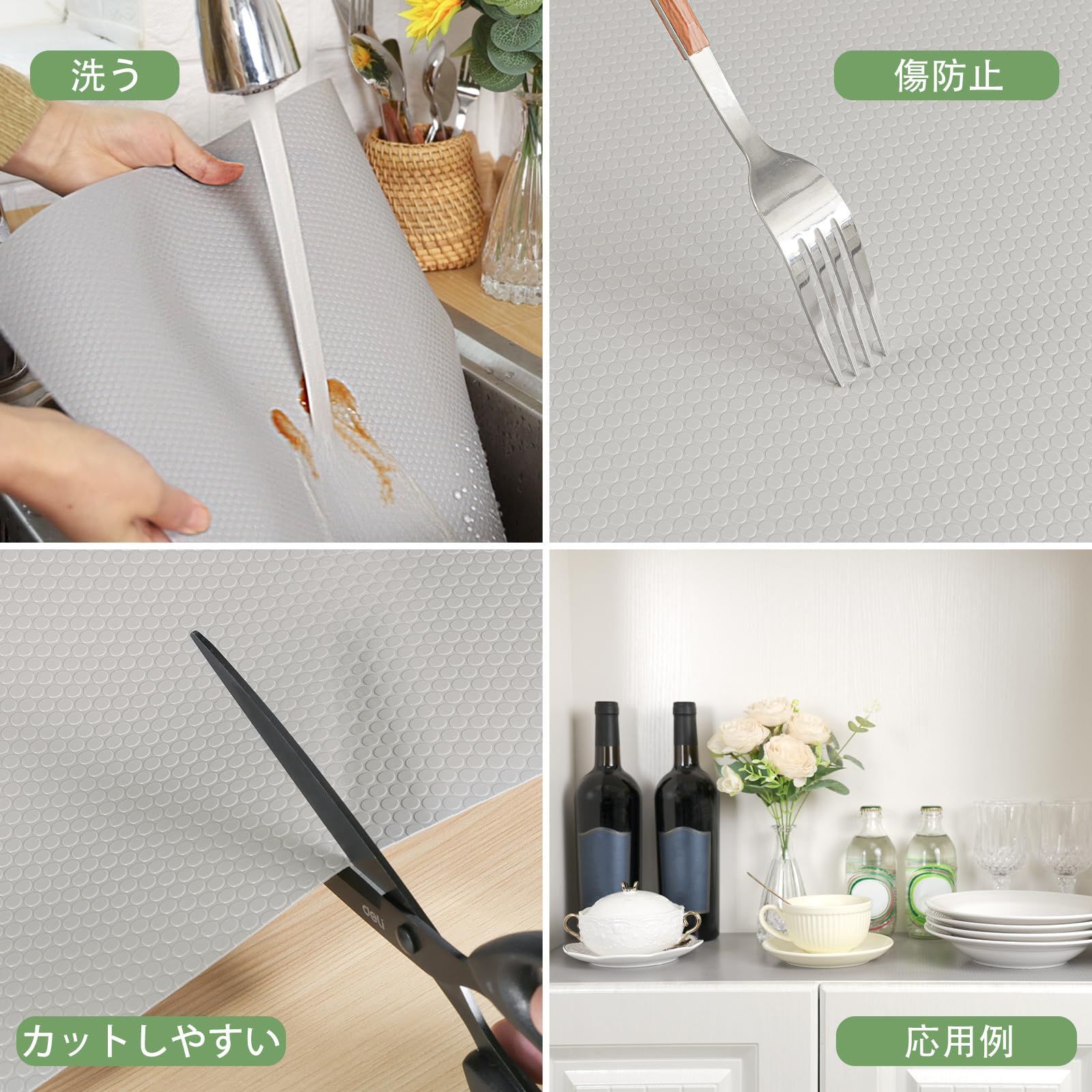 [滑り止め・非粘着性] 両面とも非粘着性の素材なので、ライナーを簡単に取り出して掃除することができます。 食器棚シートは、虫、油、汚れと台所用品の滑りを防ぎ、カビの発生を有効に予防できます。台所用品や本やなどの品物の保護に役立たちます。