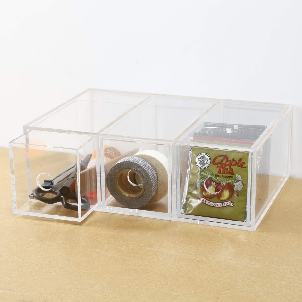 見える収納に便利なアクリル素材です。MDFボックスや収納ボックス6段と並べて置けるよう、高さを同じにしました。引き出しの向きを入れ替えれば縦・横どちらでも置いて使えます。