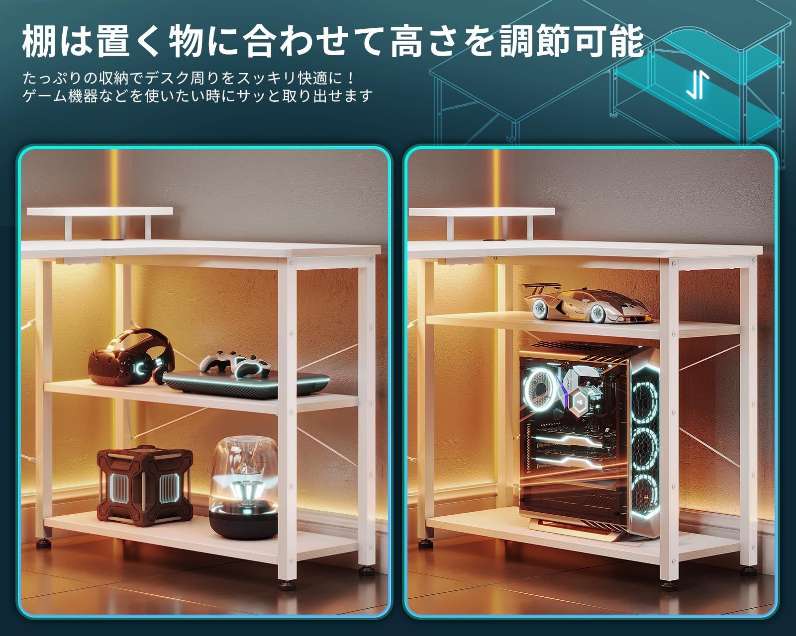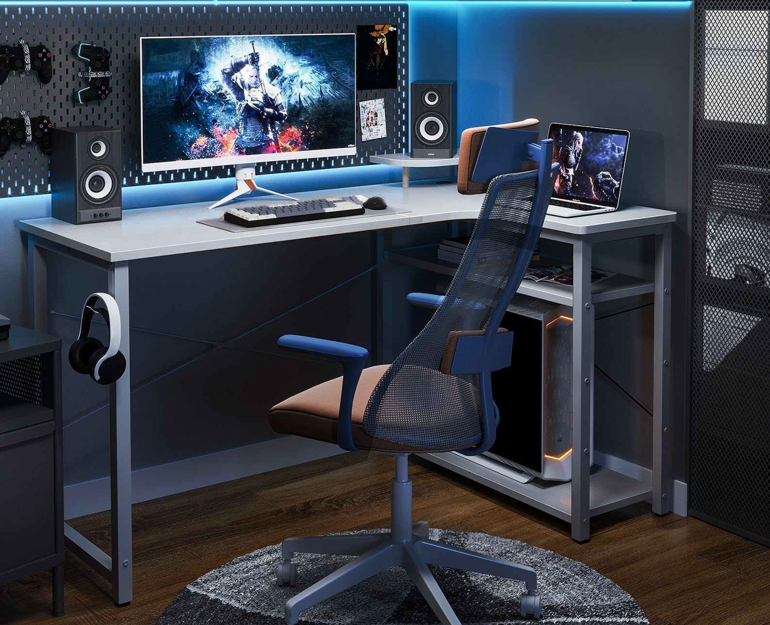 【ラック付きデスク】デスクの足元には一体型のラックが備え、本や書類などを使いたい時にサッと取り出せます。また、L字型のデザインで部屋のコーナーを最大限に活用でき、ご家庭でもオフィスでも、日常の操作に十分なスペースを確保できます。