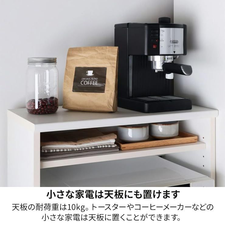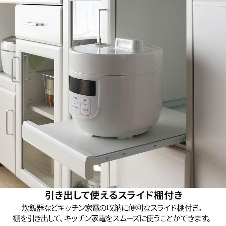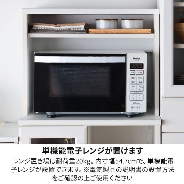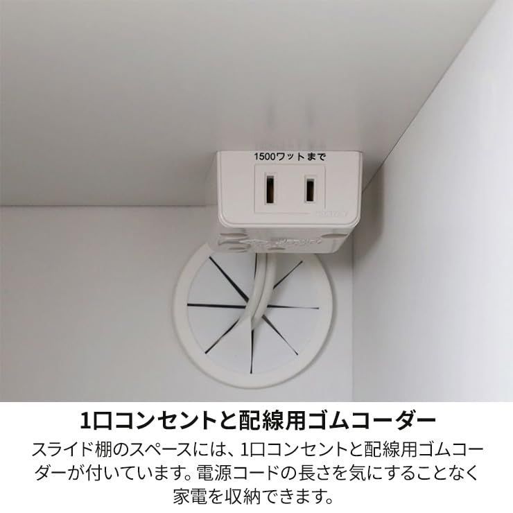 【特長】上部の天板はキッチン家電やキッチン小物の置き場として。レンジ置き場は耐荷重20kg、内寸幅54.7cm。1口コンセントと配線穴付。スライド棚は炊飯器などキッチン家電の収納に便利です。