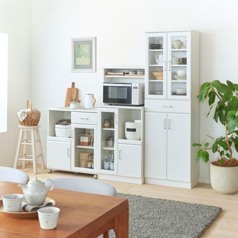 [素材・加工]【本体素材】プリント紙化粧繊維板【表面素材】プリント紙化粧繊維板【異素材】取っ手:亜鉛合金、ガラス:生3mm [耐荷重]【天板】10kg【レンジ置き場】20kg【移動棚】大7kg/小7kg【スライド棚】7kg【地板】7kg