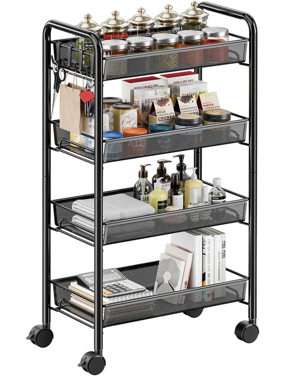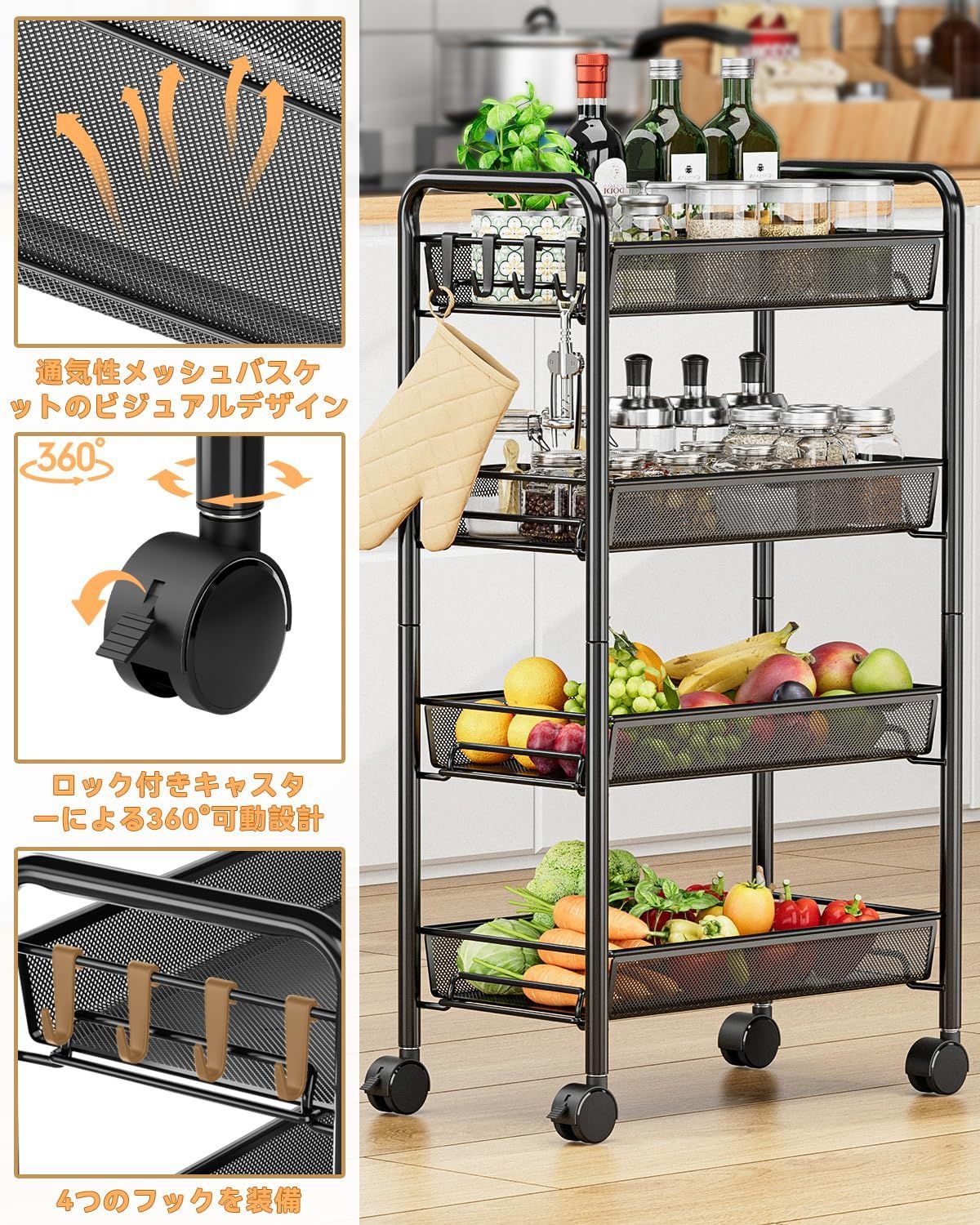 EKNITEY キッチンワゴン ワゴン キャスター付き 4段 キッチン棚 隙間収納 多機能 キッチン 洗面所 浴室用 洗濯機 幅26.5×奥行45.5×高さ84.5cm ブラック