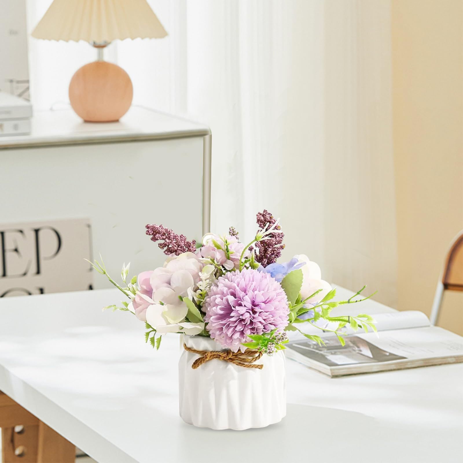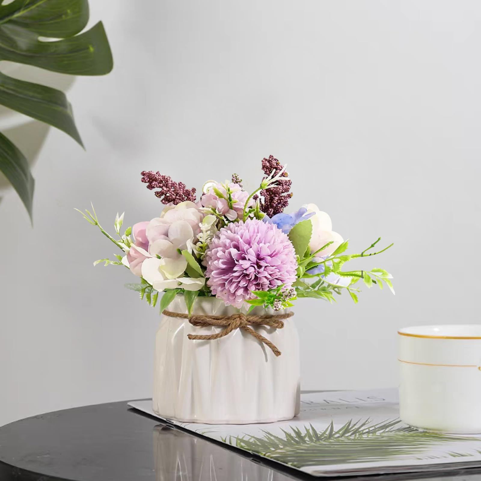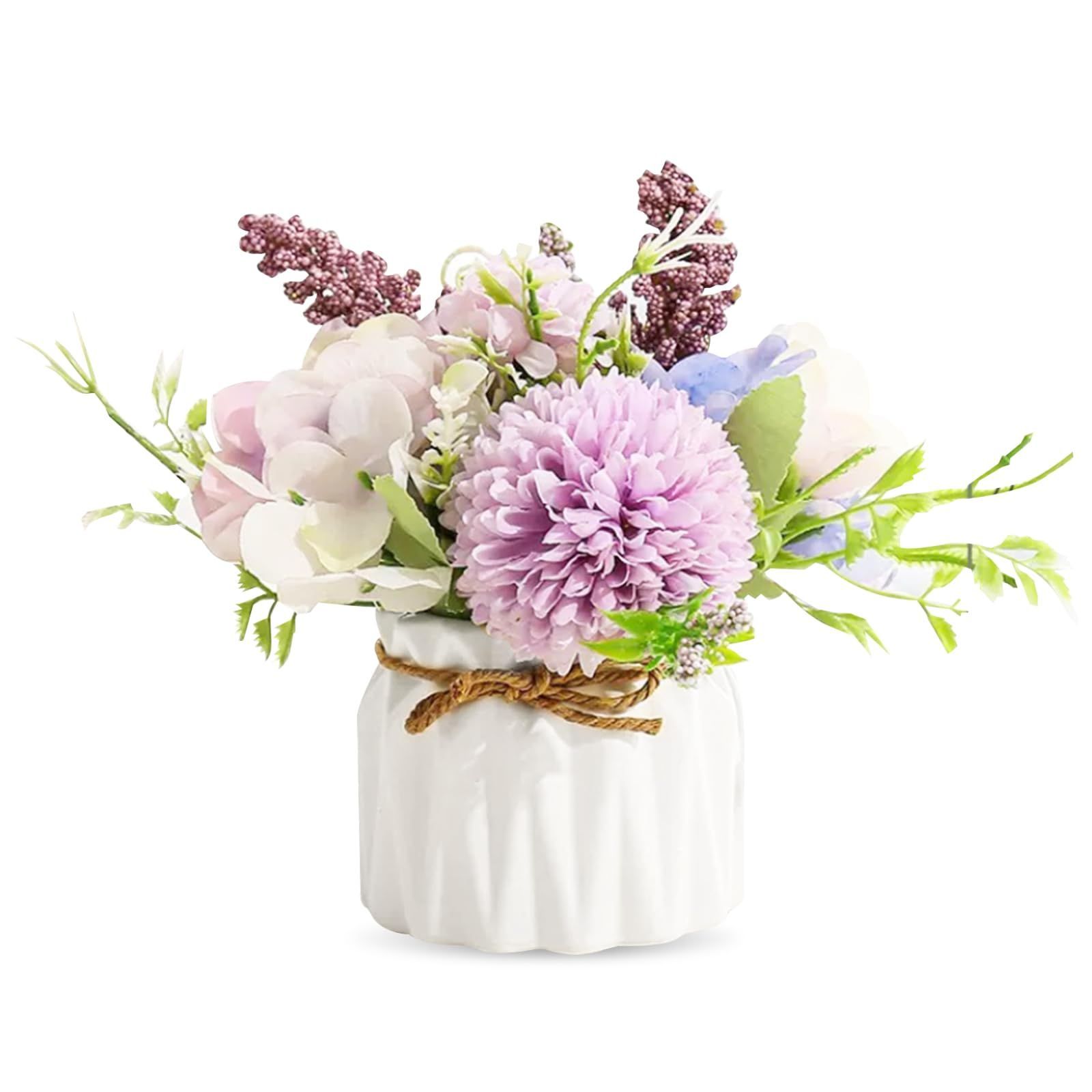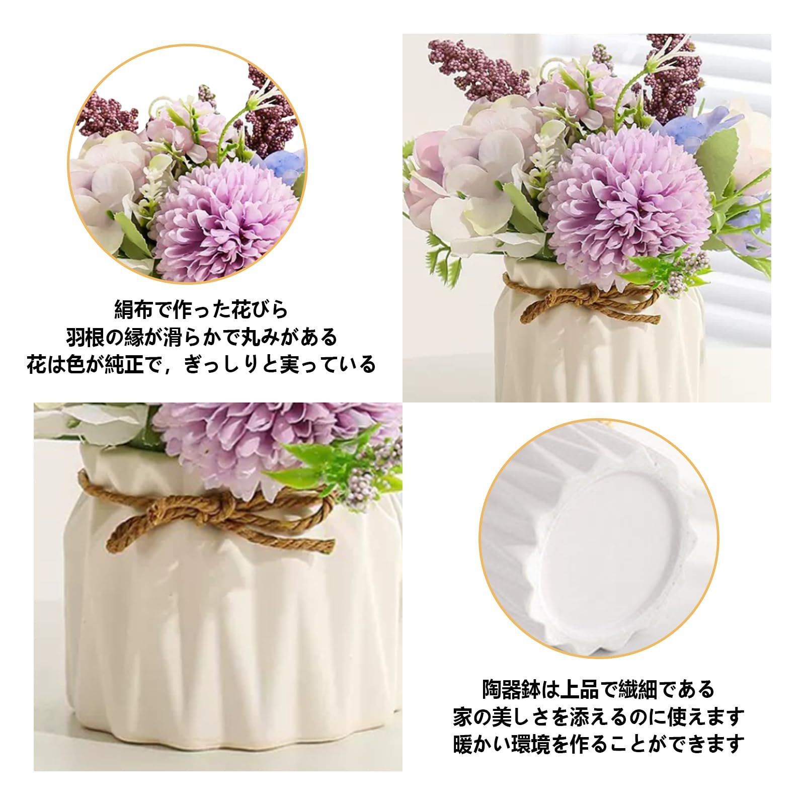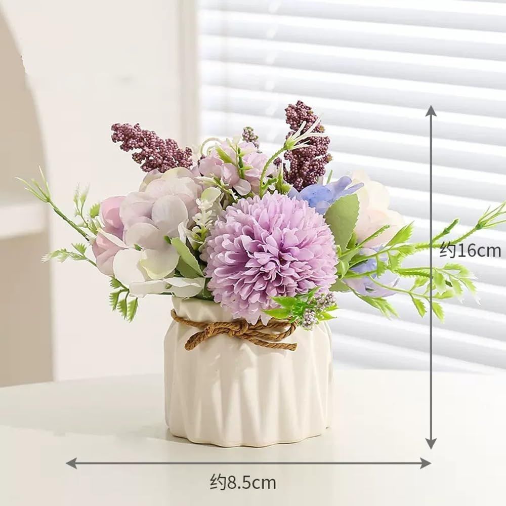 「枯れない美しさ」:淡い紫色のアジサイと他の花がバランスよく組み合わさり、白い陶器の鉢と相まって、どんな場所でも美しいアクセントになります。枯れずに長く楽しめるので、いつでもその美しさを保てます。