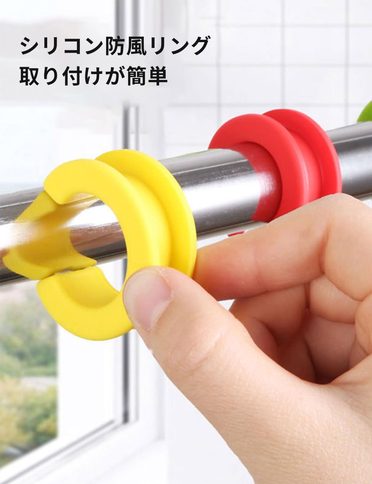 衣服のロープに取り付けてハンガーを固定して、衣服が吹き飛ばされたり押しのけられたりしないようにします。