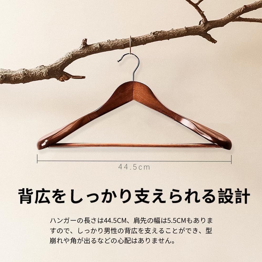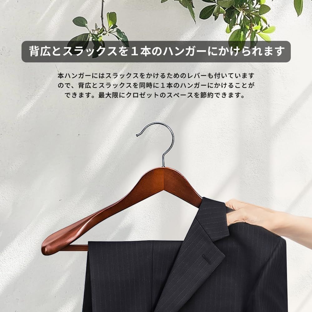 【スーツパートナー】この木製ハンガーは、ジャケット、スラックス、ネクタイを掛けることができるので、余分なスペースを取りません。肩のラインの角度は、衣服が変形しないように、人の肩に近い角度になるように設計されています。バーには滑り止めのシリコンが付いており、スラックスがハンガーから滑り落ちるのを防ぎます。