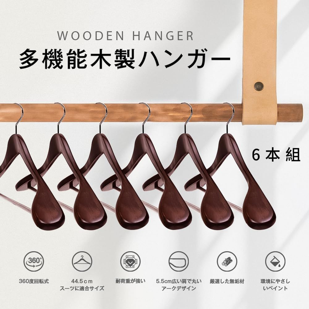 木製ハンガー 6本セット 衣類ハンガー 洋服ハンガー スーツ・ジャケット・コート用 メンズ レディース すべらない 型崩れ防止 360度回転