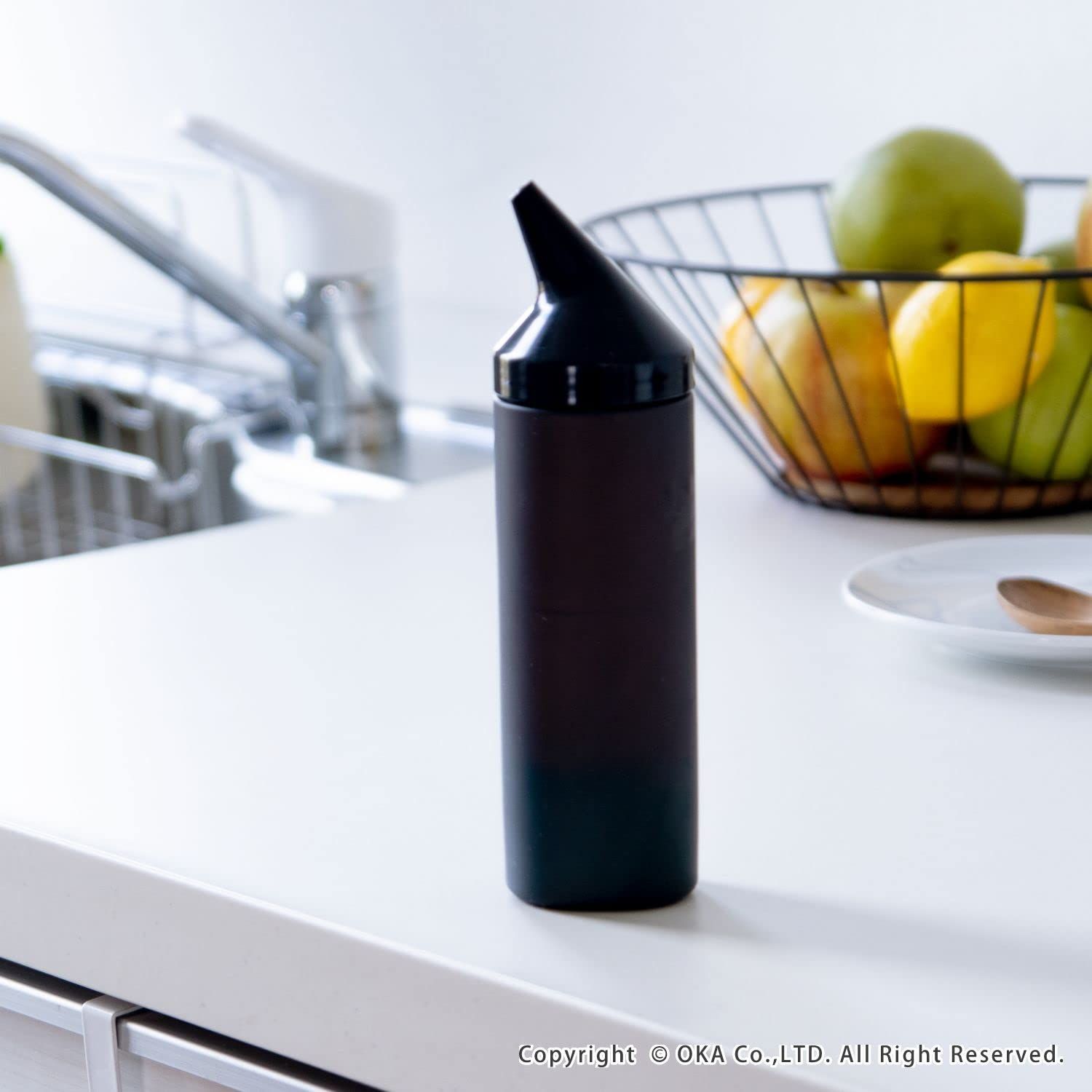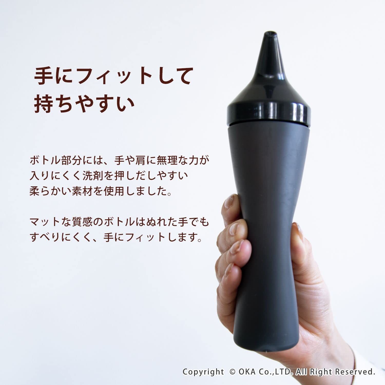 ノズルの角度と穴は無理なく傾けられ、液だれしにくいよう工夫されています。濡れた手でもすべりにくく、手にフィットするよう設計されています。