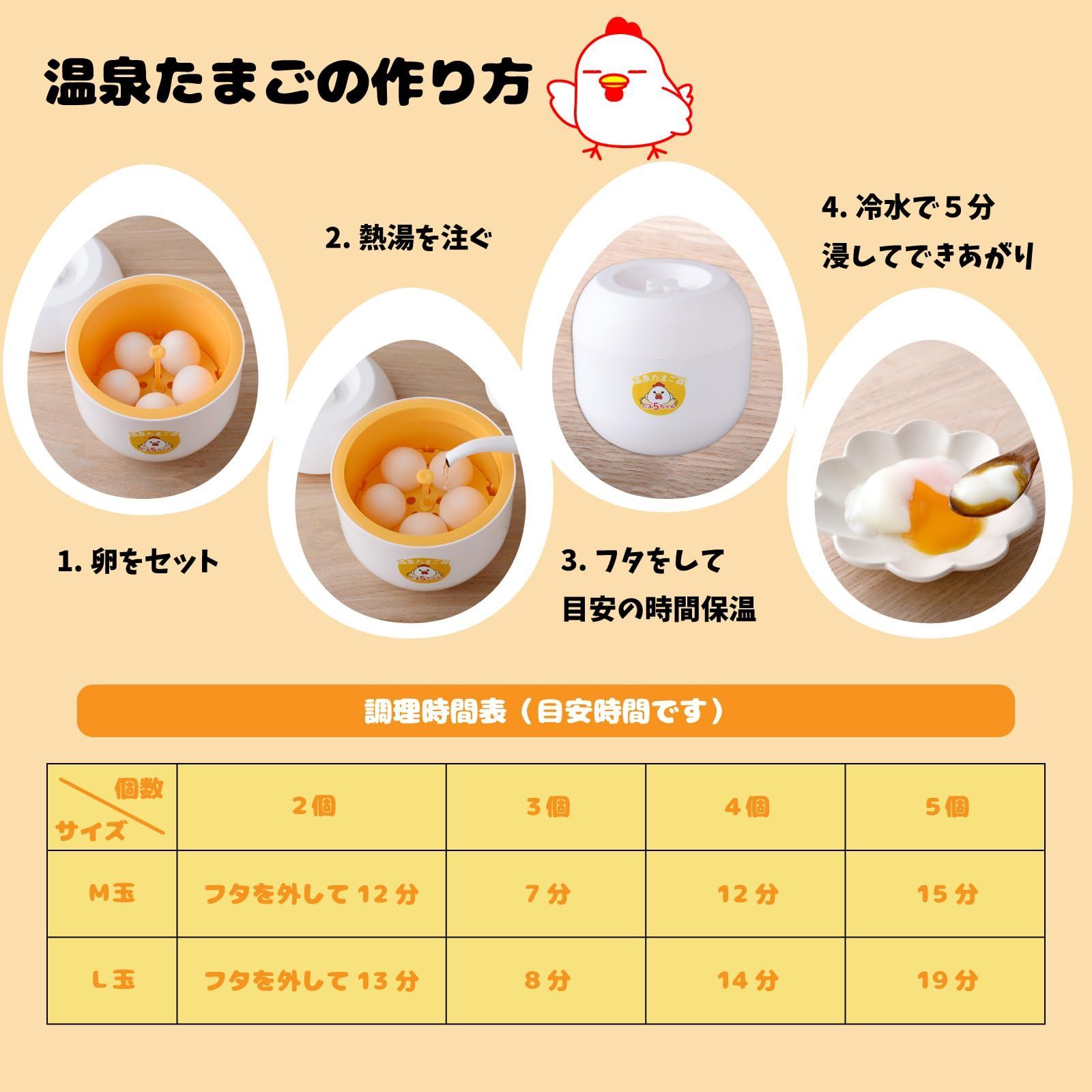 内装と外装材の間に断熱材と空気層を設け、保温・保冷効果に適した構造のため、熱湯を注ぐだけでカンタンに温泉たまごを作ることができる
