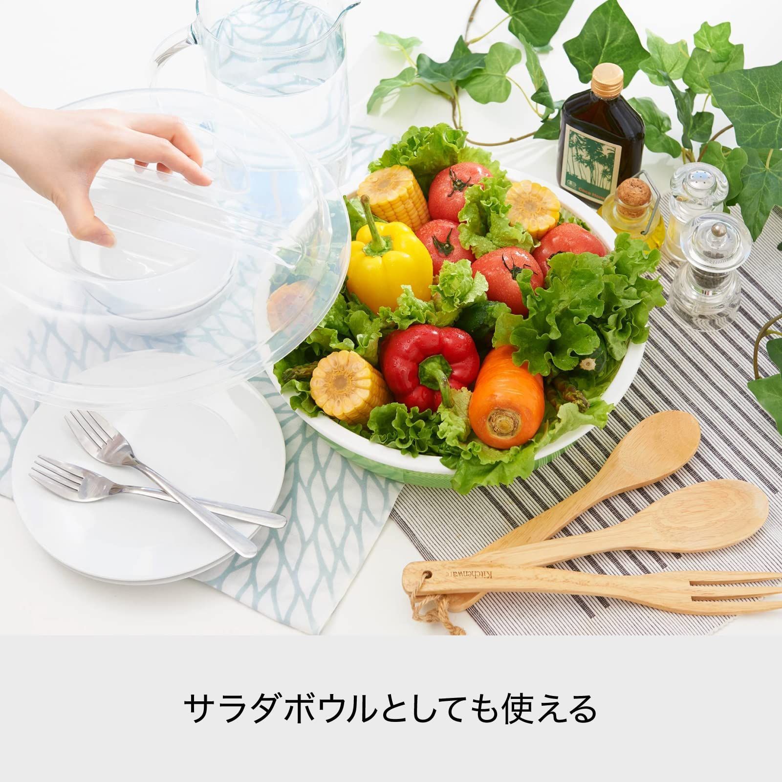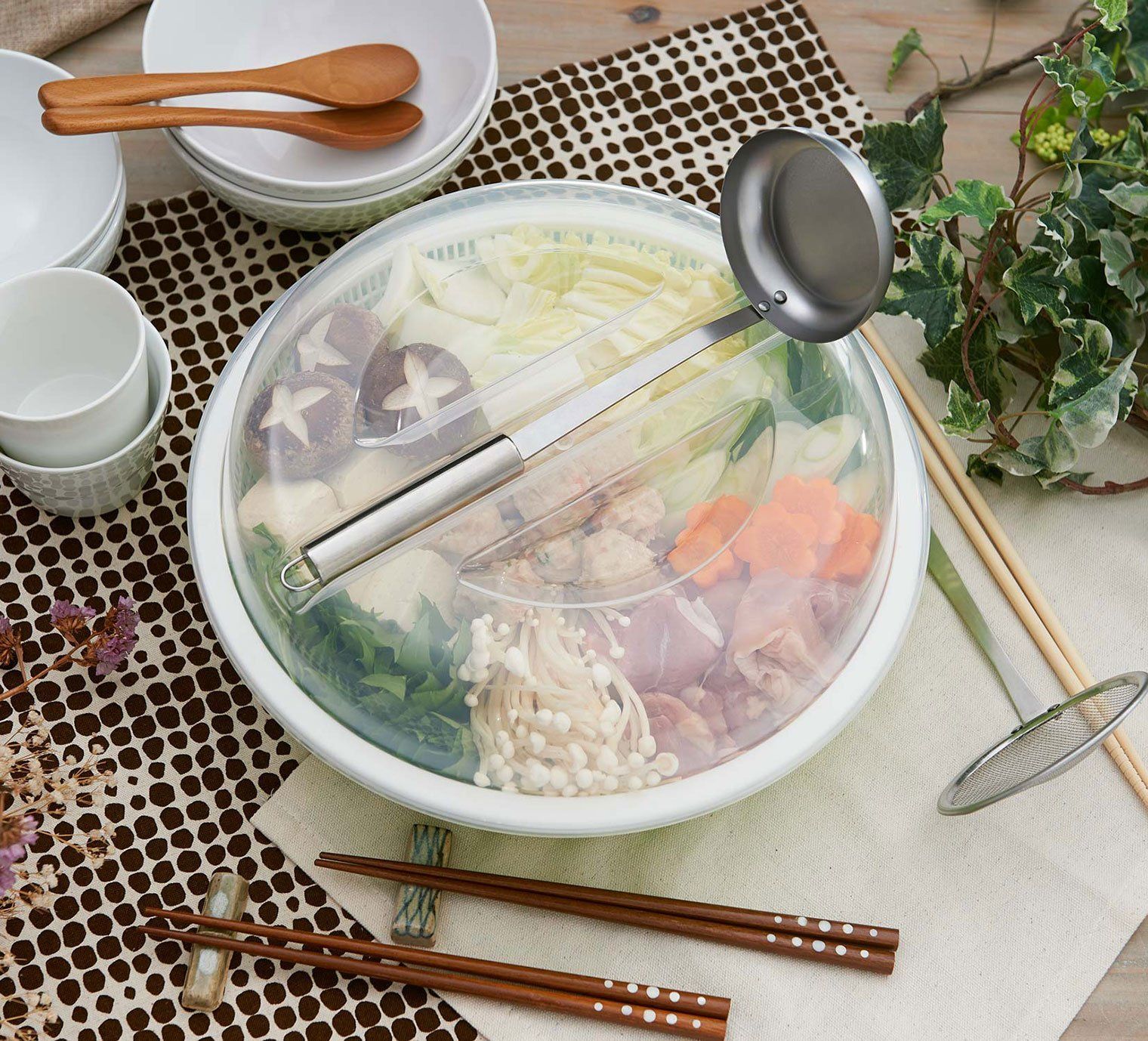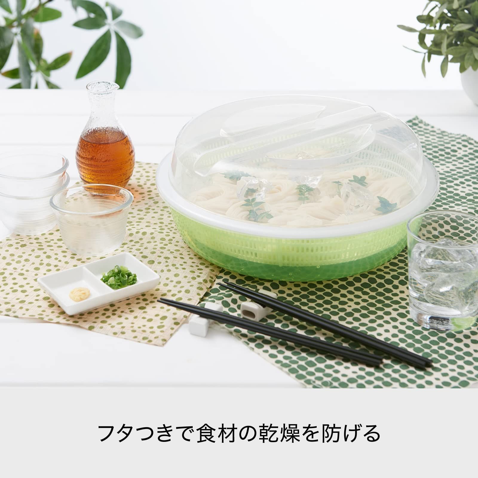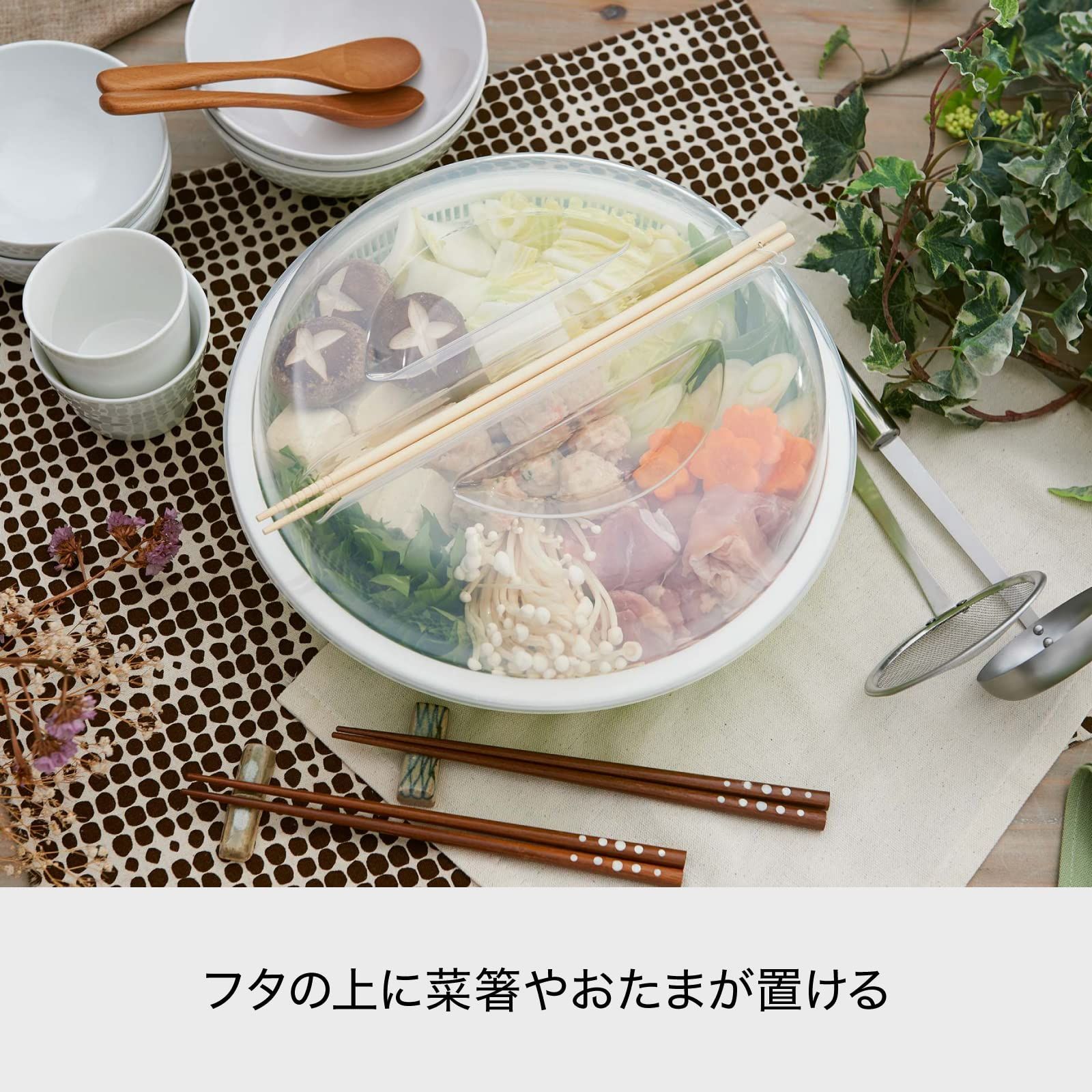 野菜などを水切りしたまま置いておけるフタ付きの水切り。 野菜を一気にザザッと洗える大きめのざる付き。容器にセットしてしっかり水切り。フタをしてそのまま冷蔵庫で一時保管もOK。 フタには菜箸やお玉などが置けるようになっているので鍋物など、卓上での使用に便利。 鍋物や素麺などのほか、バーベキューなど屋外のイベントにも。