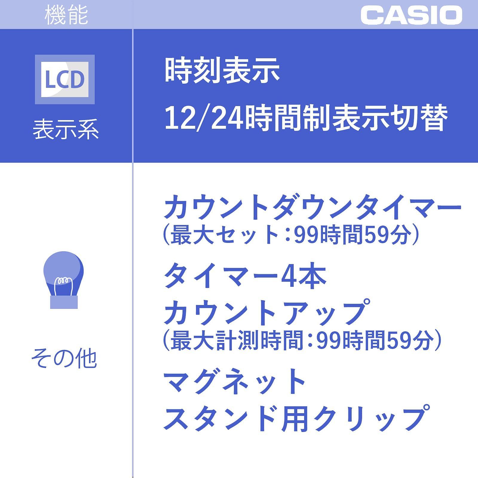 機能:カウントダウンタイマー (99時間59分59秒までセットできる)、タイマー4本、カウントアップ (99時間59分59秒まで計測できる)、時刻表示、マグネット、スタンド用クリップ、12/24時間制表示切替