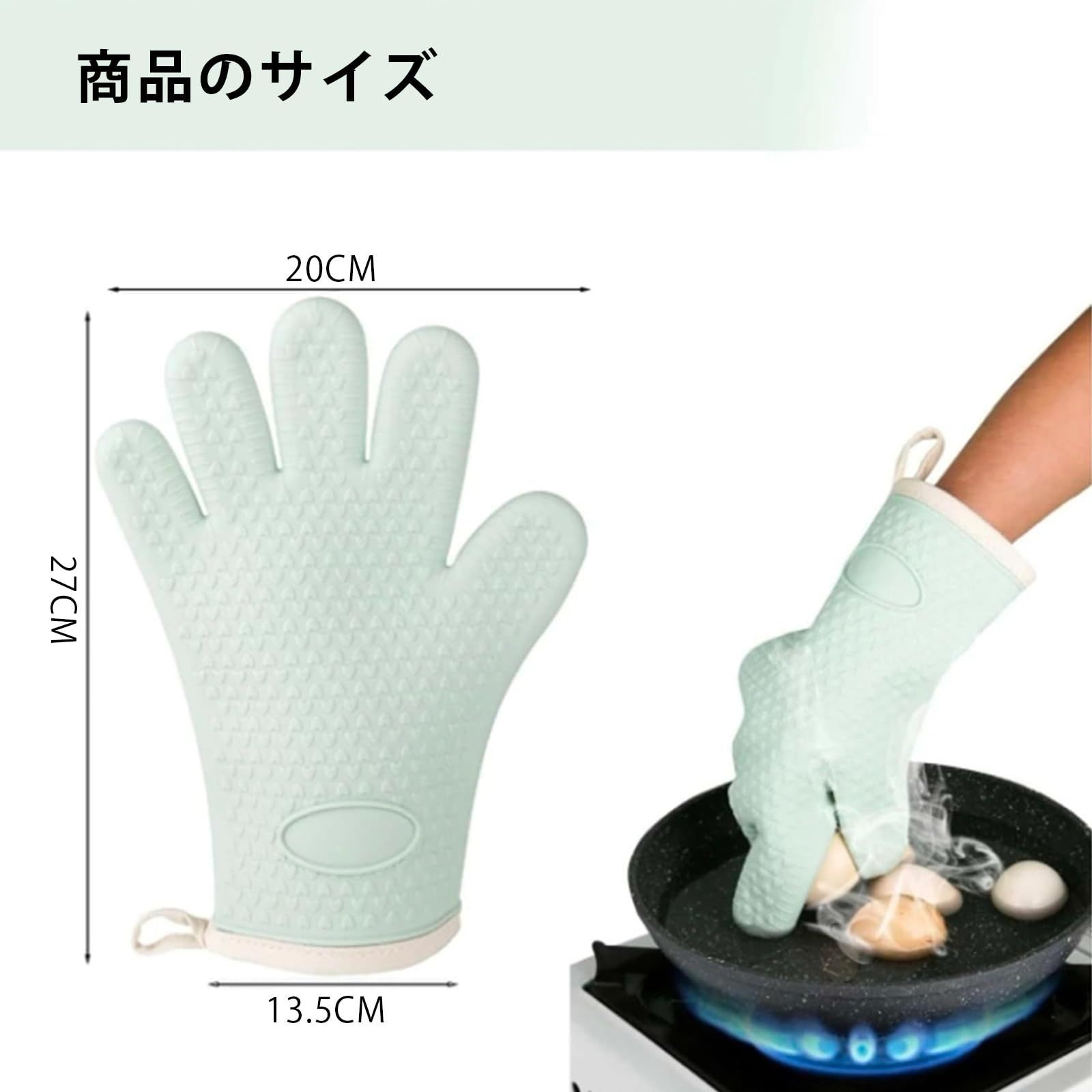 【仕様】サイズ:約28*20cm。重量:約145g1個。 耐熱温度:300℃ 5本指+3層保護シリコーン手袋は、表面に耐熱・耐水シリコーンを使用し、中間に肌触りの良い綿のインナーと断熱性のある裏地を使用しており、通常のオーブン手袋より優れた性能を発揮します。