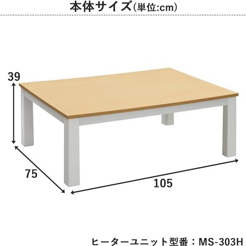 【商品仕様】商品サイズ:本体サイズ:幅105奥行75高さ39cm、重量:17kg、ヒーターユニット型番:MS-303H、消費電力:300W、消費電力量(1時間あたり):強約160wh、弱約80wh、電気代目安(1時間あたり):強約5円、弱約2.5円(1kWhあたり31円として計算)、コード:電源スイッチ付き(2PL)丸打ちコードタイプ 3m、保証期間(ヒーター部):お買い上げ日より1年間(保証の範囲については、保証書をご確認ください。(一般家庭用以外(業務用など)に使用された場合の故障及び損傷などは保証対象外となります))