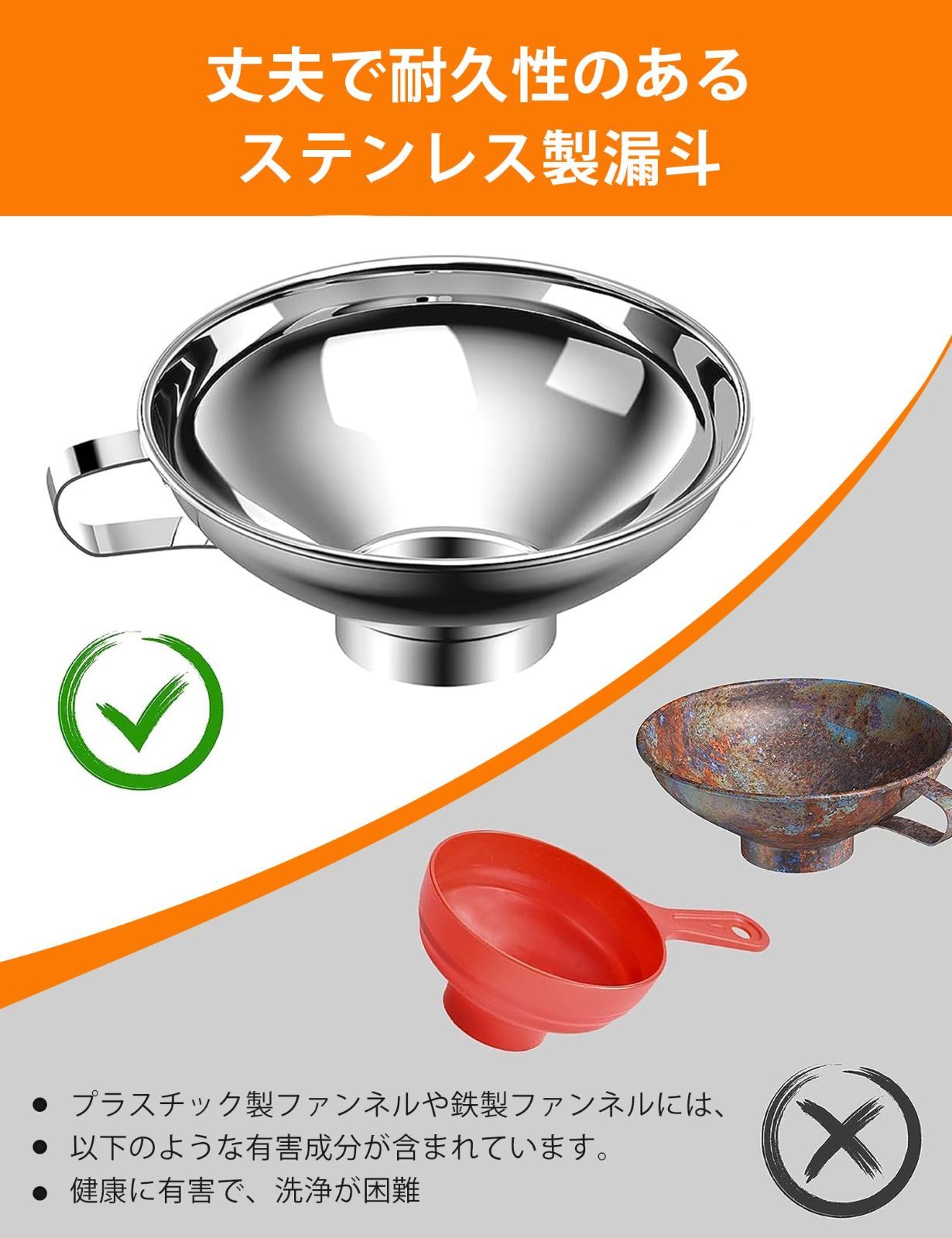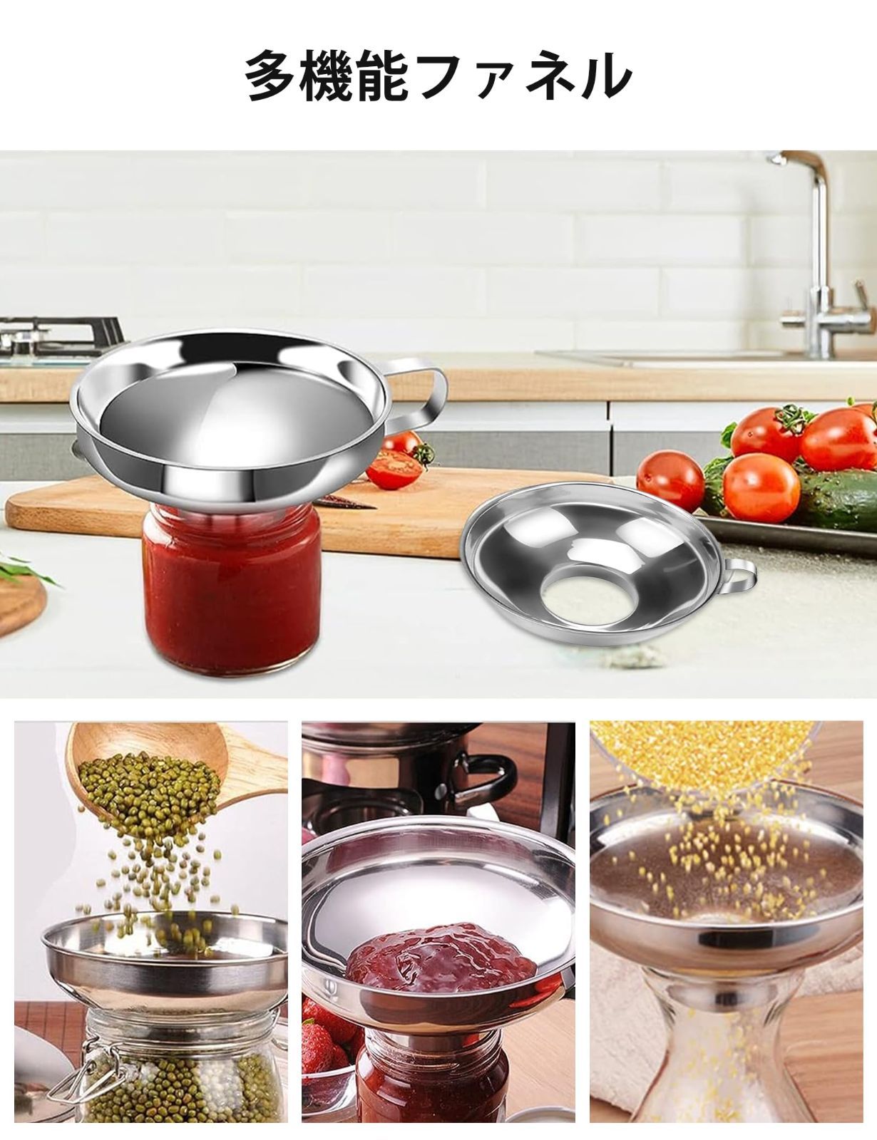 【商品の特徴】注ぎ口が大きいので、ジャム、穀物、シリアルなどの固形物に適しています。 サイズ2パックでニーズに対応この食品安全金属漏斗は、自家製ジャム、ジュース、ビネガー、オイルなどをデカントするのに理想的です。