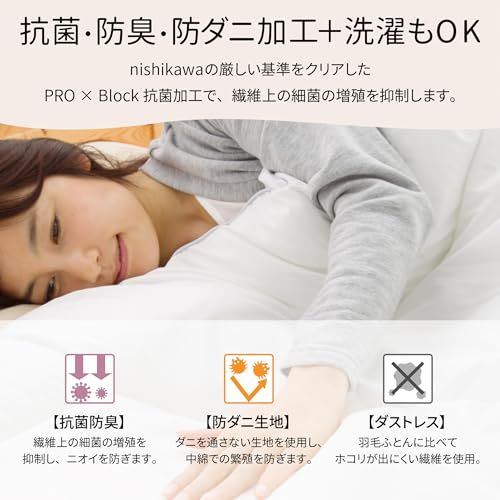 側地にはダニを通さない生地を使用・抗菌防臭加工済み。また、ご家庭でお洗濯できるので清潔にお使いいただけます。お洗濯しても中身のわたが片寄りにくく、快適にお使いいただけます。
