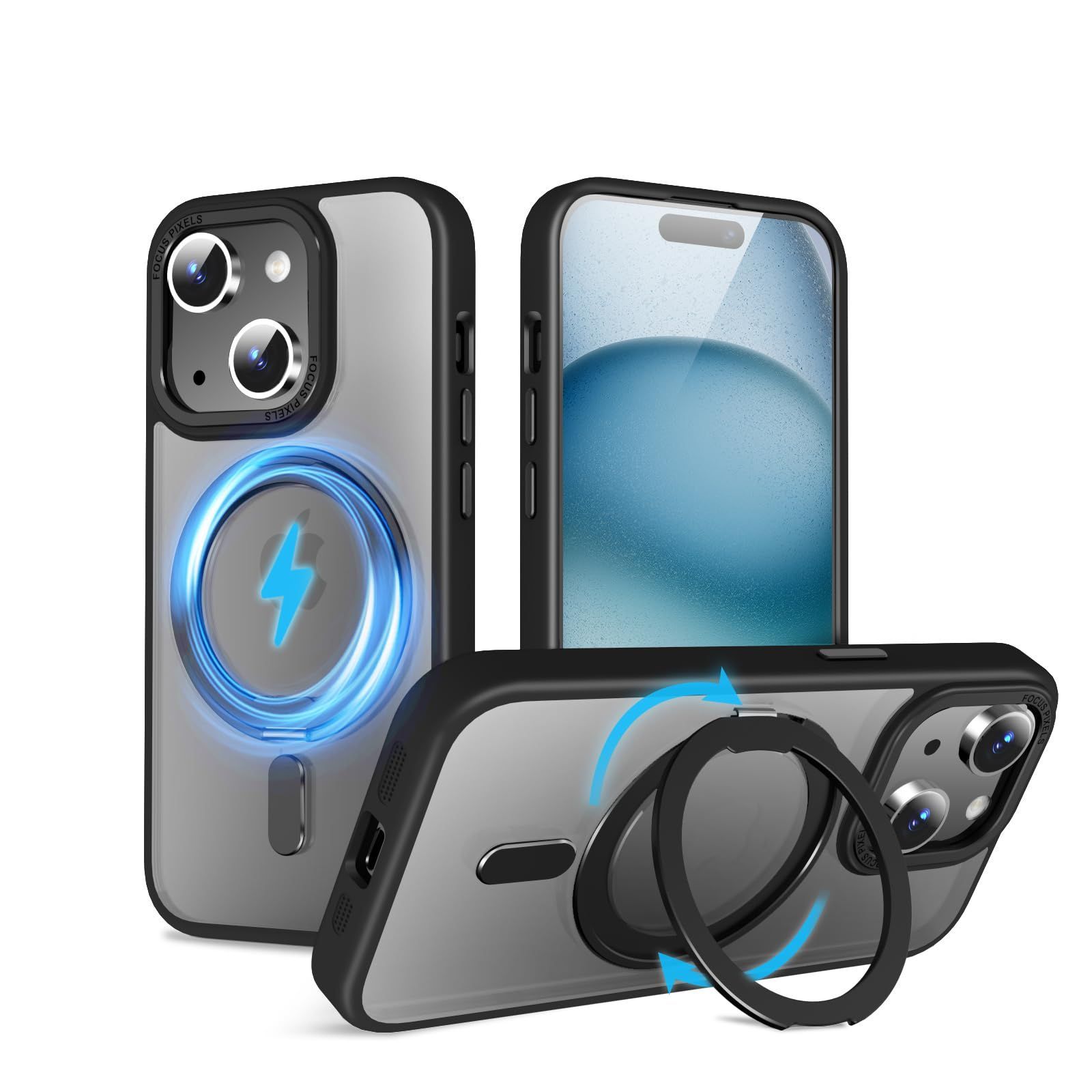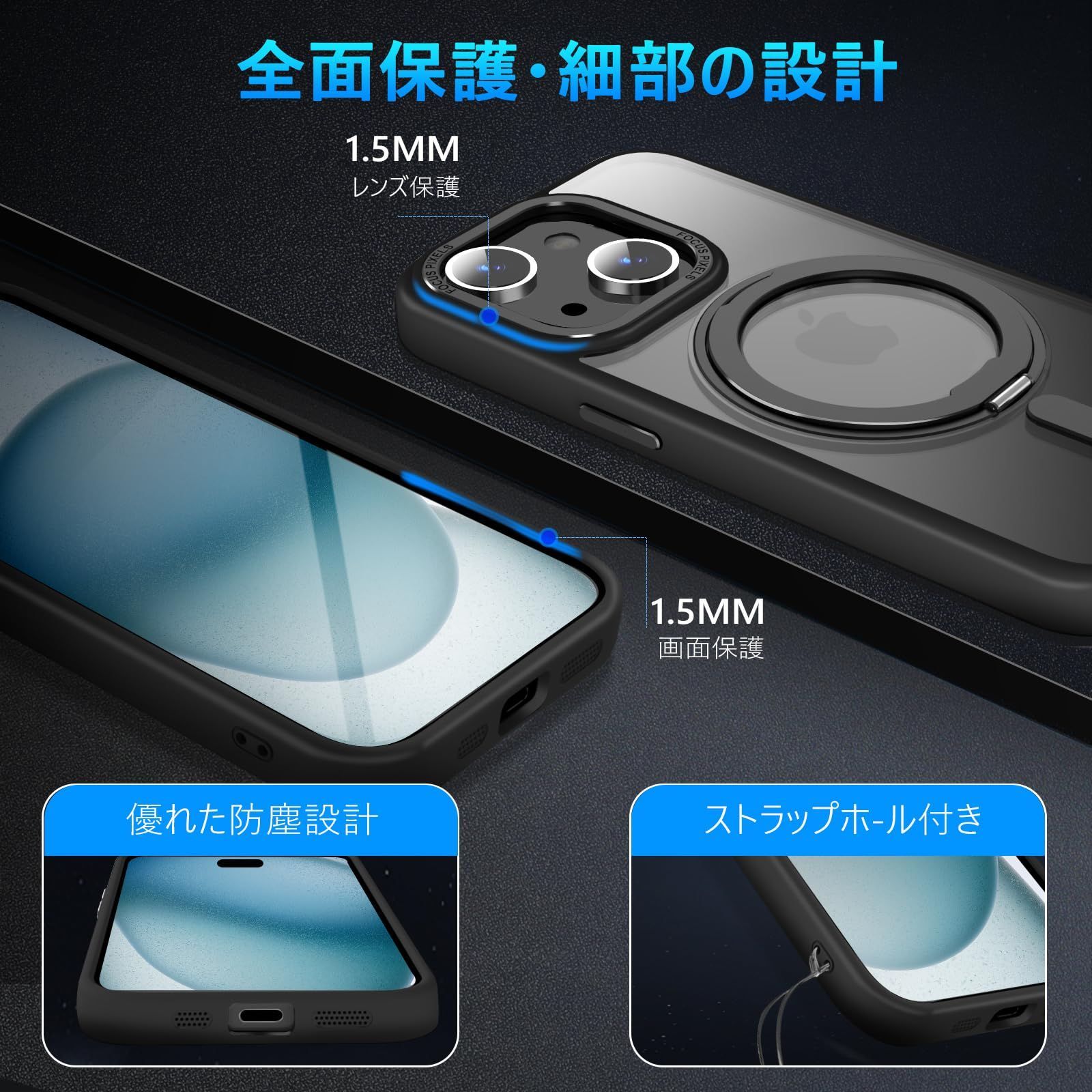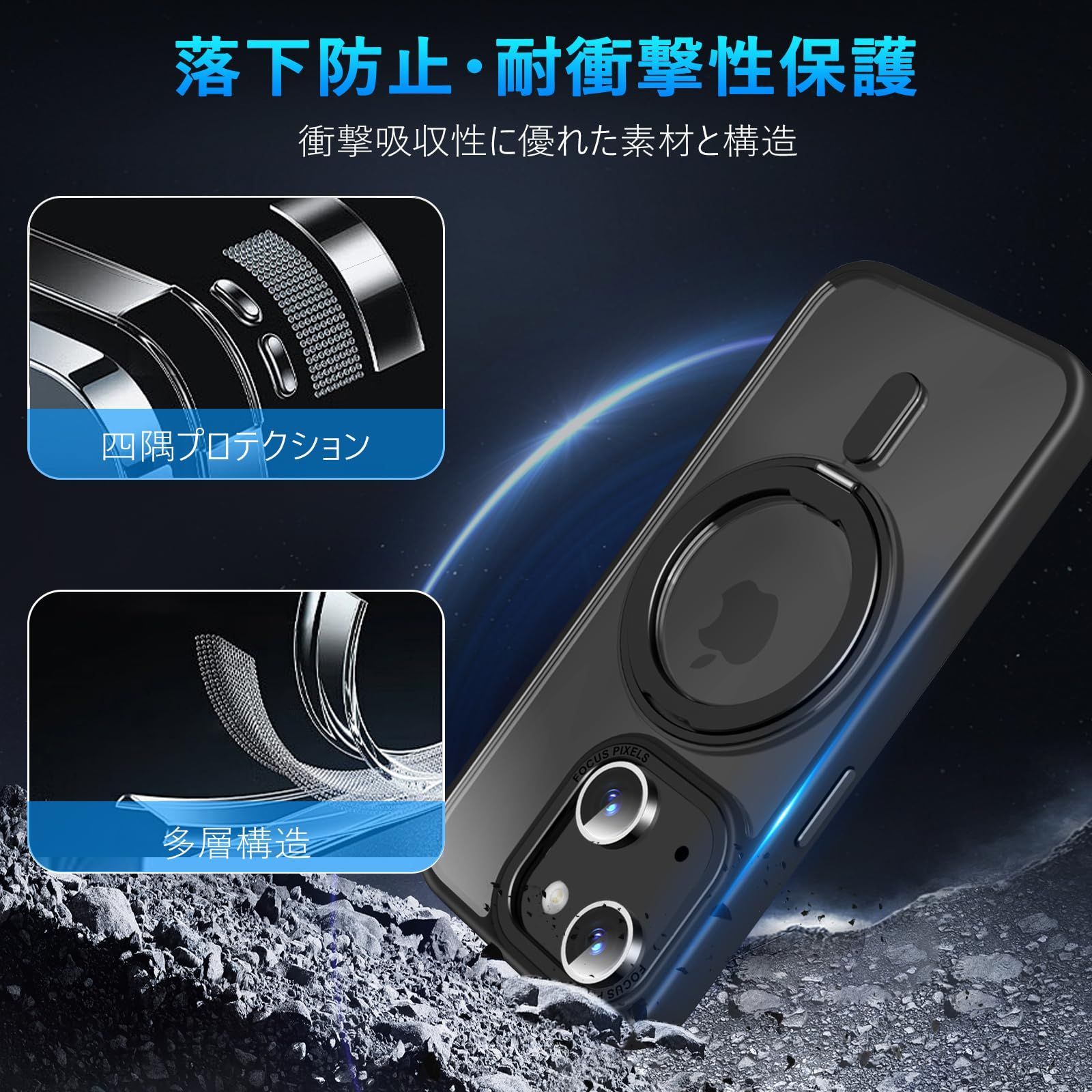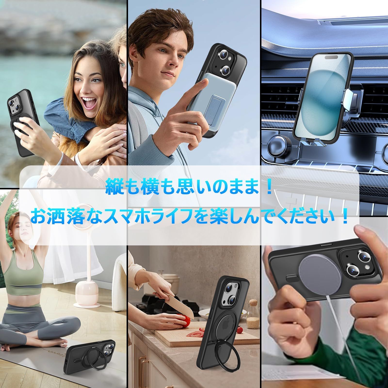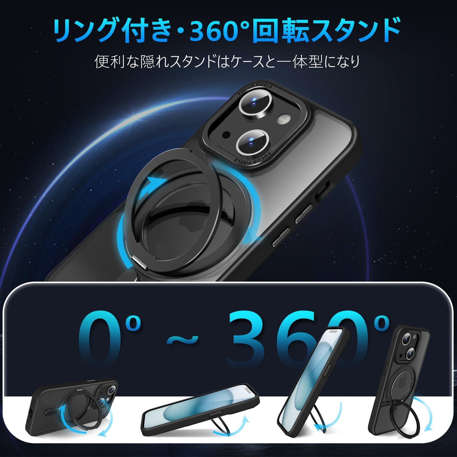 QUEASON【iPhone 15 用 MagSafe対応 ケース】360°回転スタンド ワイヤレス充電対応 あいふおん15 用 ケース リング付き 米軍MIL規格 スマホケース iphone 15 用 magsafe 超強磁力 落下防止 あいふおん15 用 スマホケース 耐衝撃 半透明 防指紋(ブラック)