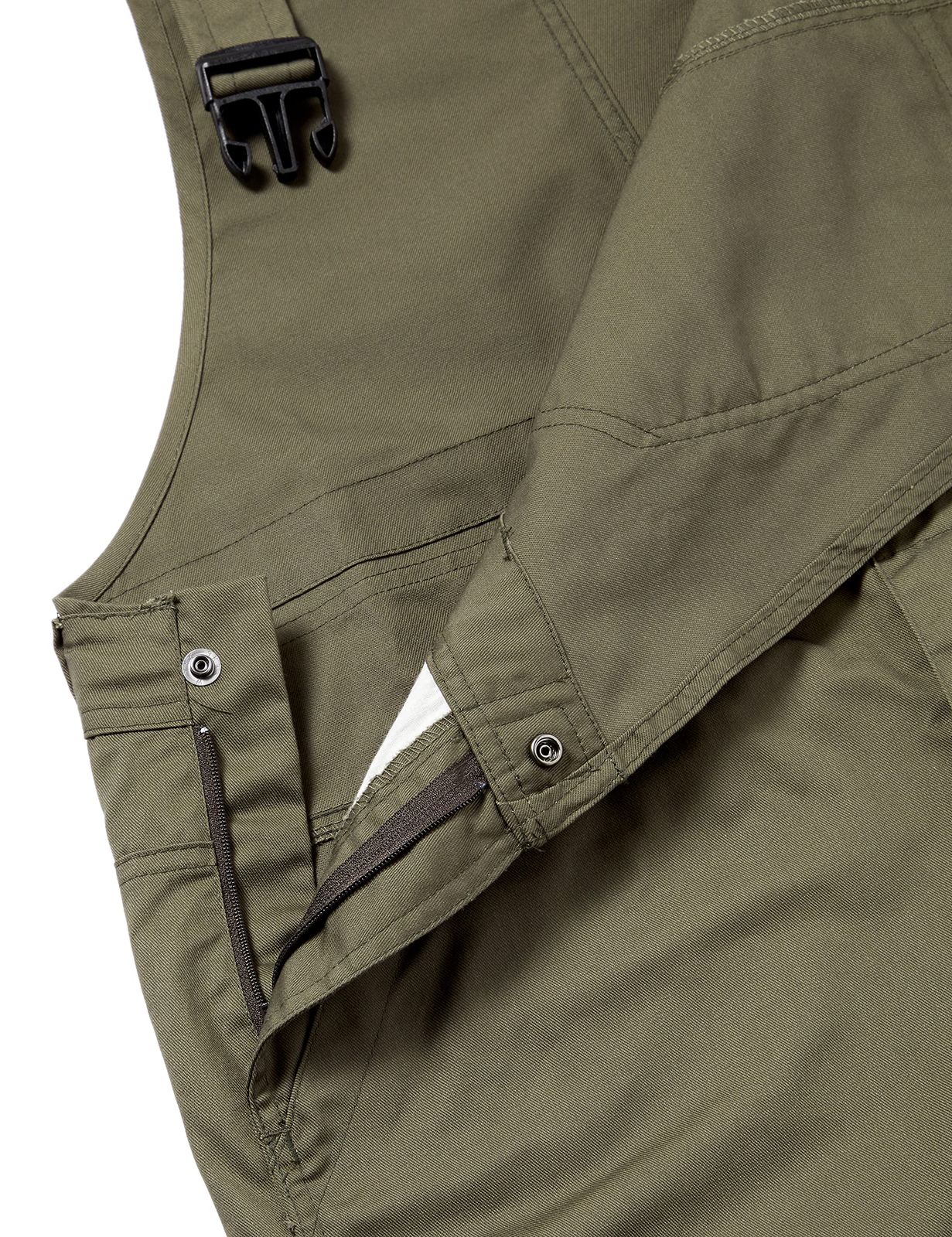 □腰回りと胸当てに金具が表面に出てない仕様、ハードな現場作業にも対応できるサロペット
