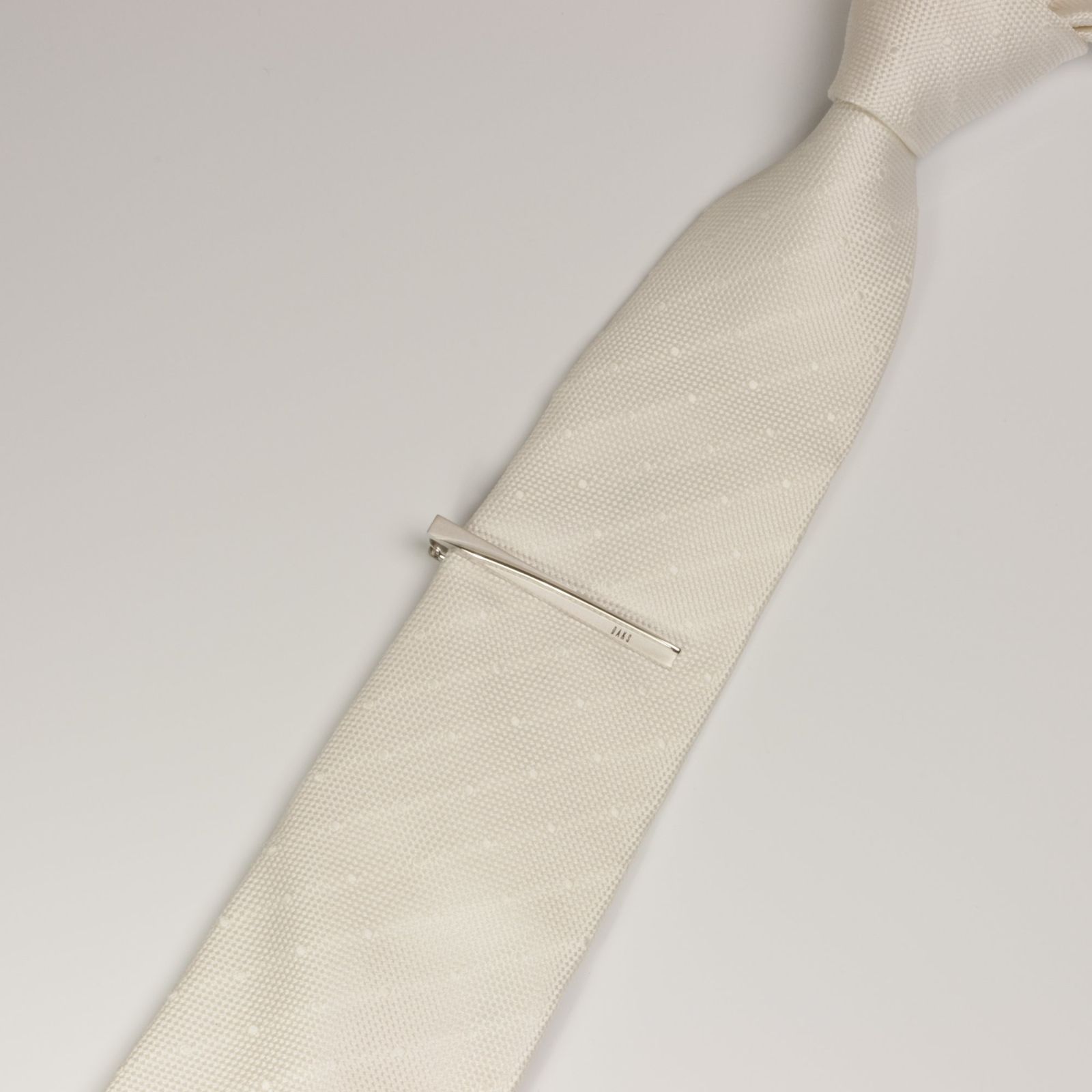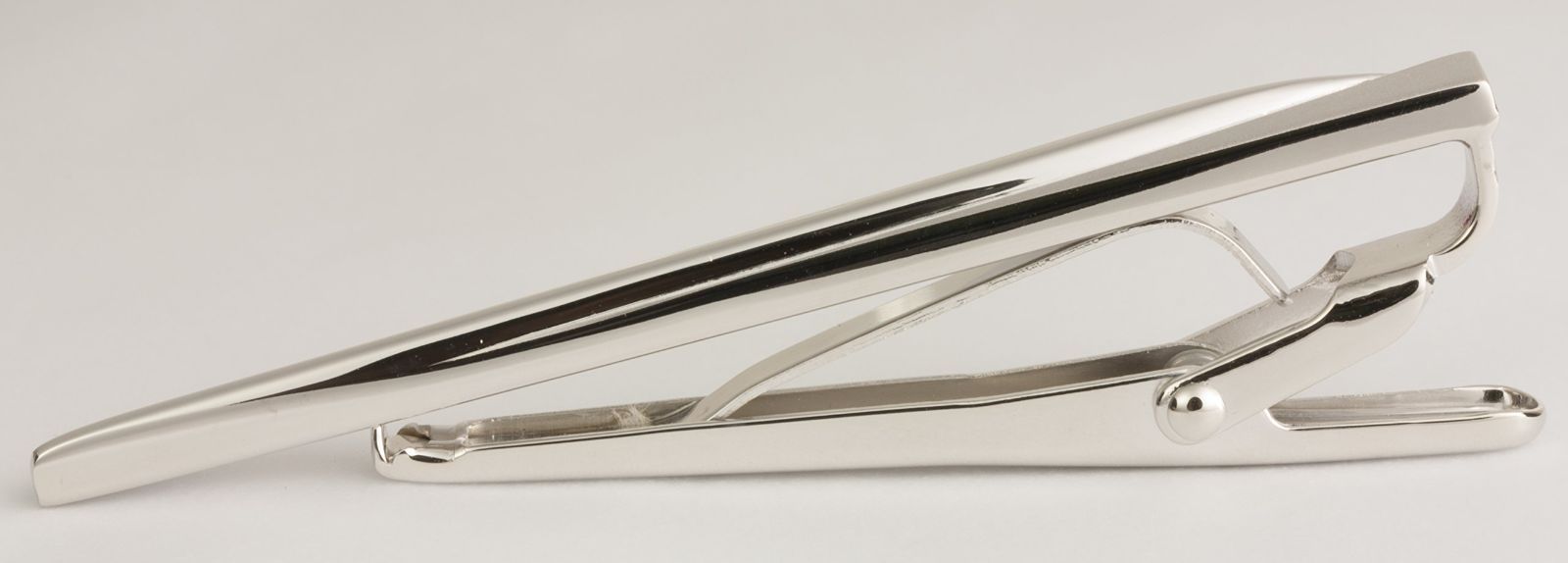 ワニ口式で内蔵しているバネのチカラでネクタイを挟む方式です。着脱が容易で、オススメの構造です。ネクタイピンは指輪やネックレスと違って、ファッション性と機能性を兼ね備えたアクセサリーです。胸元を飾るのはもちろん、ネクタイの揺れや乱れを防ぐことも重要な役割になります。そのために、シャツとネクタイの2枚(大剣と小剣)の合計3枚を、はさんで付けます。基本的には上着の第一ボタンの少し上に装着するのがスタンダードです。