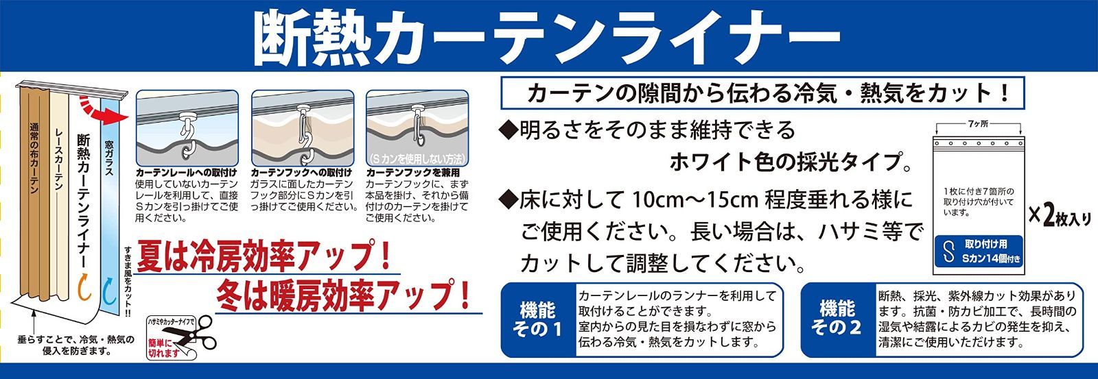 ■窓から伝わる冷気・熱気をカット 窓から伝わる冷気や熱気をカットするので、お部屋の冷暖房効率を上げることができます。季節を問わず年中使えるので、省エネ効果も期待ができます。■安心の抗菌・防カビ・UVカット加工 抗菌・防カビ加工を処理しているので、いつでも安心です。またUVカット加工も処理されているので、家具や床の日焼けを防ぎます。■カーテンレールに取り付けるだけでOK 既にご使用されているカーテンレールを使って取り付けるだけでOKなので、すぐにご使用いただけます。■約10~15cm程度、床に垂らしてご使用ください。