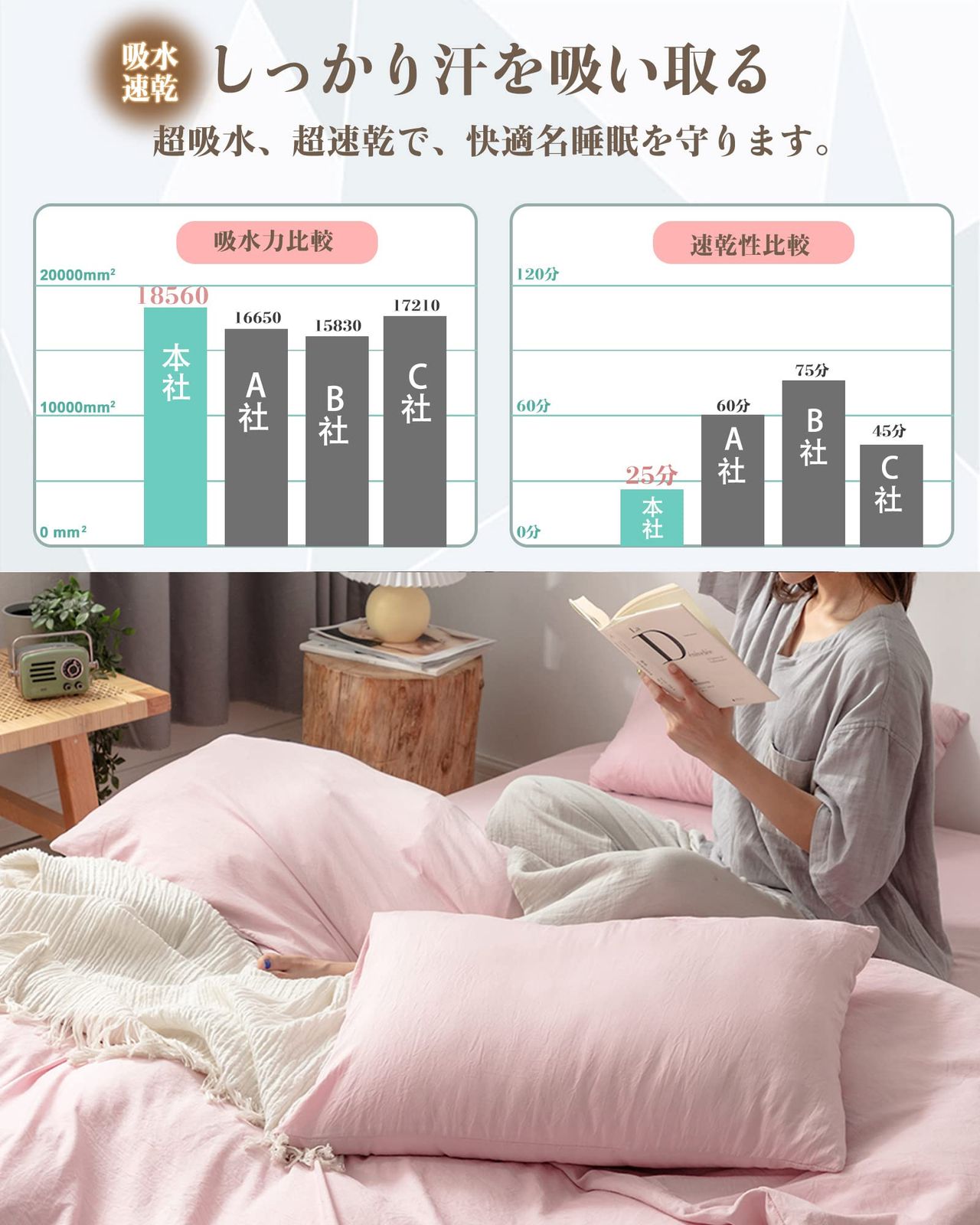 【吸水速乾 & 0秒吸水】かけ布団カバーは吸水速乾機能で汗をかいてもすぐに吸い取り、すぐに乾きます。サラッとした肌触りでベタつきません。快適に眠ることができます。乾きやすく、シワになりにくい素材なので気軽に洗っていつでも清潔にお使いいただけます。