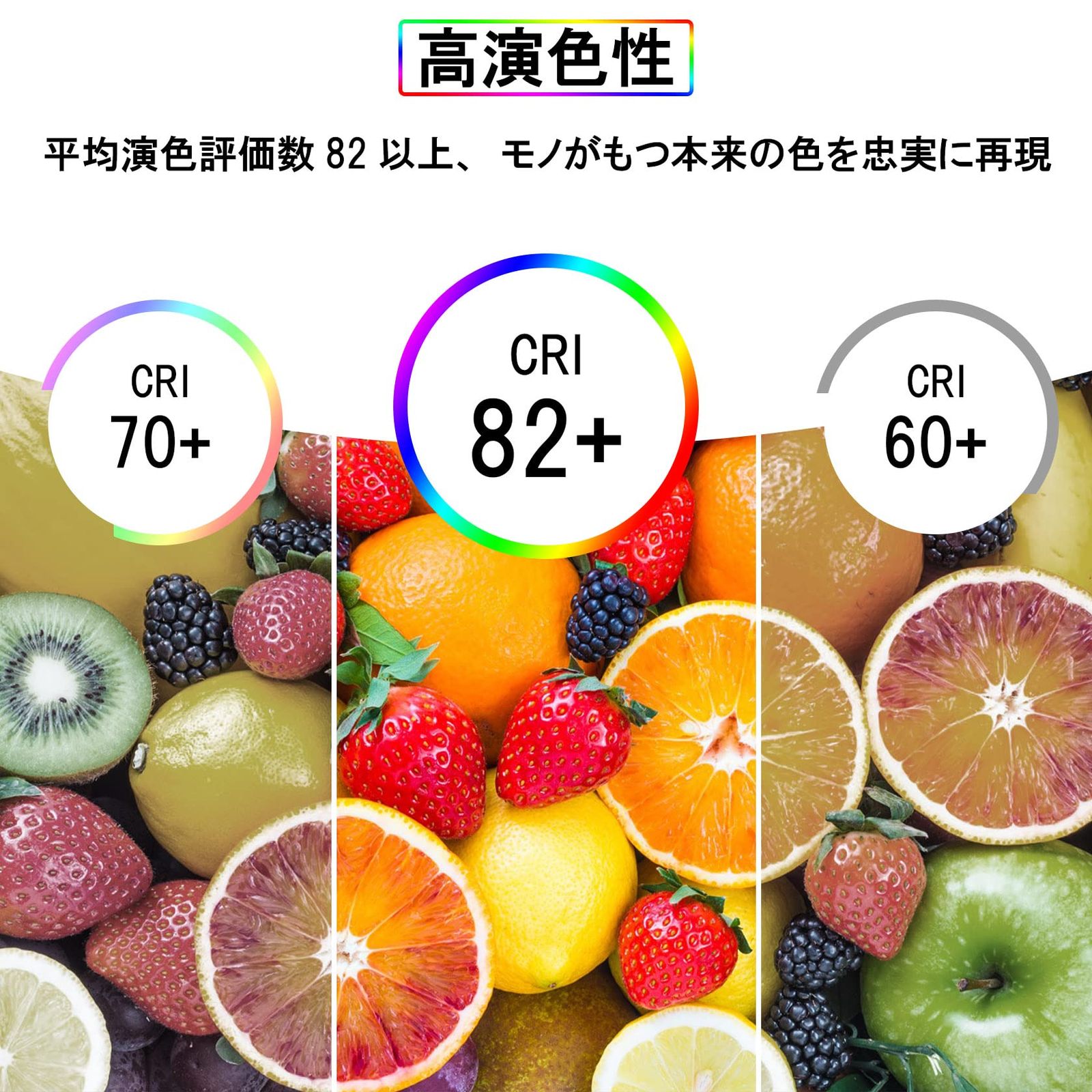 【あざやか・広配光】白熱電球に近い光の広がりで、リビングをはじめさまざまな場所や照明器具にすすめます。食事は美味しそうに、肌は自然に見える高い演色性(Ra82)を持ちます。広範囲(220°)を明るく均等に照らします。