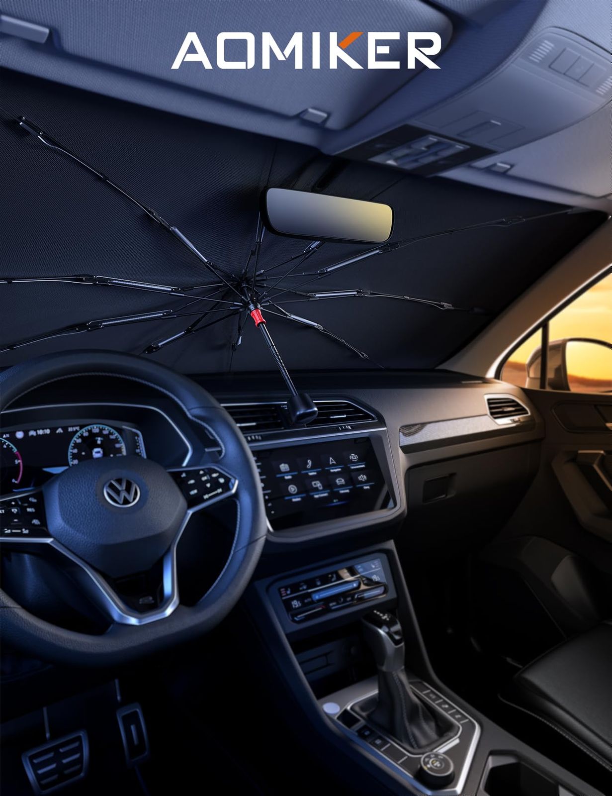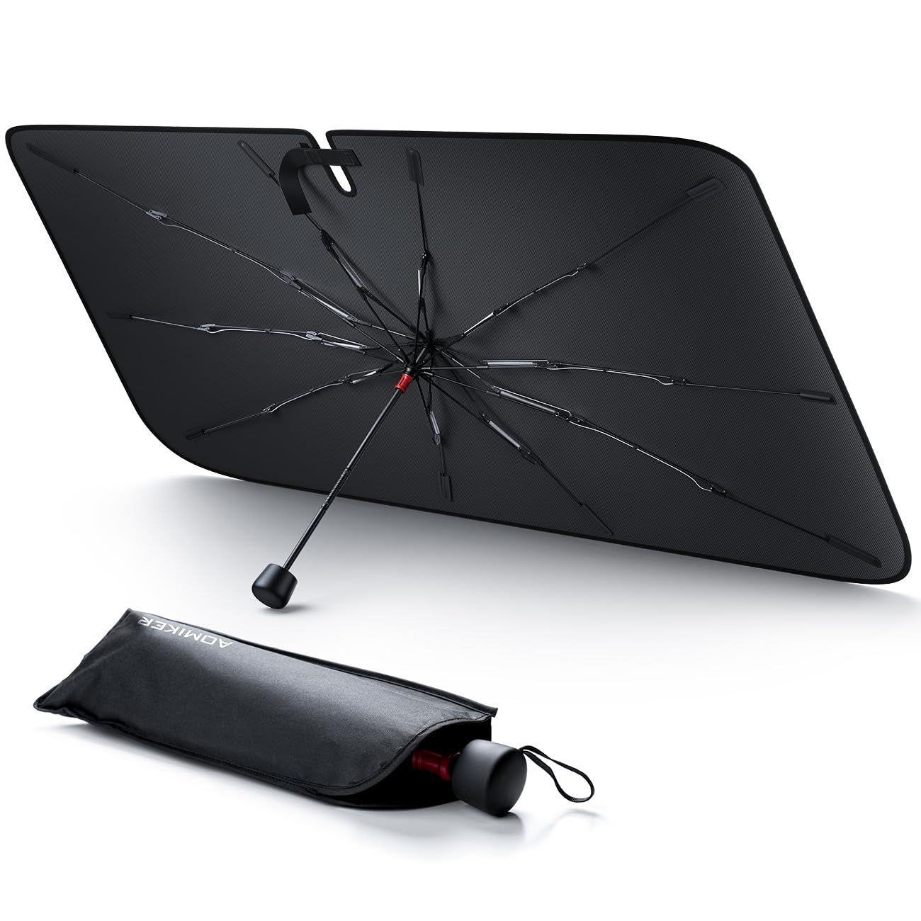 【強化十本骨】Aomiker 傘型 車 サンシェード フロント: 車 日除け カーシェード 傘式 フロント サンシェード 断熱 日傘 遮光 遮熱 uvカット ガラス繊維製傘骨 紫外線遮蔽 擦り傷防止 暑さ対策 頑丈 収納ポーチ付き(125*65CM)